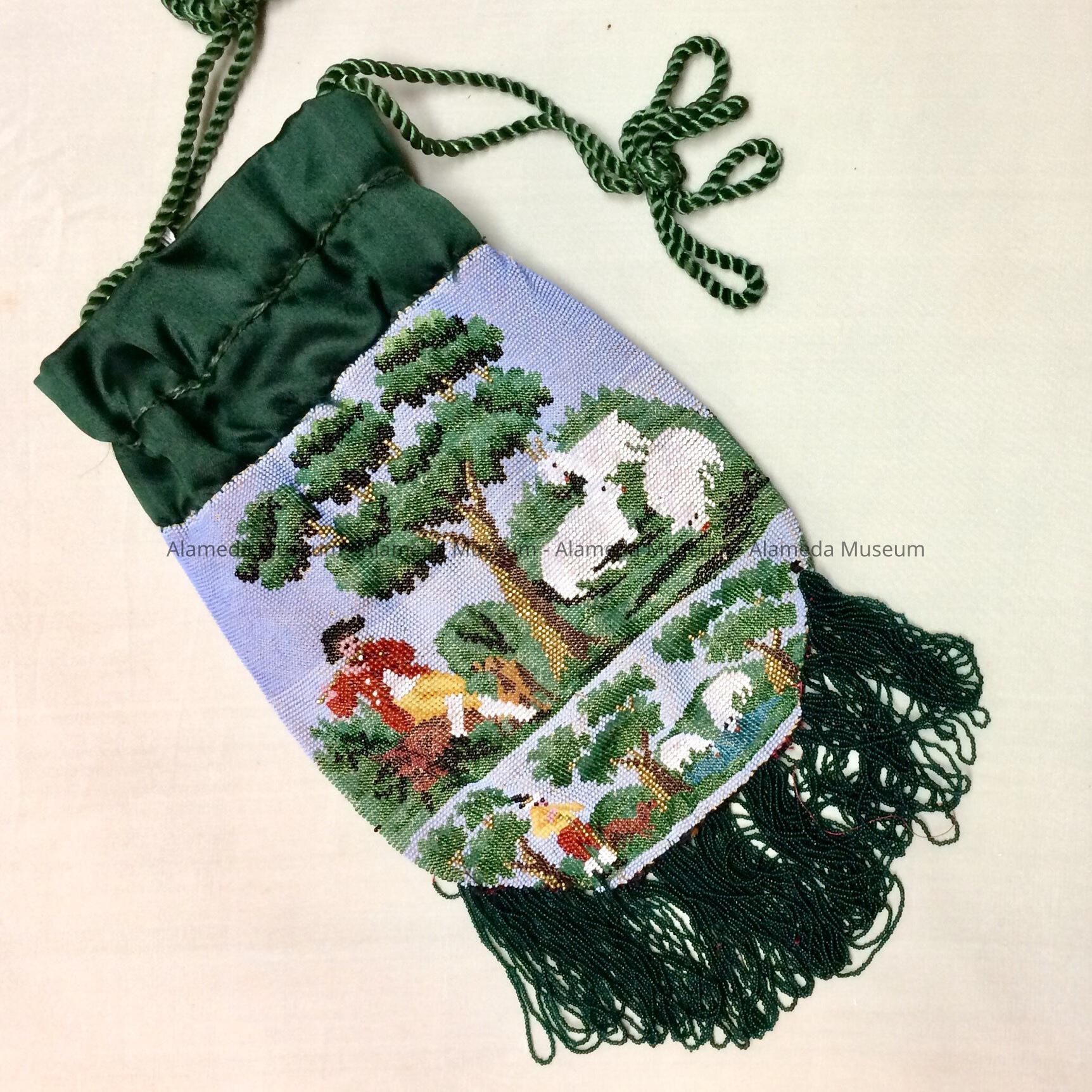 Drawstring purse c. silk opening | woven cord ties - hand beaded (glass) in scene depicting shepherd + sheep. Belonged to Mrs. Samuel M. Haslett. 1605 Clinton Ave - old time Alameda Resident.