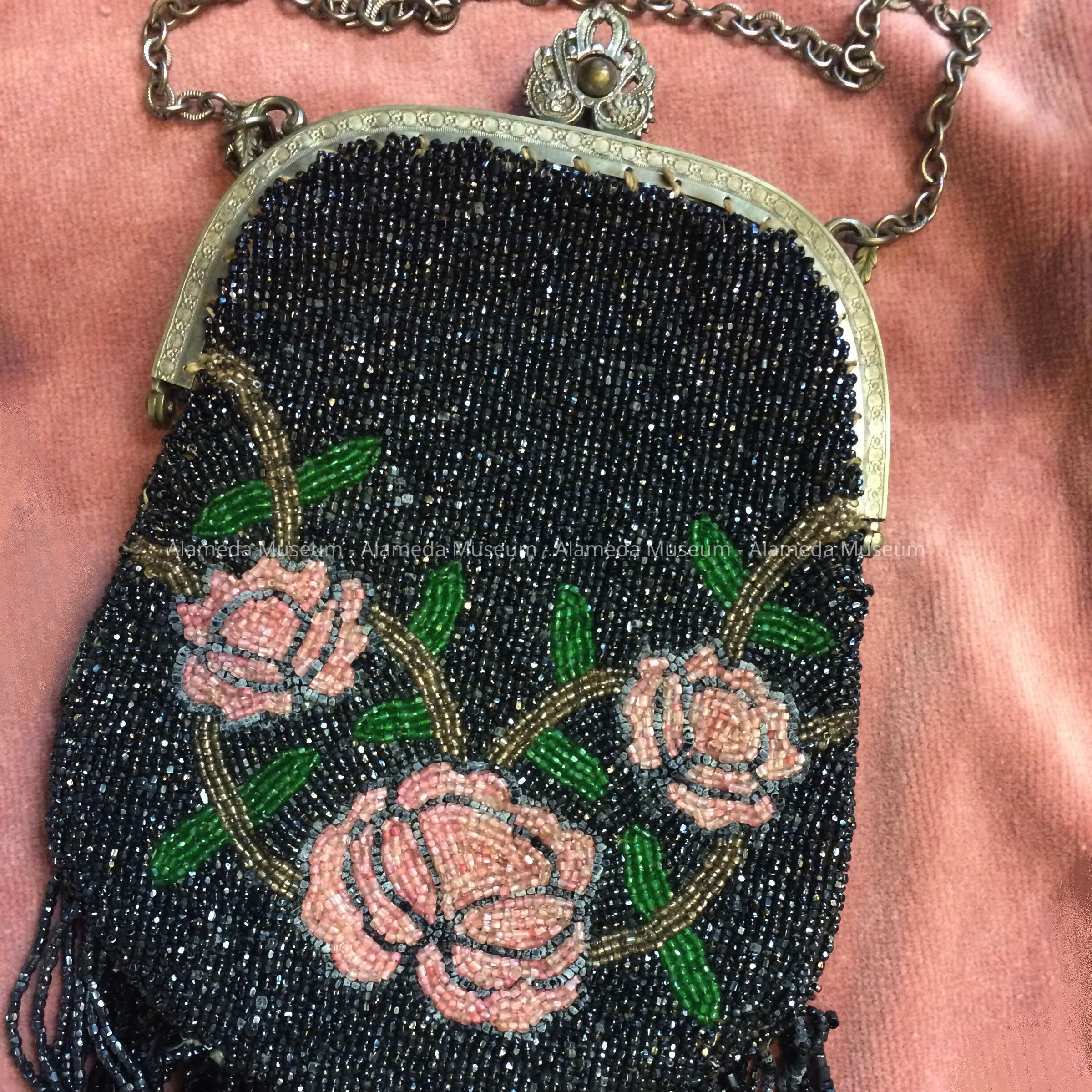 History of Object: Beaded purse that originally belonged to Marguerite E. Fish, daughter of Myron H. Fish (local builder), granddaughter of Sherman J. Fish (one of the first 7 children to attend the Schermerhorn School, Alameda 1855-1864), and great granddaughter of Lydia Fish Millington (wife of City Clerk James Millington), pioneer resident of Alameda.