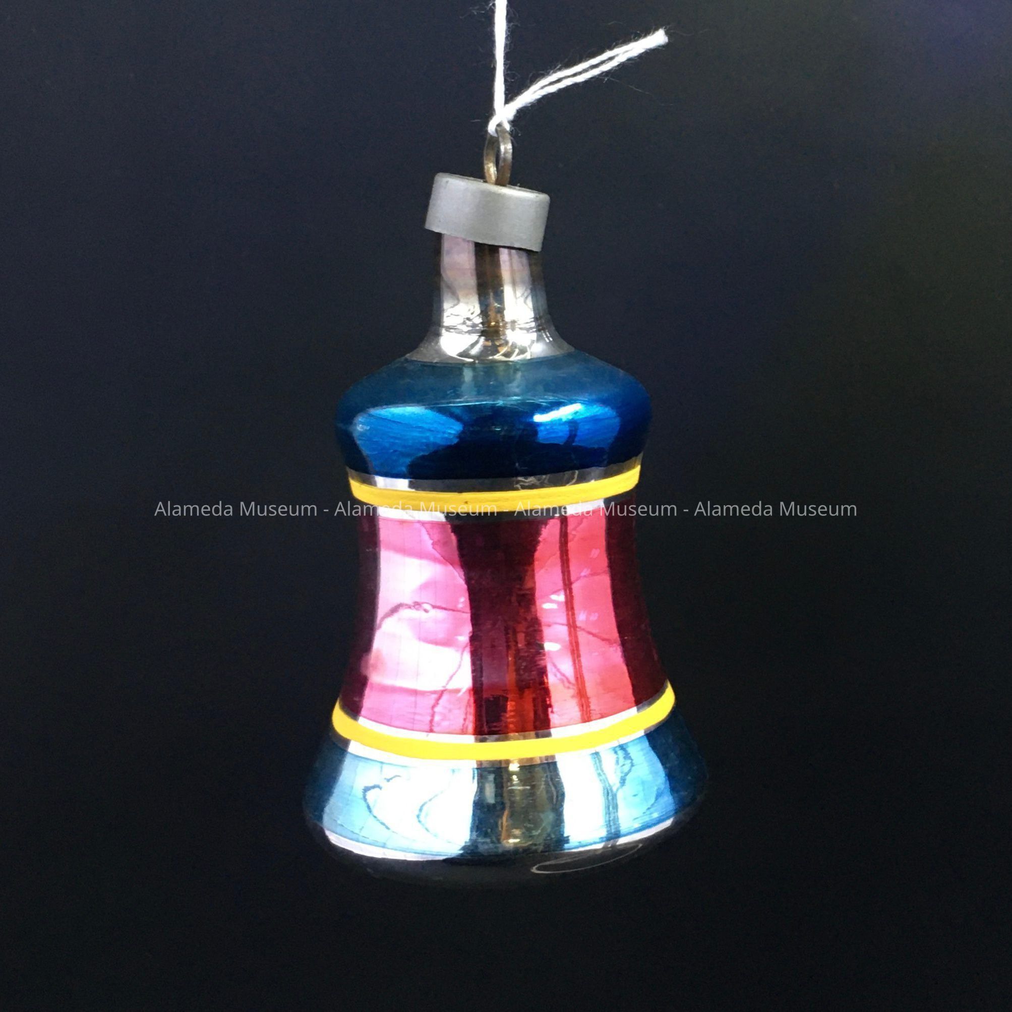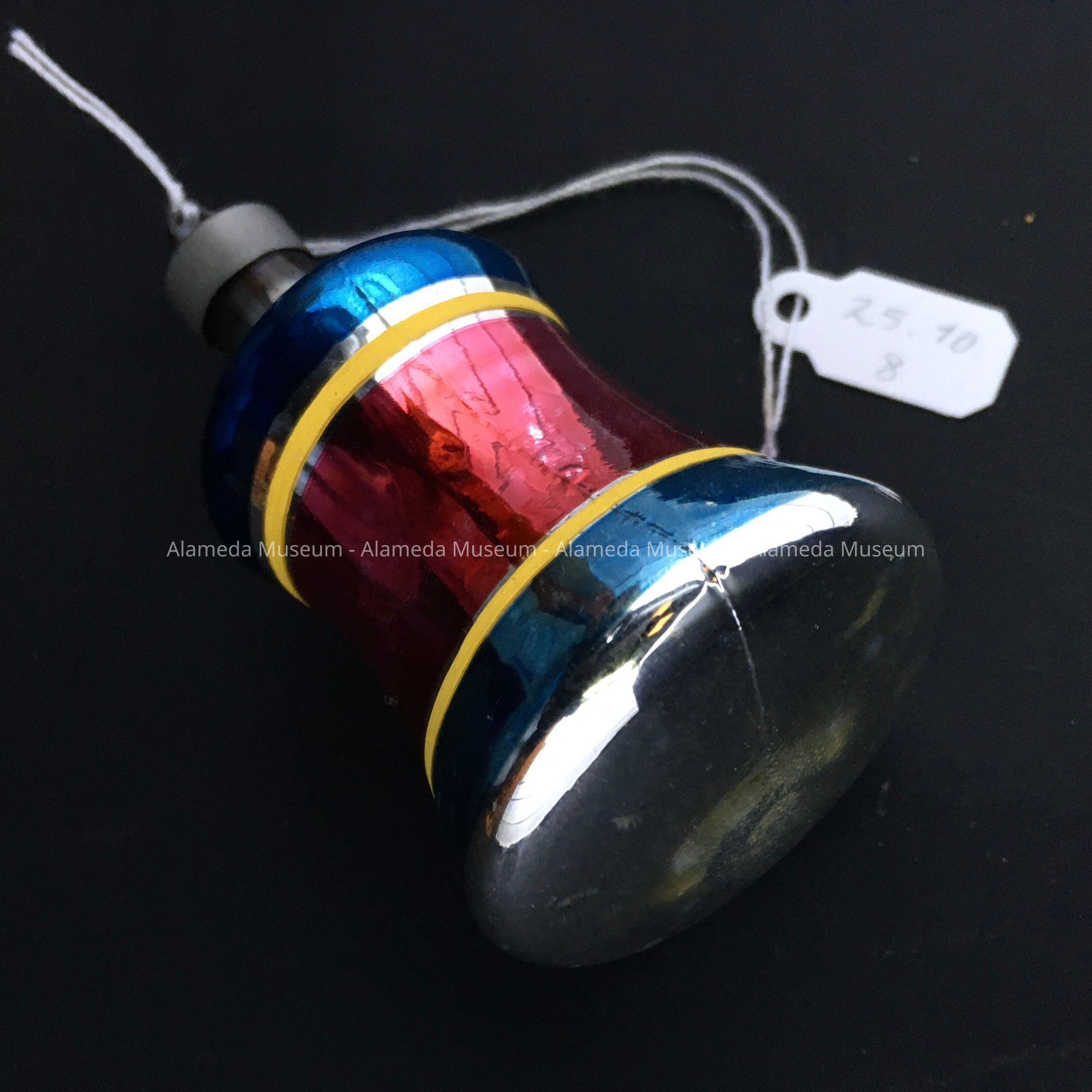 Description: A bell-shaped ornament with painted horizontal bands of metallic blue, red and blue, separated by non-metallic opaque yellow. The underside is slightly convex silver glass with small bump simulating a clapper.