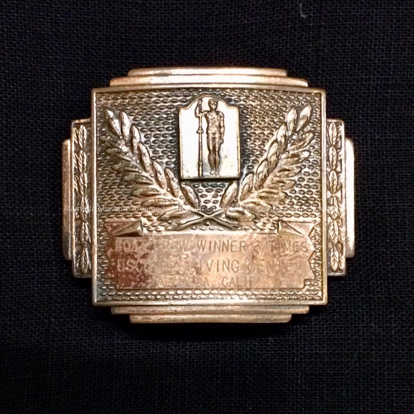 HISTORY OF OBJECT: A BELT BUCKLE ENGRAVED WITH THE FOLLOWING MESSAGE, "BOAT CREW WINNER THREE TIMES, U. S. COAST GUARD RECEIVING CENTER, ALAMEDA, CAL."