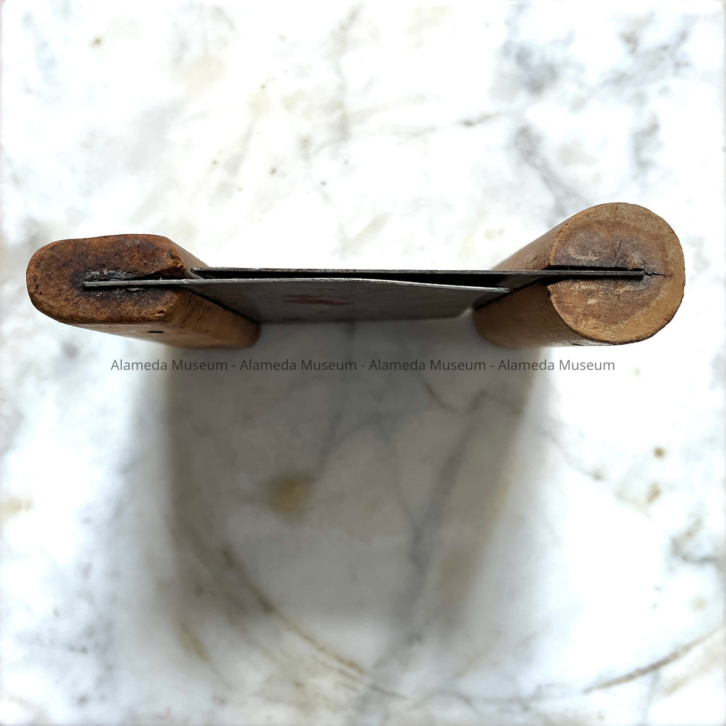 Description: Two tools composed of a rectangular steel or iron-alloy blade with blank wooden grips affixed with two iron nails around the edge of one of the long sides of the blade. A has a round grip, B elliptical. No manufacturer's markings.