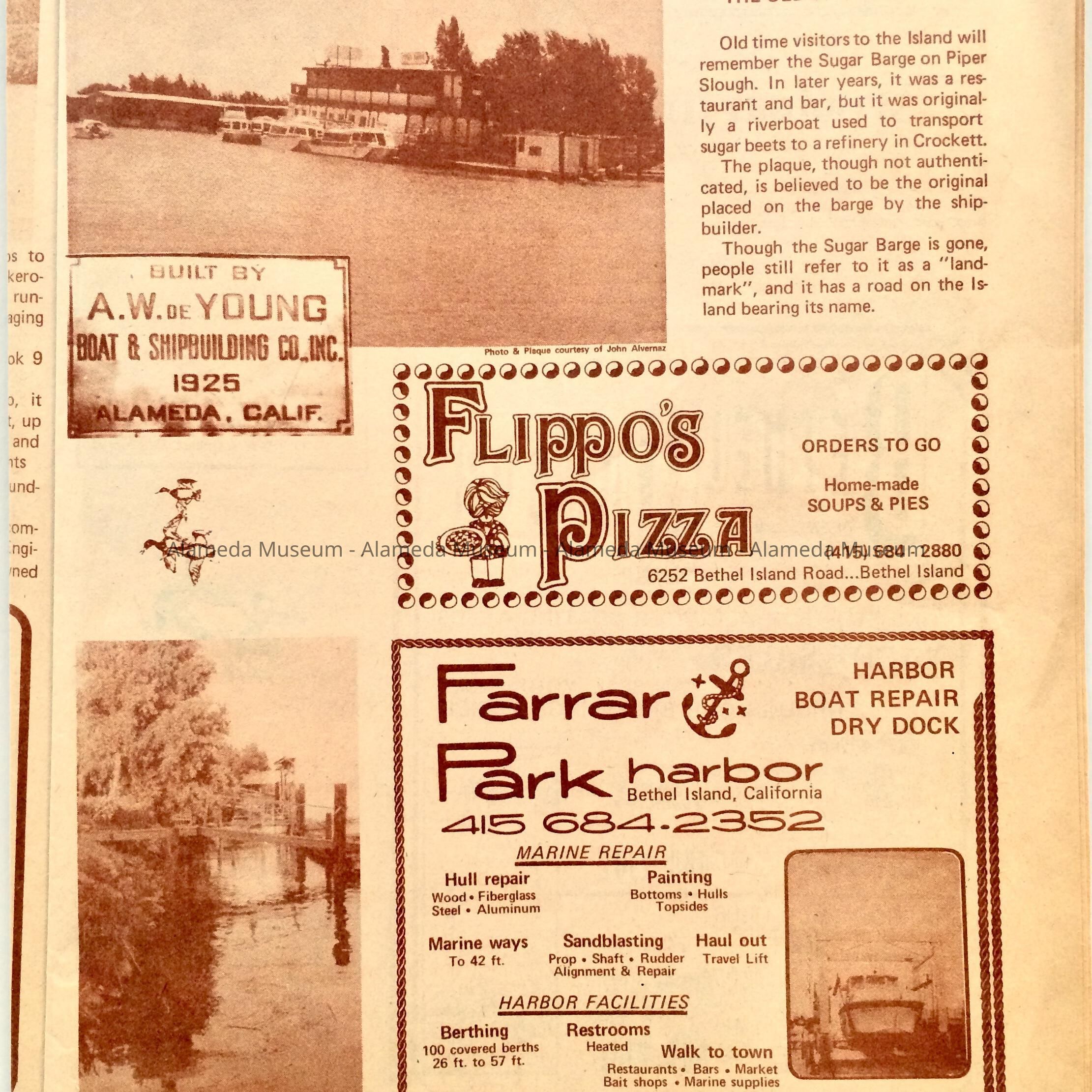 A PUBLICATION ENTITLED, "BETHEL ISLAND BEACON," ISSUED BY THE BETHEL ISLAND CHAMBER OF COMMERCE. PAGE 23 DISPLAYS A FACSIMILE OF A PLAQUE THAT WAS ATTACHED TO A RIVER BOAT THAT WAS ORIGINALLY USED TO TRANSPORT SUGAR BEETS TO A REFINERY IN CROCKETT. THE PLAQUE STATES, "BUILT BY A W DeYOUNG, BOAT AND SHIPBUILDING CO., INC., 1925, ALAMEDA, CALIF."