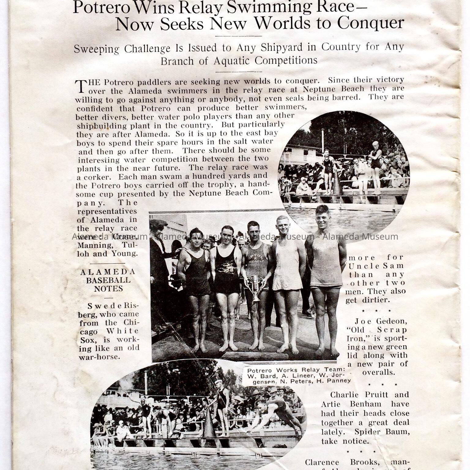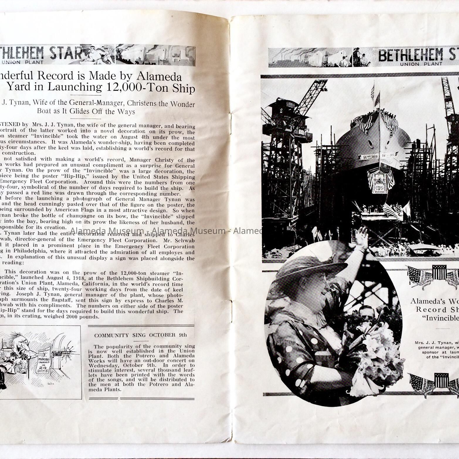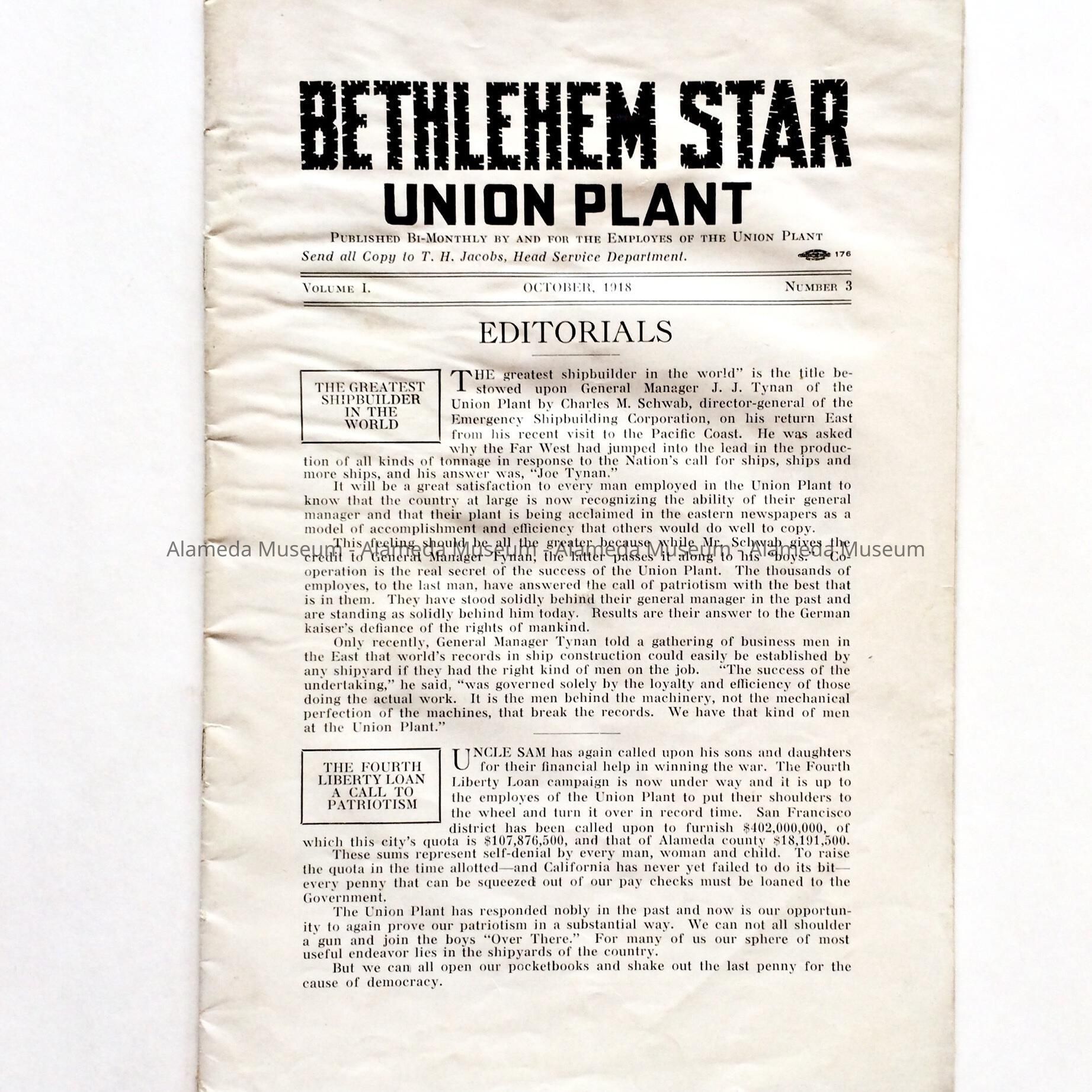 OCTOBER 1918 EDITION OF THE "BETHLEHEM STAR," A BI-MONTHLY PUBLICATION FOR THE EMPLOYEES OF THE BETHLEHEM UNION PLANT. THE MAGAZINE CONTAINS ILLUSTRATIONS AND ARTICLES CONCERNING SHIPS LAUNCHED AT THE ALAMEDA FACILITY DURING WORLD WAR-I. THE BACK PAGE CONTAINS AN ILLUSTRATED ARTICLE CONCERNING A SWIMMING RACE BY EMPLOYEES AT NEPTUNE BEACH.