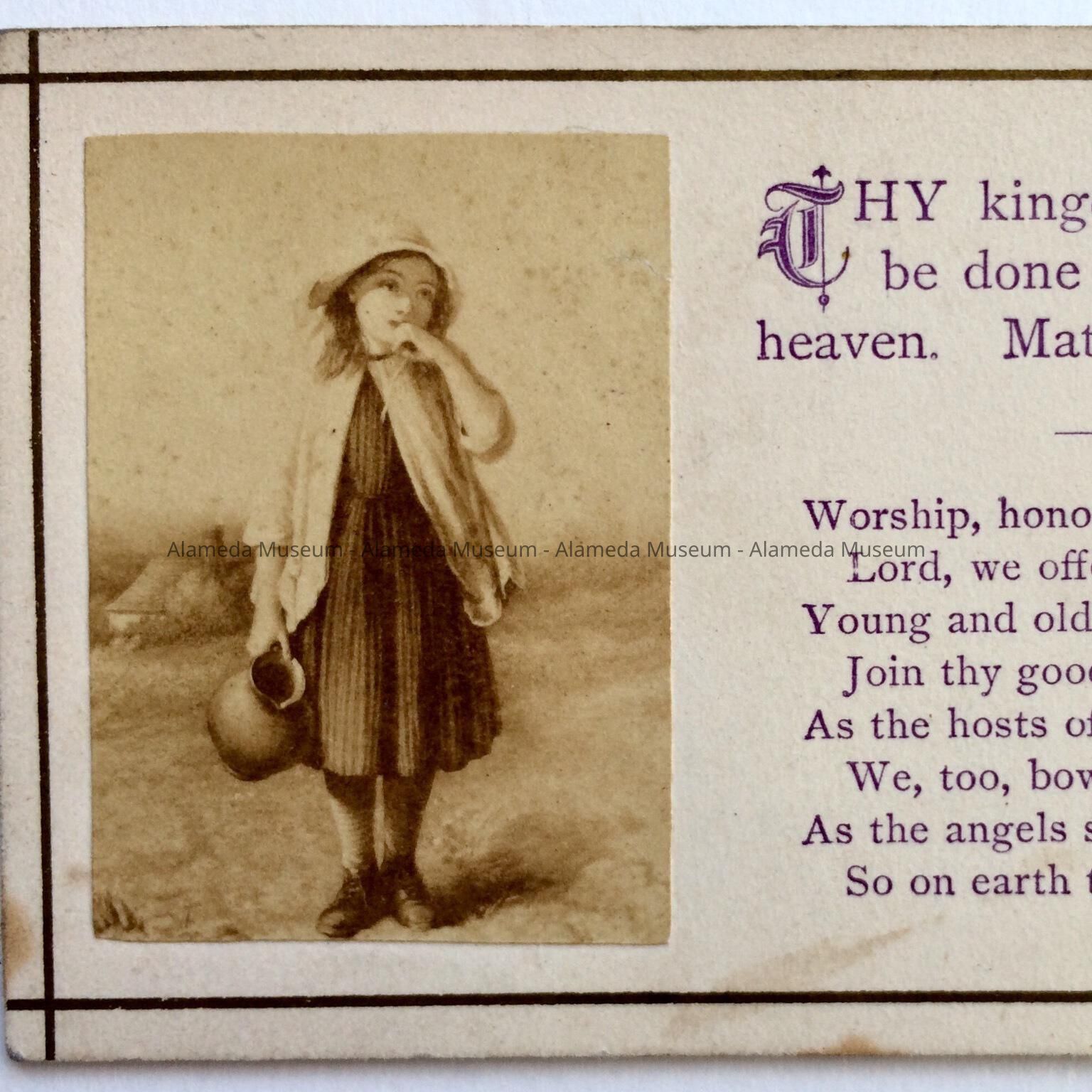 ILLUSTRATED BIBLE CARD, WITH RELIGIOUS MOTTO PRINTED IN PURPLE-COLORED INK ON AN OFF-WHITE HEAVY STOCK PAPER. THE ILLUSTRATION, IN SEPIA TONE, APPEARS TO BE IN A PHOTOLITHOGRAPHIC PROCESS.