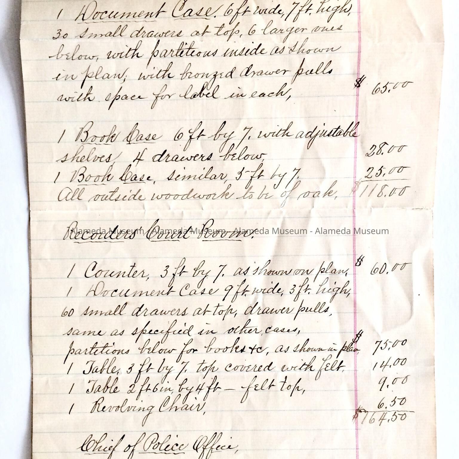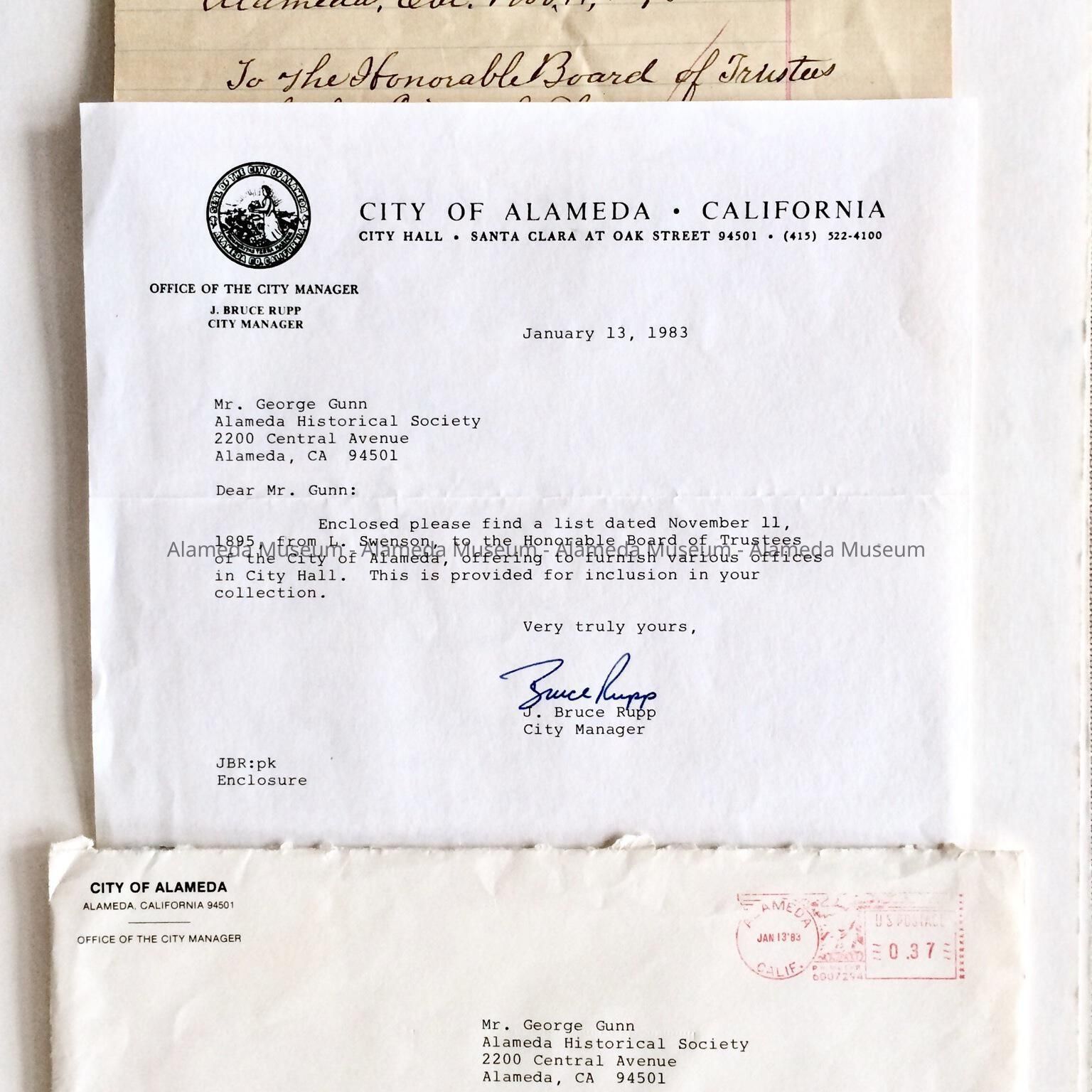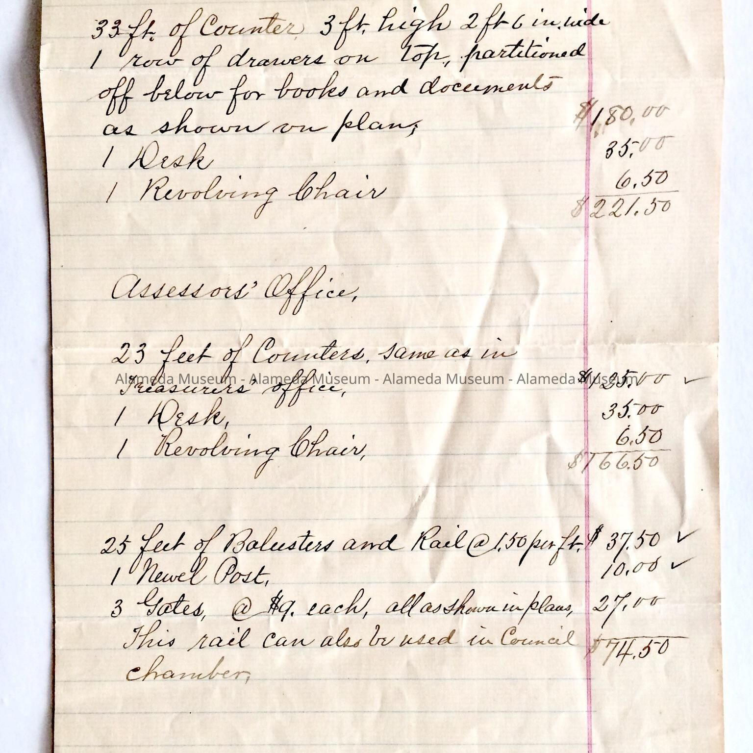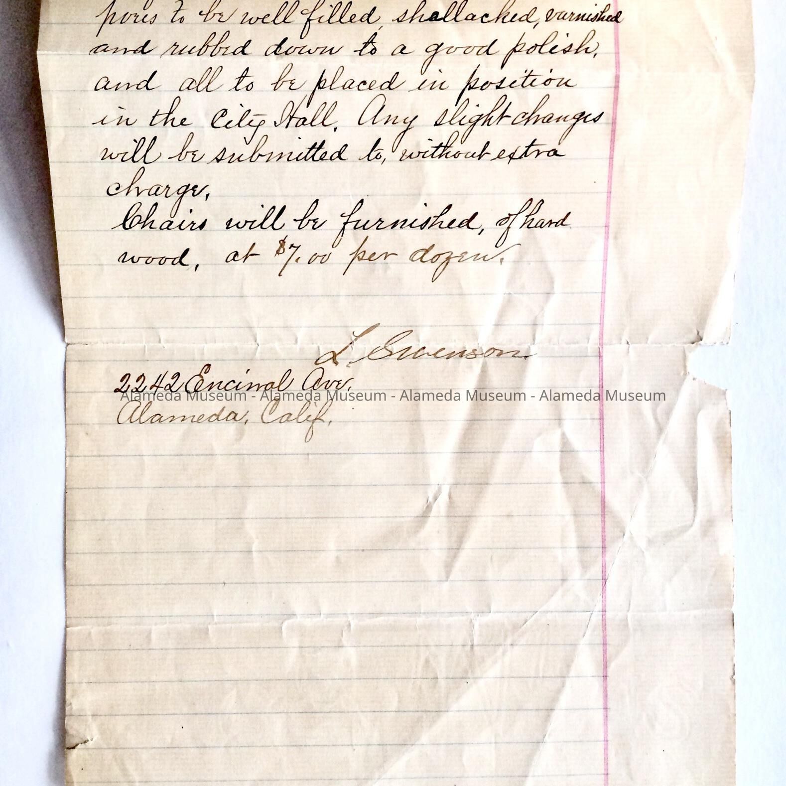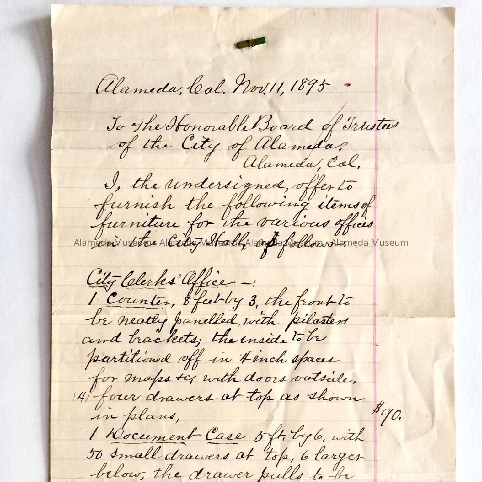 Hand written bid, dated November 11, 1895, from L. Swenson, to the Honorable Board of Trustees of the City of Alameda, offering to furnish various offices in City Hall, then being constructed.