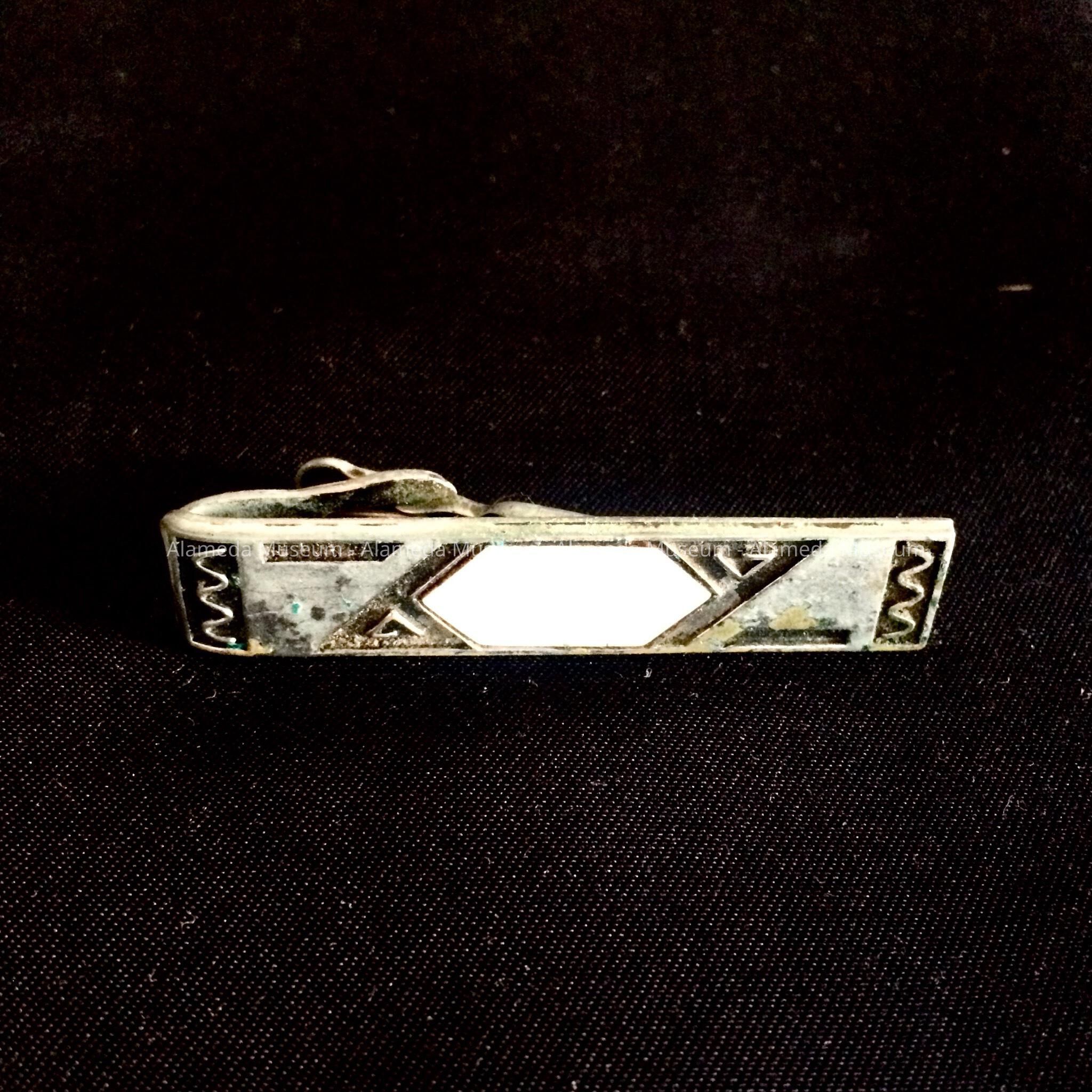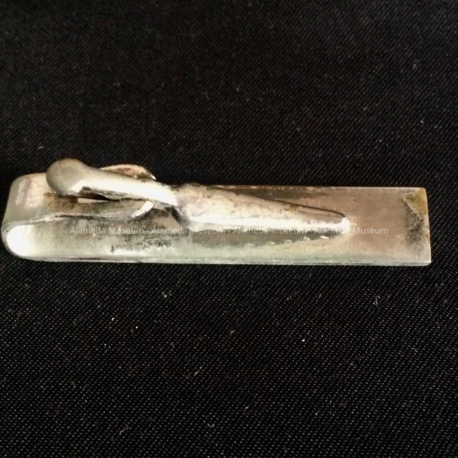 Description: hinged metal bill clip, with top design of black enamel and bare metal, with mother of pearl hexagon inlay. Reverse has a saw-tooth tension-operated mechanism, which pushes a tongue down to hold bills in place. No markings. The black engraving has worn off in places.