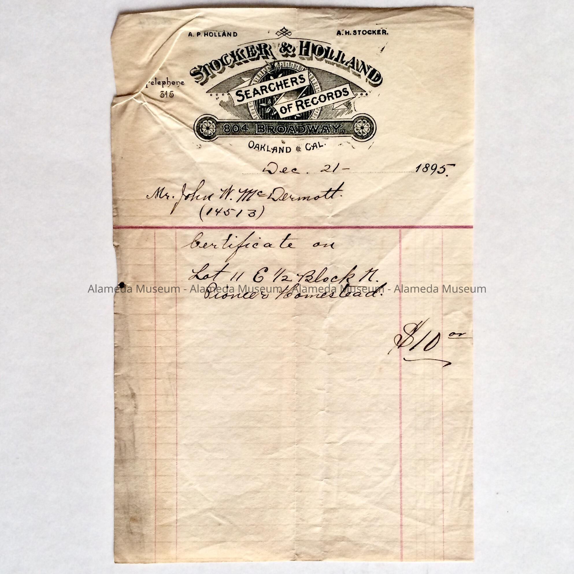 Bill for certificate of title search for 2066 San Jose Ave., 1895Entry/Object ID