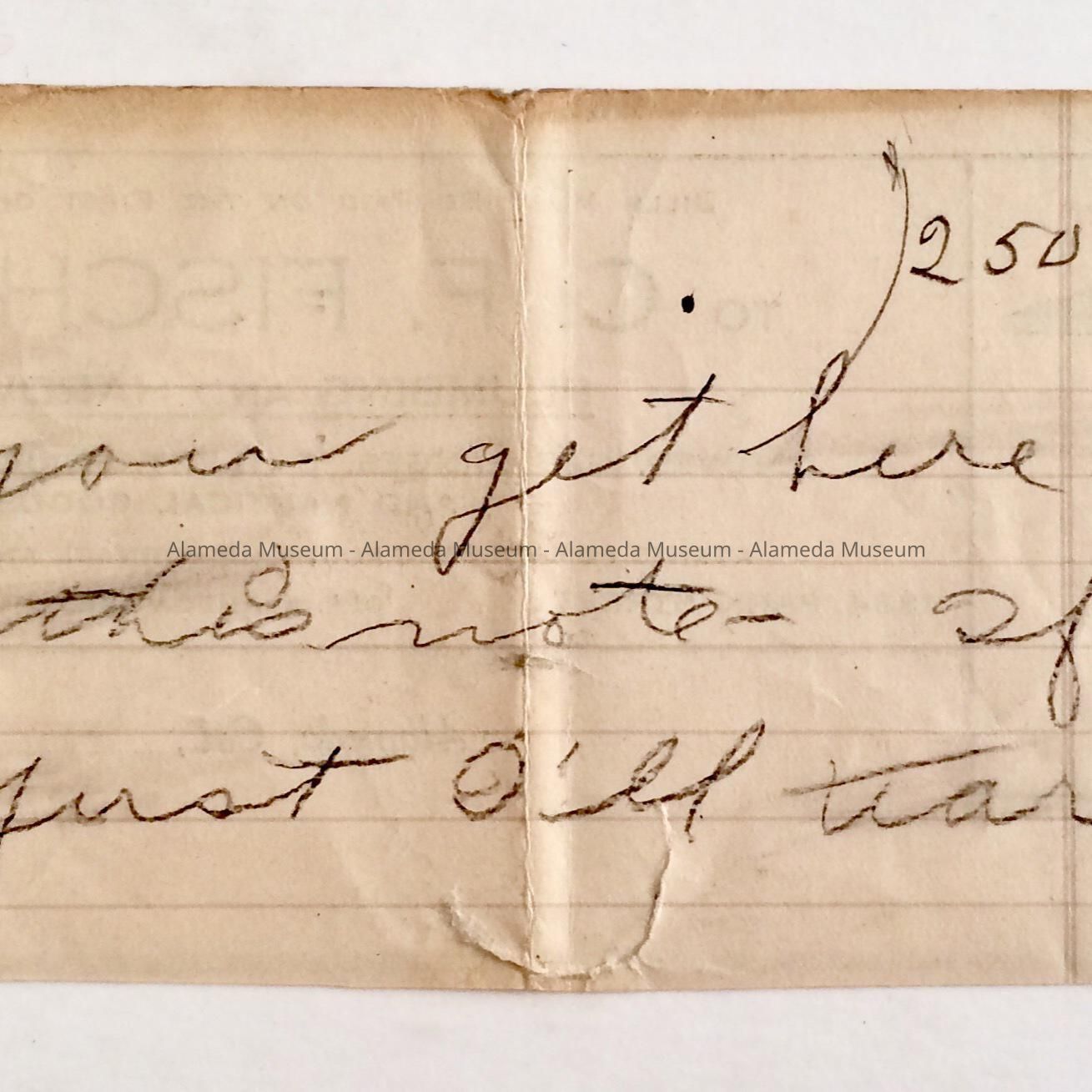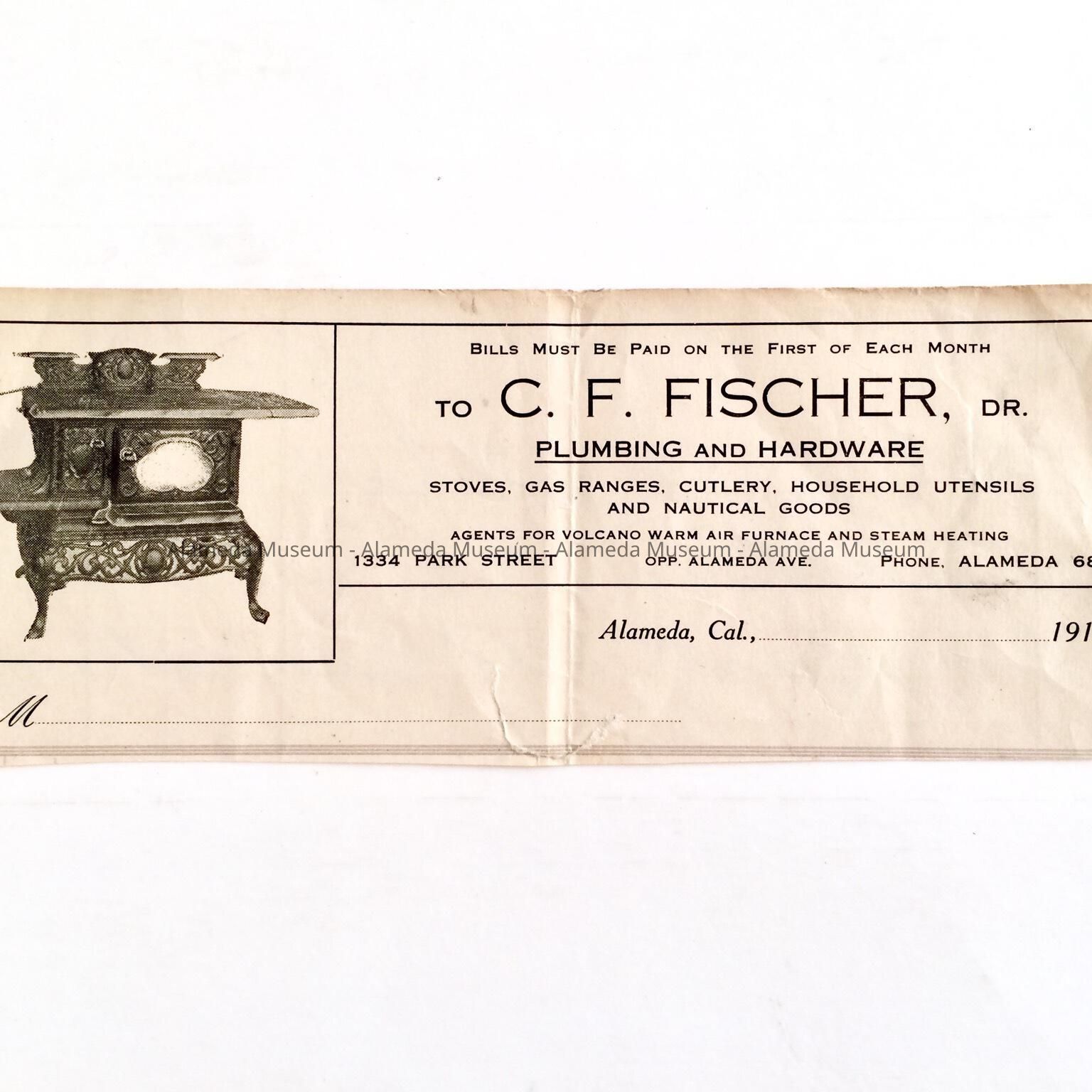History of Object: Portion of bill head (caption & illustration) from the stationery of Charles F. Fischer, plumbing & hardware dealer, 1334 Park Street, Alameda.