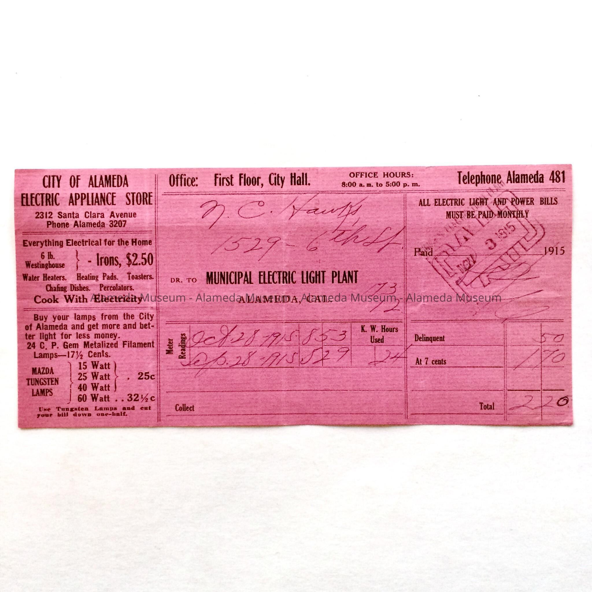 HISTORY OF OBJECT: BILL WITH RECEIPT, STAMPED PAID, NOV 3, 1915, FROM THE MUNICIPAL ELECTRIC LIGHT PLANT. MADE OUT TO N. C. HAWKS, 1529 6TH STREET, ALAMEDA. THE OFFICE OF THE ELECTRIC LIGHT PLANT WAS LOCATED IN THE CITY HALL, FIRST FLOOR, DURING THIS PERIOD.
