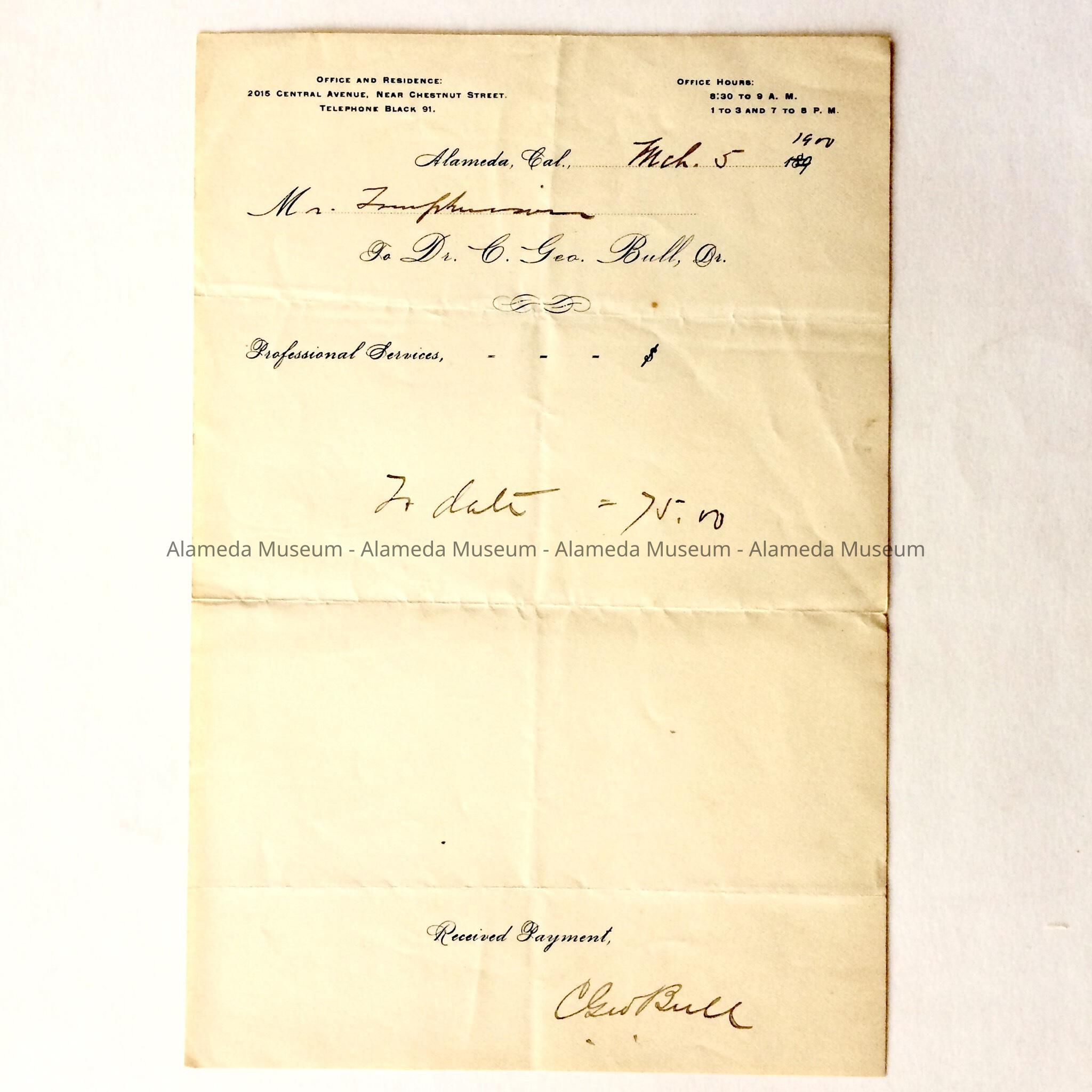 BILL FROM DR C GEORGE BULL, OFFICE AND RESIDENCE THEN LOCATED AT 2015 CENTRAL AVENUE, ALAMEDA, CALIFORNIA. DATED MARCH 5, 1900. BILL WAS ADDRESSED TO A MR TOMPKINSON.