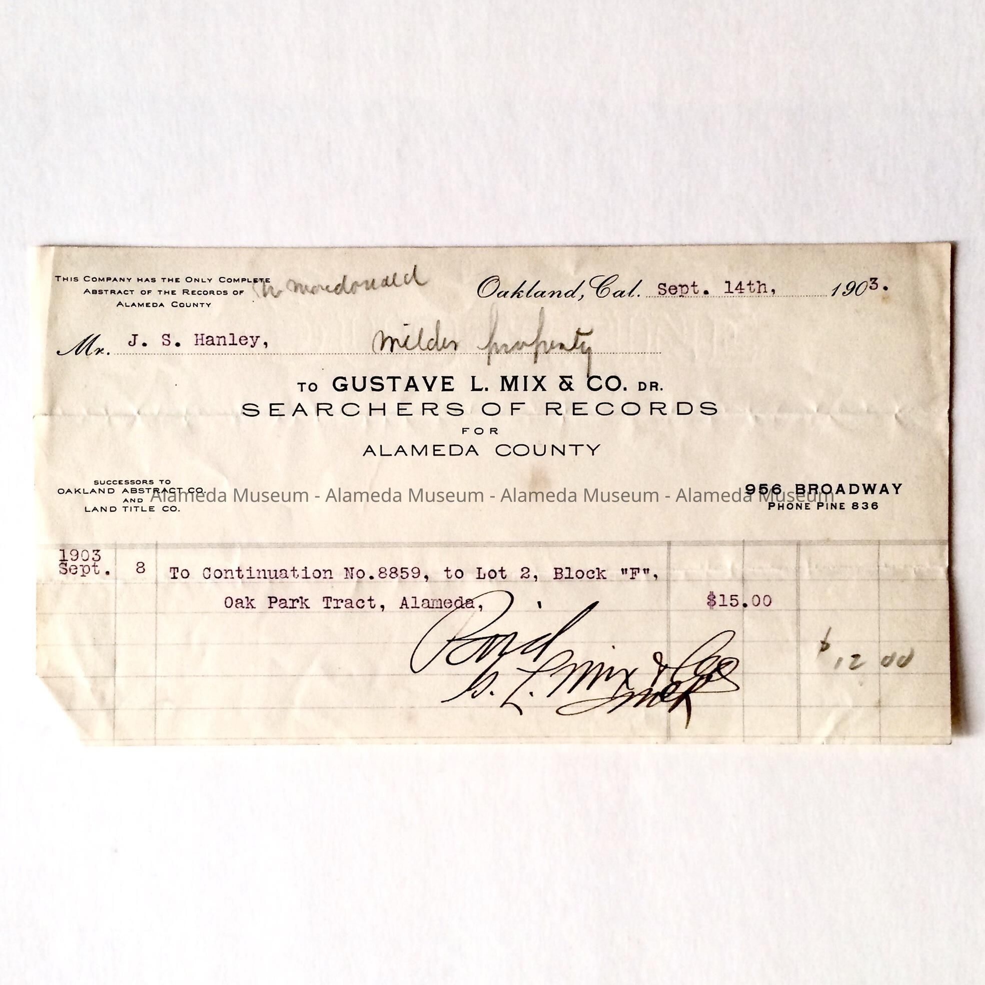 Bill sent to Mr J. S. Hanley for title researche on 2066 San Jose Ave, 1903Entry/Object ID