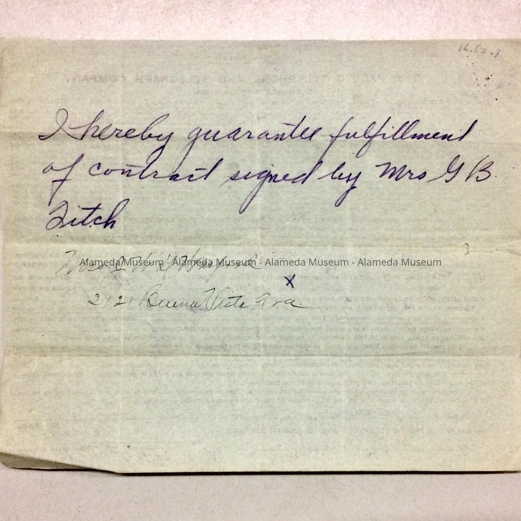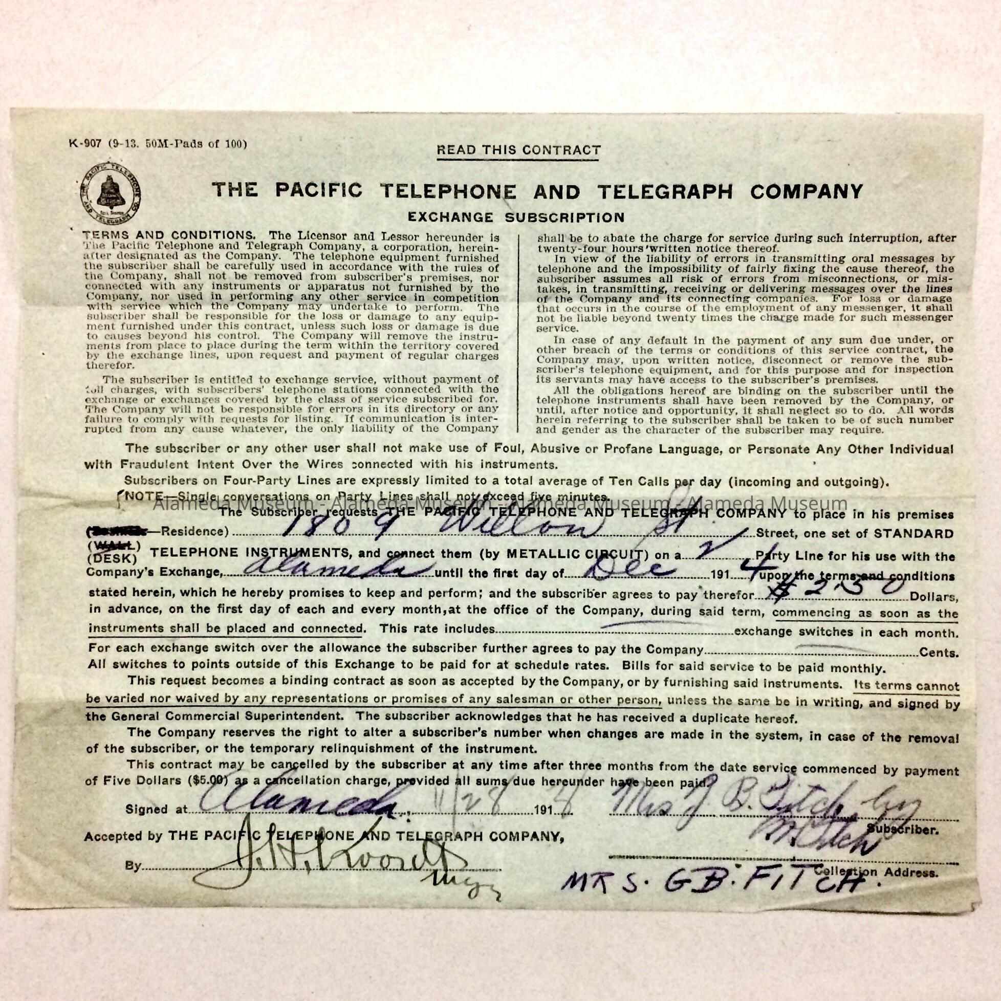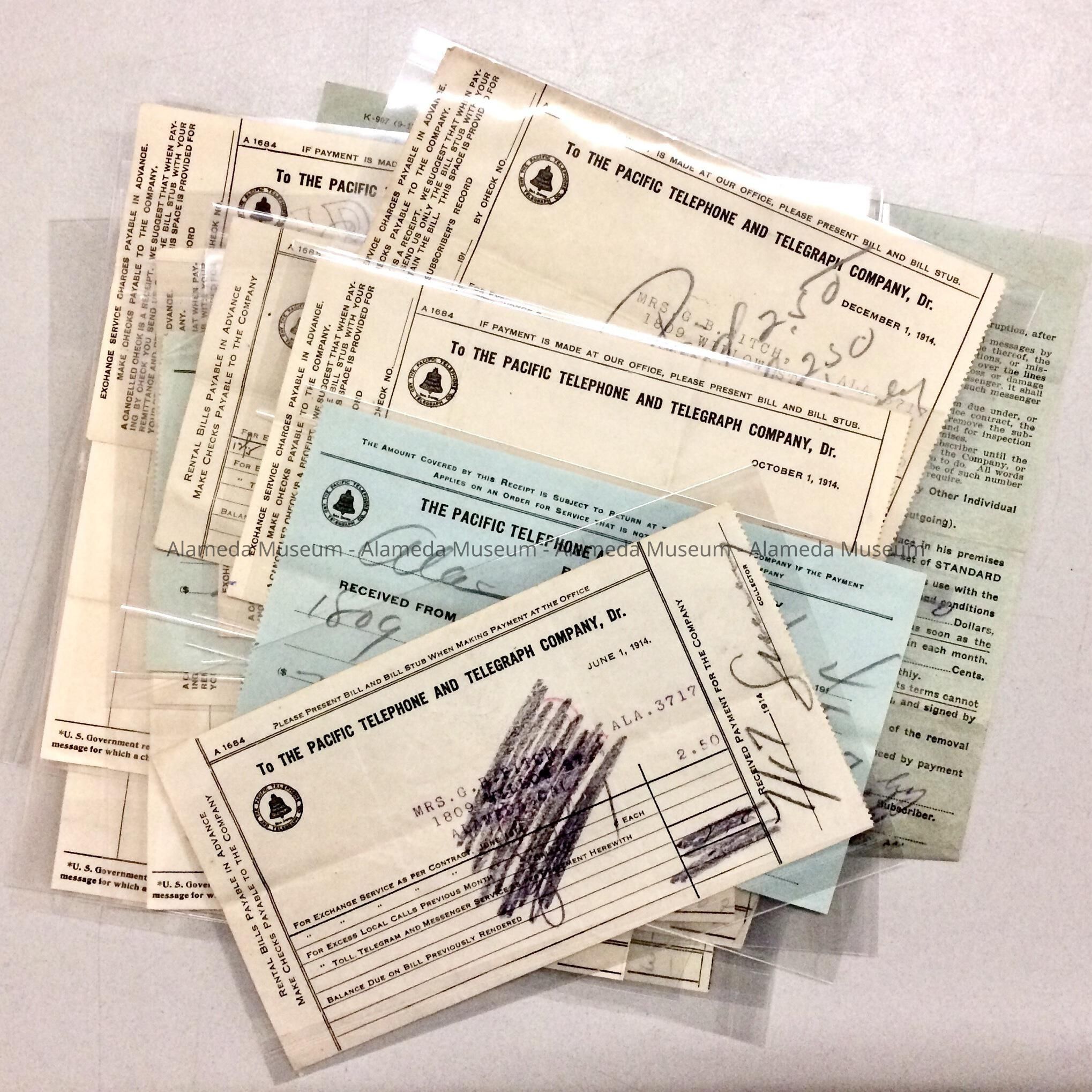 History of Object: Returned Bills, some with glued-on statement -in the case of long-distance (toll) calls, telegrams, or essenger service-, and a subscription contract, from the Pacific Telephone and Telegraph Company, for Mrs. G.B. Fitch, 1809 Willow St.
