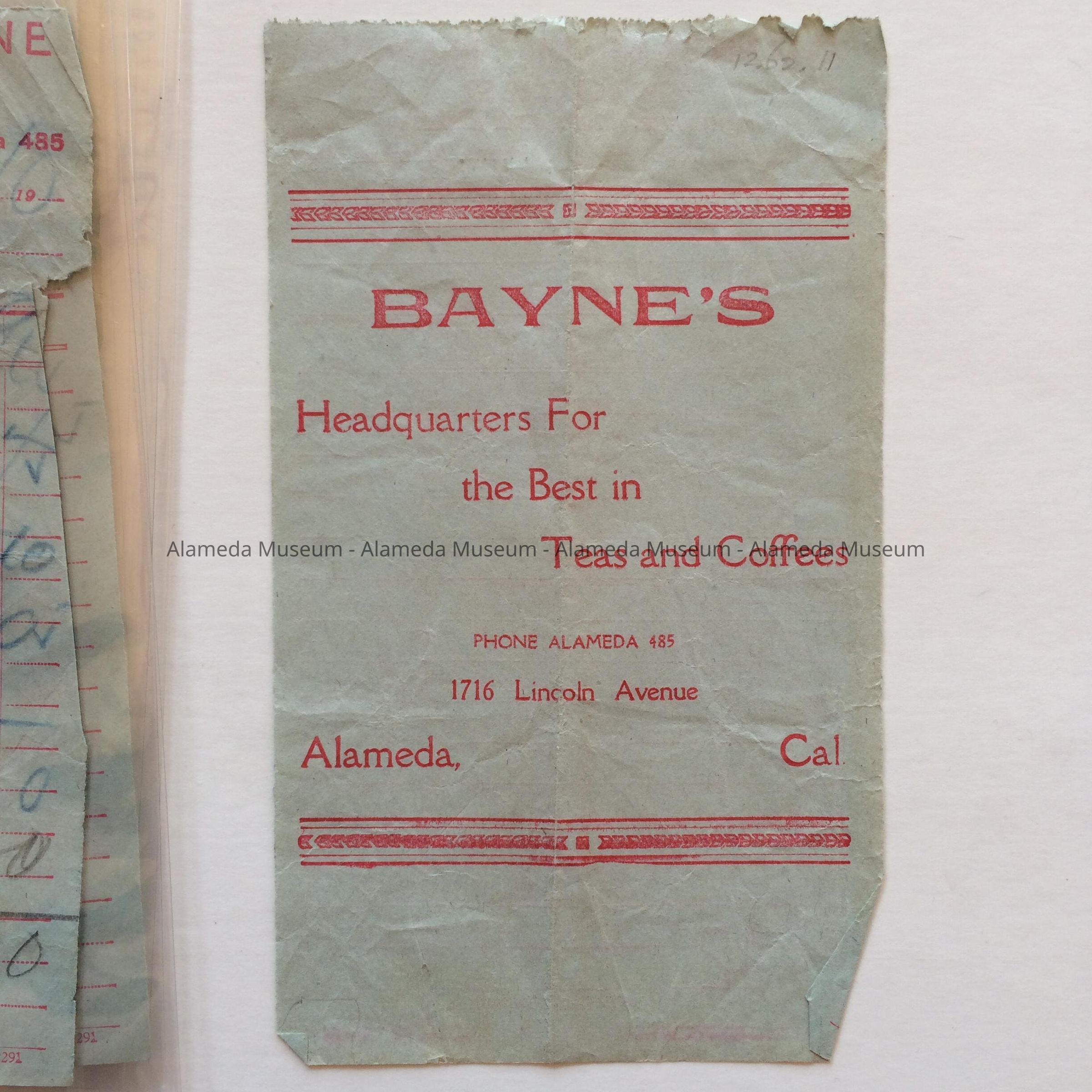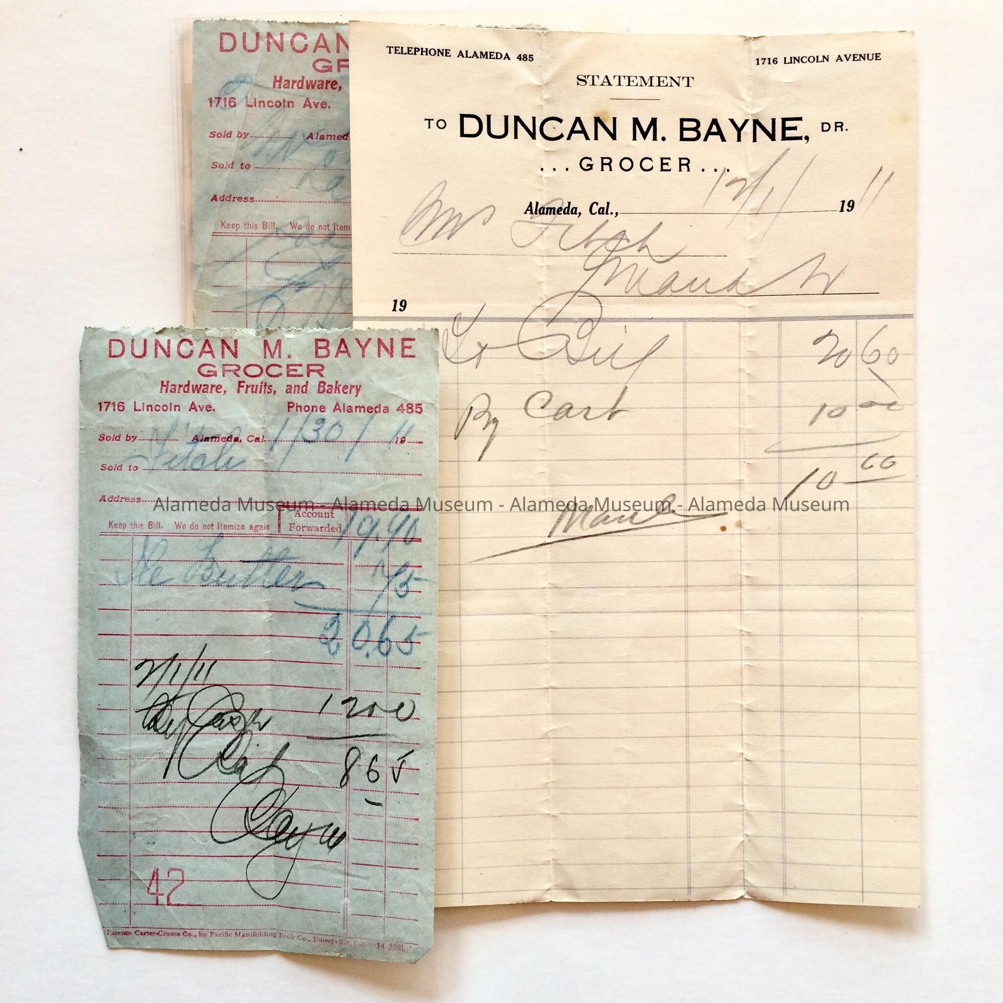 Description: Forms, in two styles, style A. with printed information in red type on pale blue paper, stating, 'Duncan M. Bayne Grocer, Hardware, Fruits, and Bakery, 1716 Lincoln Ave. Verso states: 'Bayne's Headquarters For the Best in Teas and Coffees'. Style B. (1 'statement'), in black type on white paper, stating 'Duncan M. Bayne, Grocer. Additional information is filled in by hand. The blue forms may be a carbon copy, with the additional information showing up in blue.