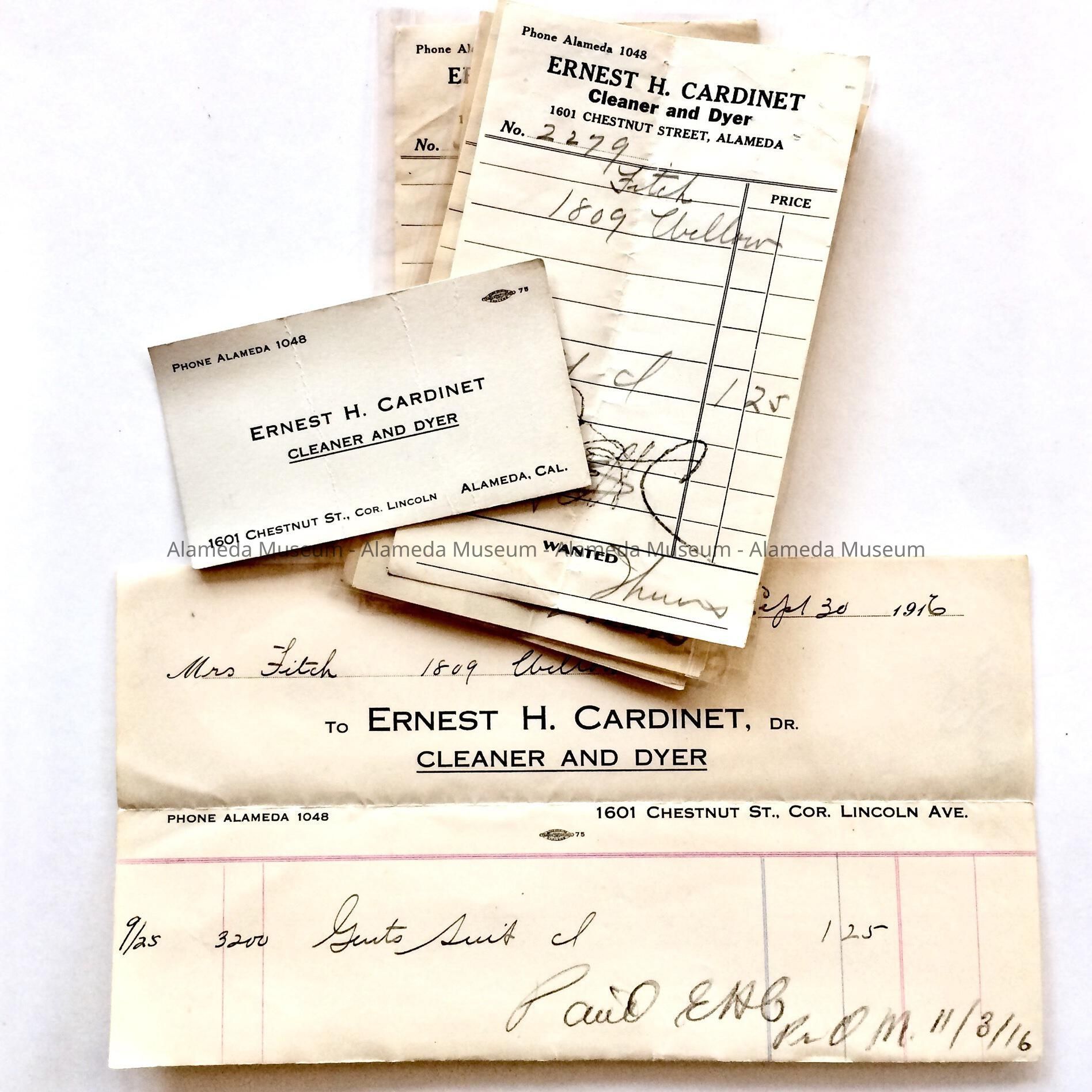 Description: Forms, and one business card, with printed information in black type on white paper, with added information handwritten in pencil, all for ‘Ernest H. Cardinet, Cleaner and Dyer’. Handwritten information states Fitch and 1809 Willow.
