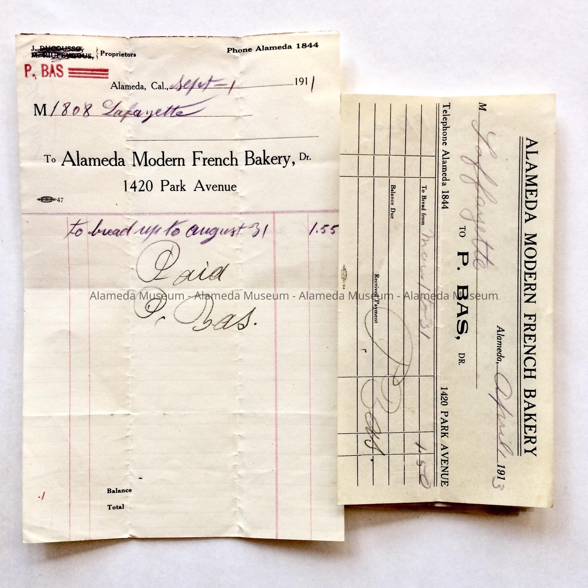Bills from the Alameda French Bakery, 1911, 1913Entry/Object ID