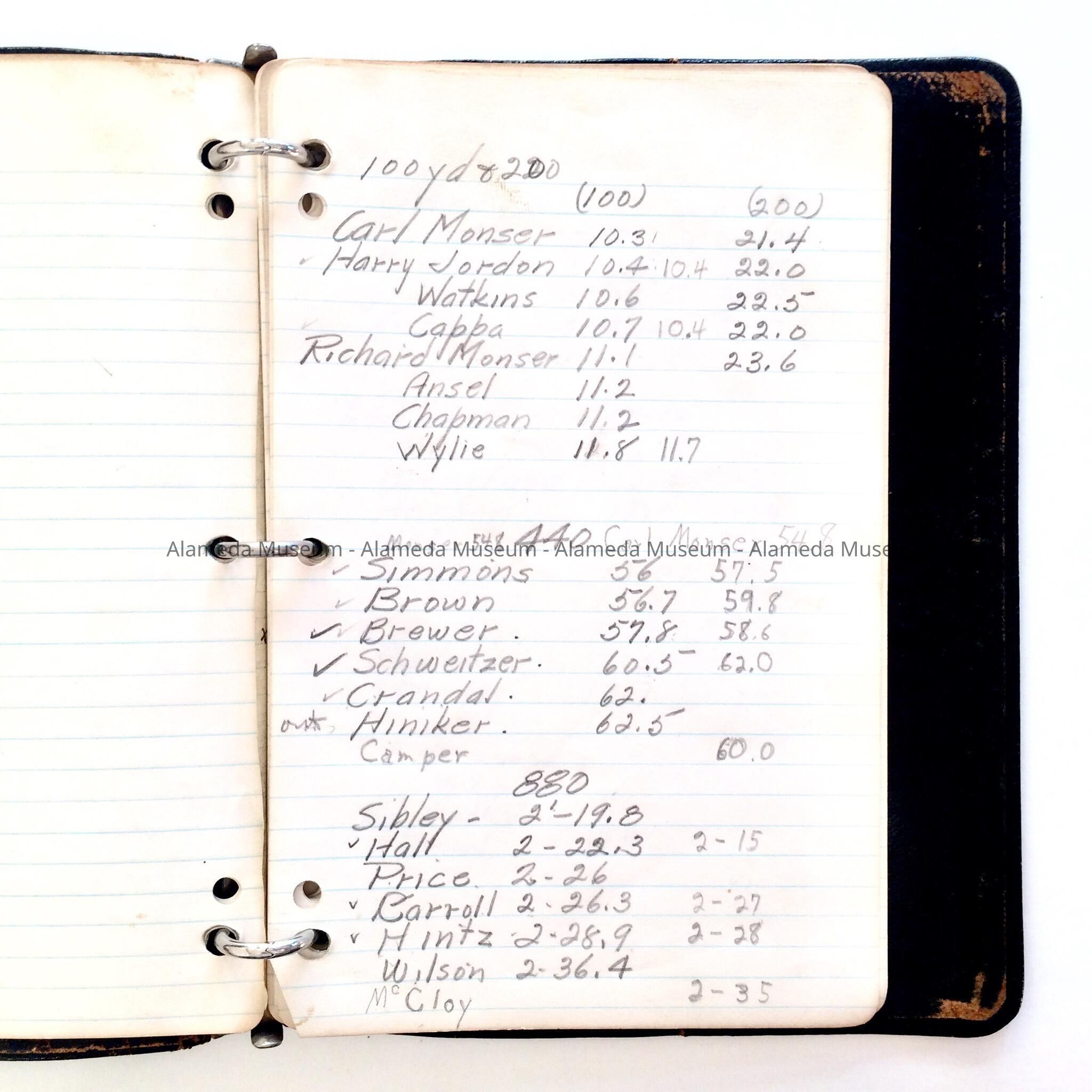 A BINDER CONTAINING NAMES OF ATHLETES, WITH THEIR RUNNING SCORES, ETC, HANDWRITTEN IN INK AND IN PENCIL. THE NOTEBOOK HAD BEEN MAINTAINED BY LEWIS C JOLLEY, COACH, ALAMEDA HIGH SCHOOL.