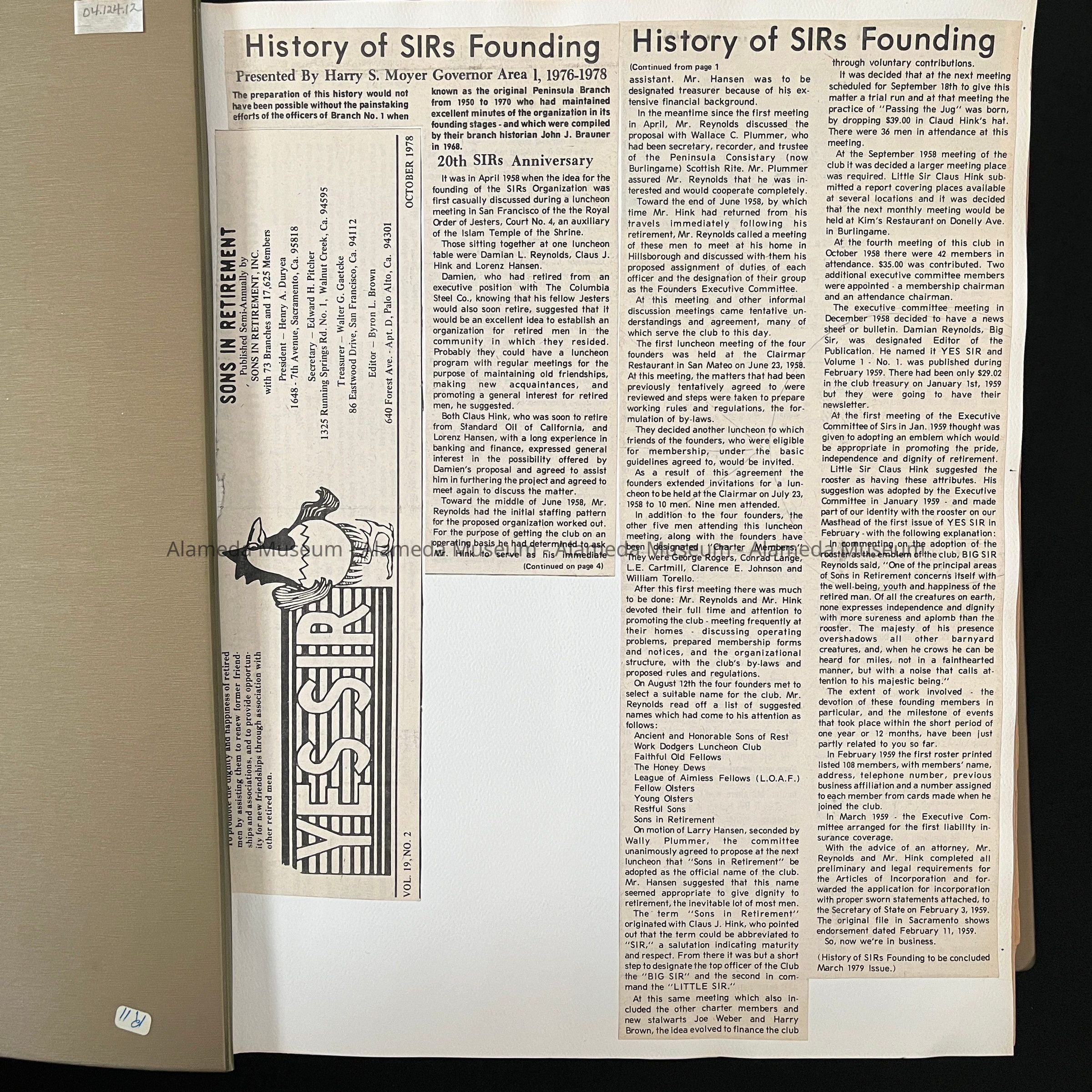 HISTORY OF OBJECT: BINDER CONTENTS INCLUDE PHOTOGRAPHS, NEWSPAPER CLIPPINGS, ETC. PERTAINING TO THE SONS IN RETIREMENT ORGANIZATION. REFER TO CARD 04.124.1 FOR DETAILED INFORMATION.