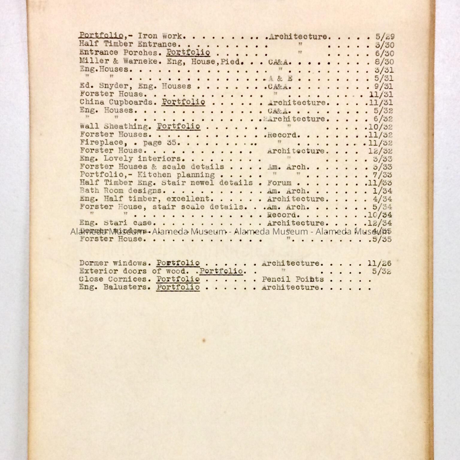 A BIBLIOGRAPHY THAT ACCOMPANIED THE REX BARRON HOME ON ALAMEDA'S HAWTHORNE STREET. MILDRED MEYERS WAS INVOLVED IN THE DESIGN ALTERATION PROCESS OF THE HOME.