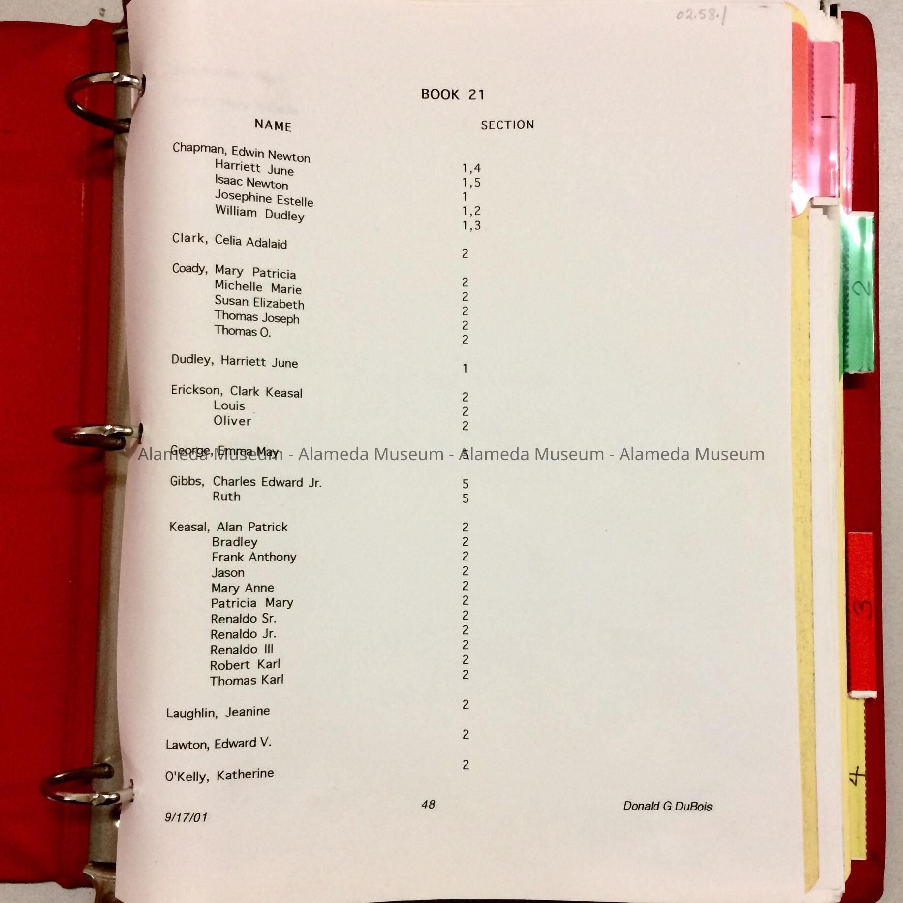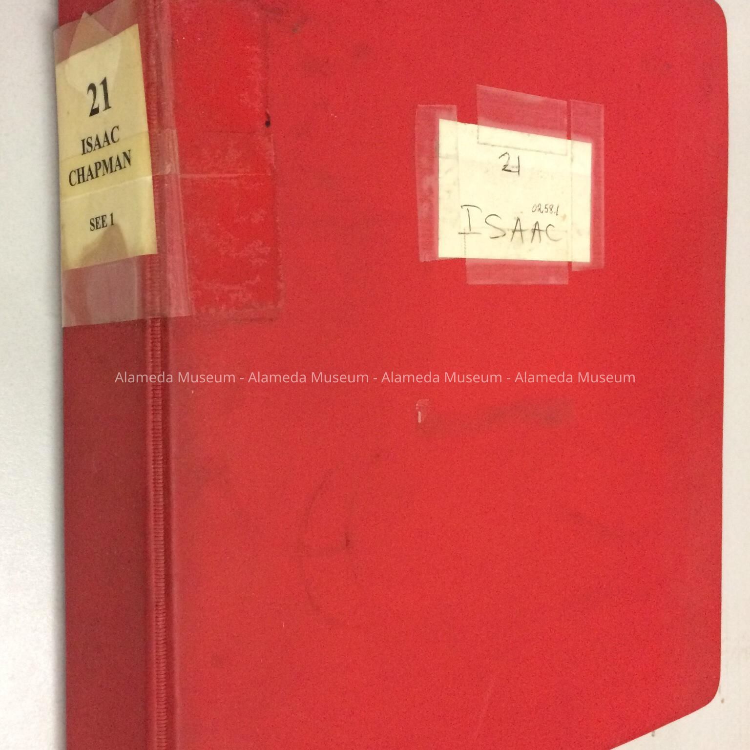 GENEALOGICAL INFORMATION, SEPARATED BY TABS, ENCLOSED IN A LOOSE-LEAF BINDER WITH RED-COLORED PLASTIC COVER. COVER HAS PAPER LABEL, "ISAAC - 21."