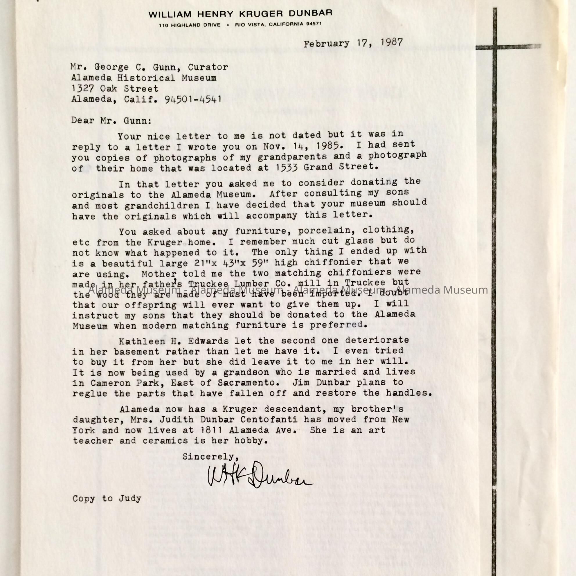 Biographical information, etc, assembled by the donor concerning William Henry Kruger who was a citizen of Alameda and died in 1981. Mr. Kruger was in the lumber business and had a mansion at 1533 Grand Street at the corner of Lincoln Avenue which has been demolished. Mr. Kruger's daughter, Gisella, married the late Oliver Haslett, the original owner of the High Wheel Bicycle which is part of the Museum collection.