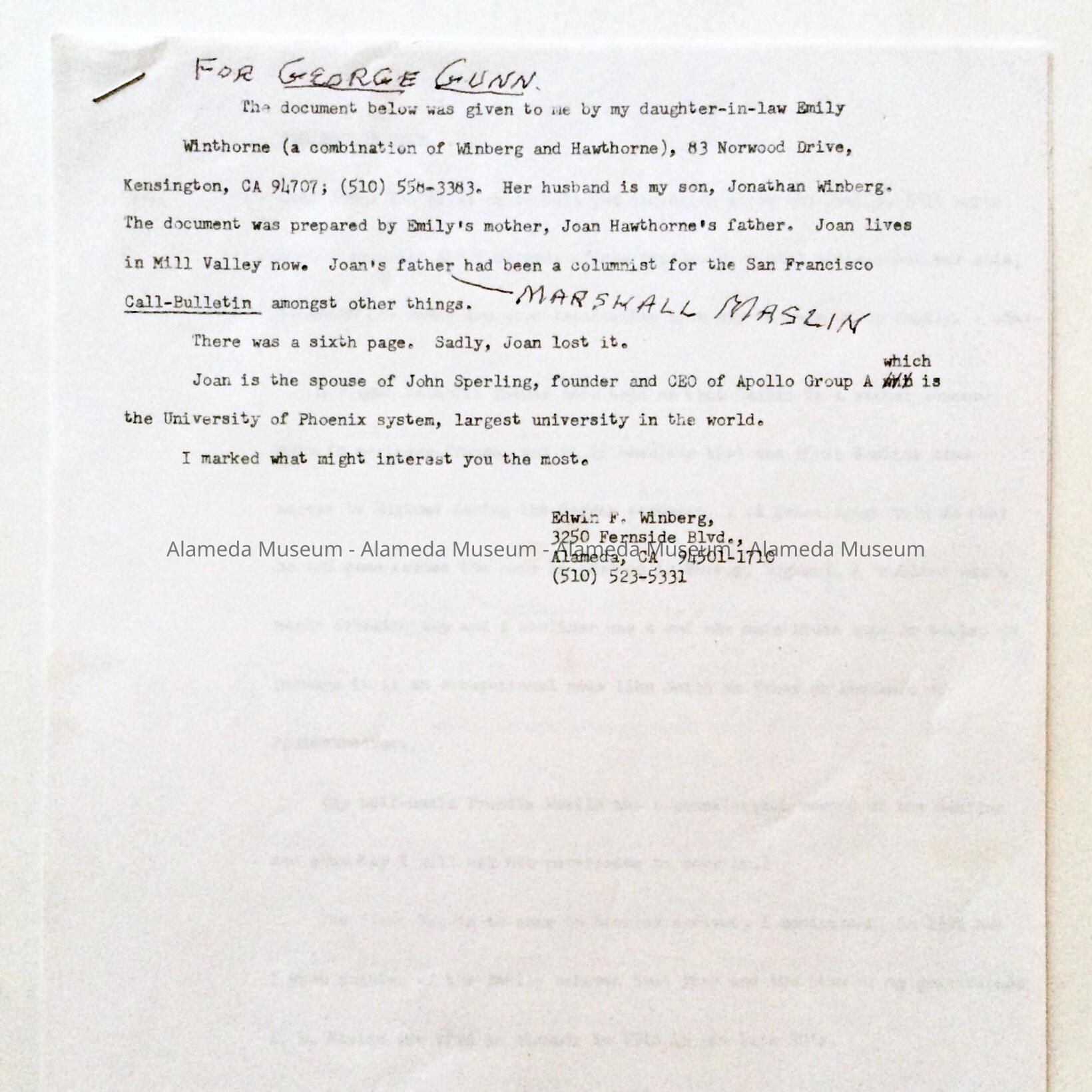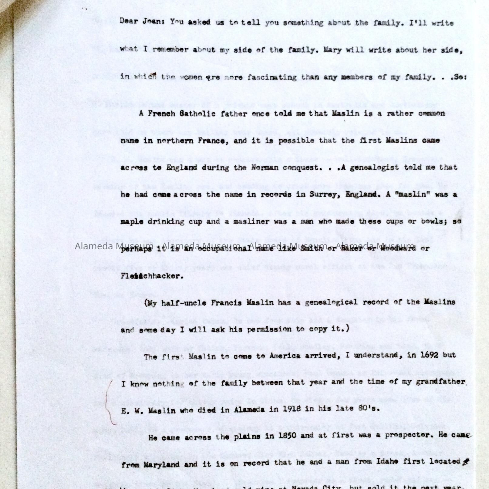 A BIOGRAPHICAL SKETCH CONCERNING THE MASLIN FAMILY WHO WERE RESIDENTS OF A LAMEDA IN THE 19th CENTURY. MR MASLIN WAS AN ATTORNEY, SECRETARY OF THE STATE BOARD OF EQUALIZATION, AND A DEPUTY NAVAL OFFICER FOR THE SAN FRANCISCO CUSTOMS HOUSE.