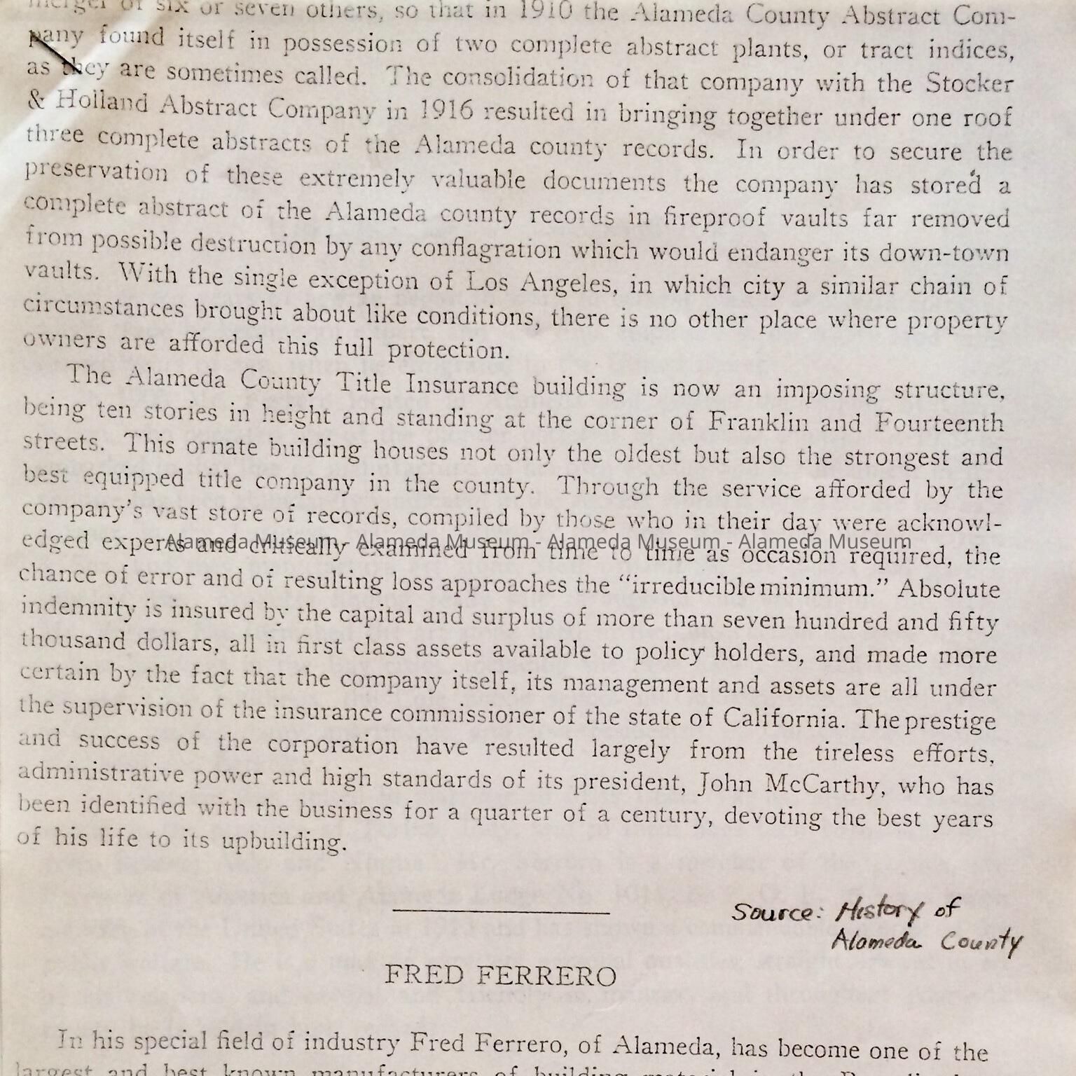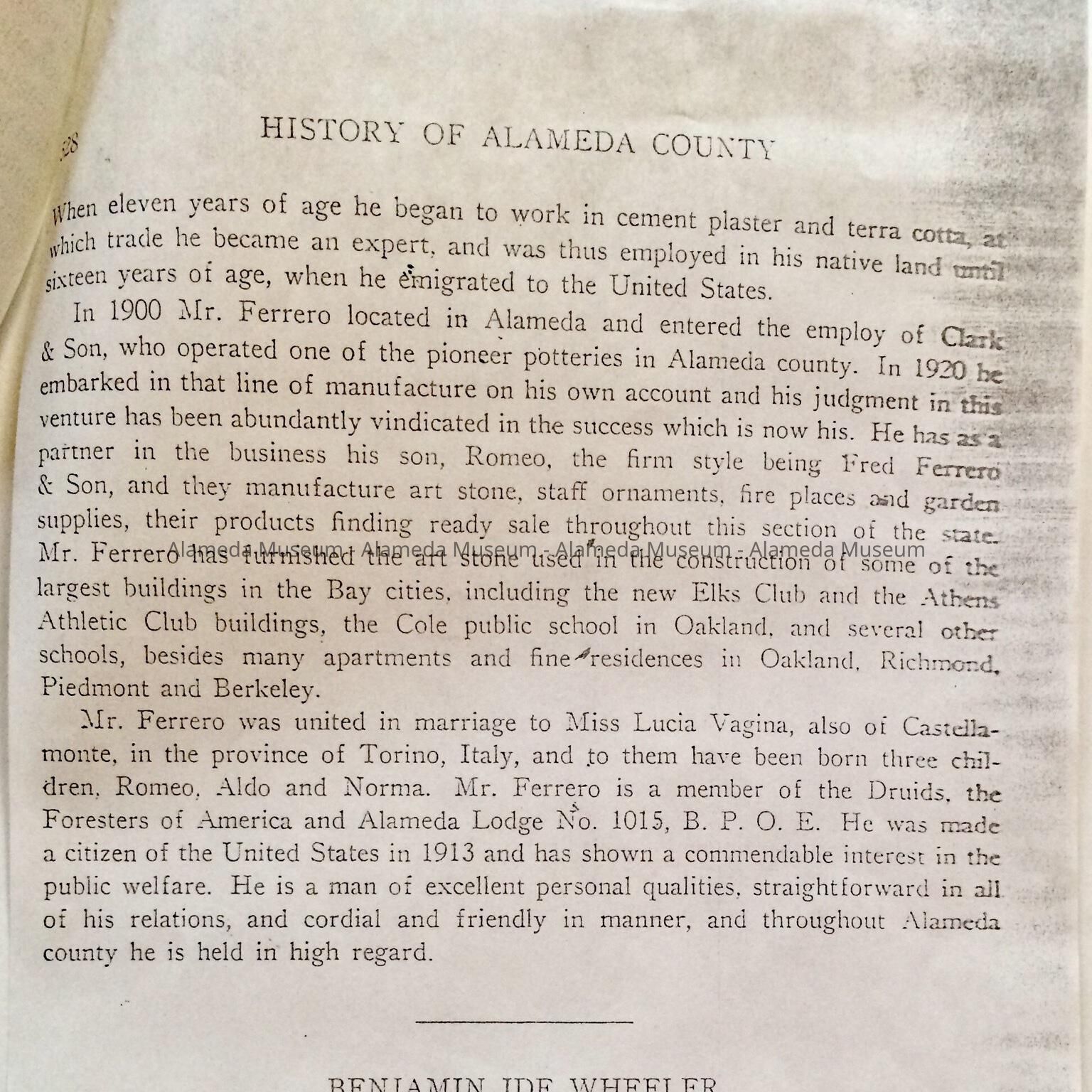 HISTORY OF OBJECT: A BIOGRAPHICAL SKETCH OF THE LATE FRED FERRERO, WHO CAME TO ALAMEDA IN 1900 AND OPENED AN ORNAMENTAL BUSINESS. HIS WORK INCLUDED GARDEN ORNAMENTS, ETC.