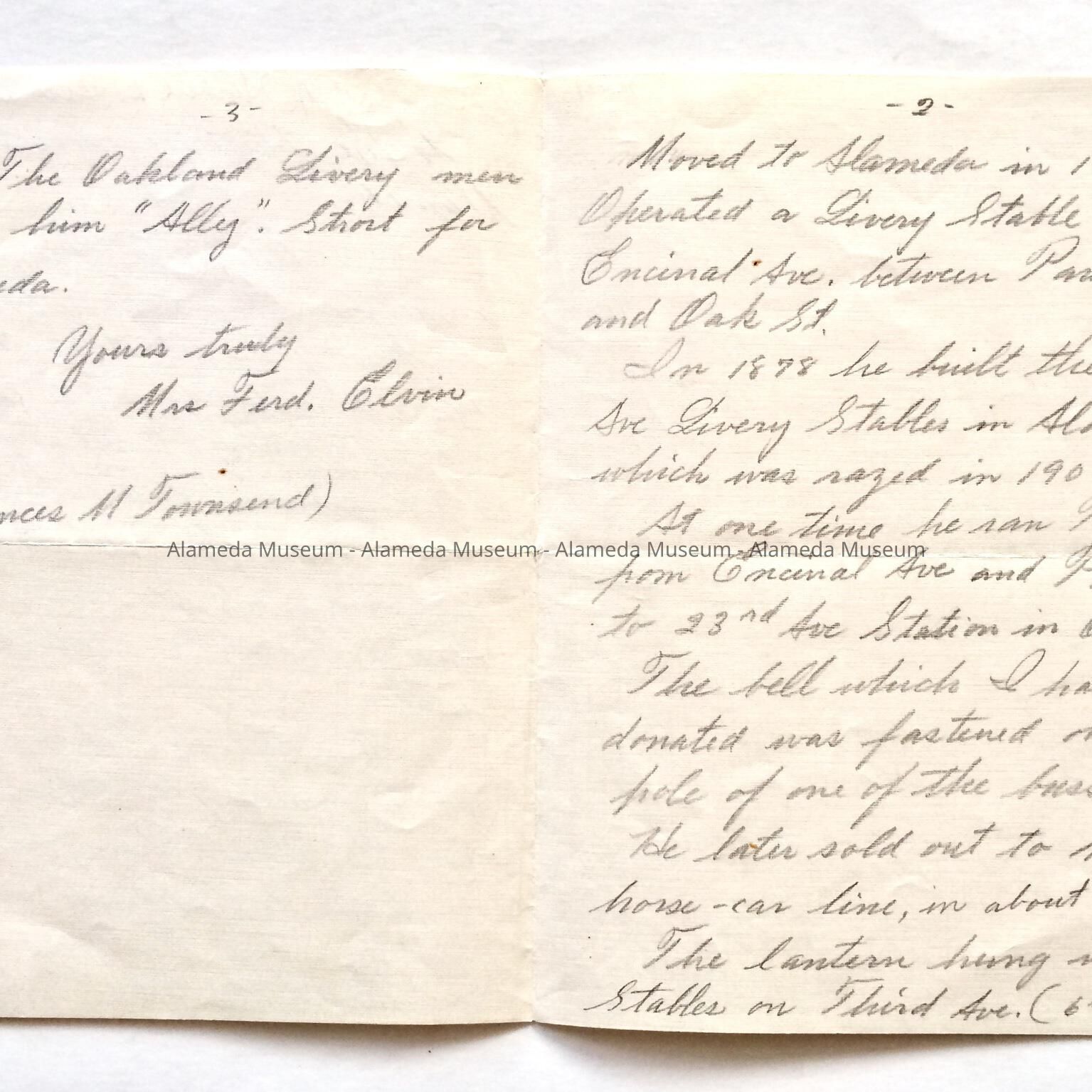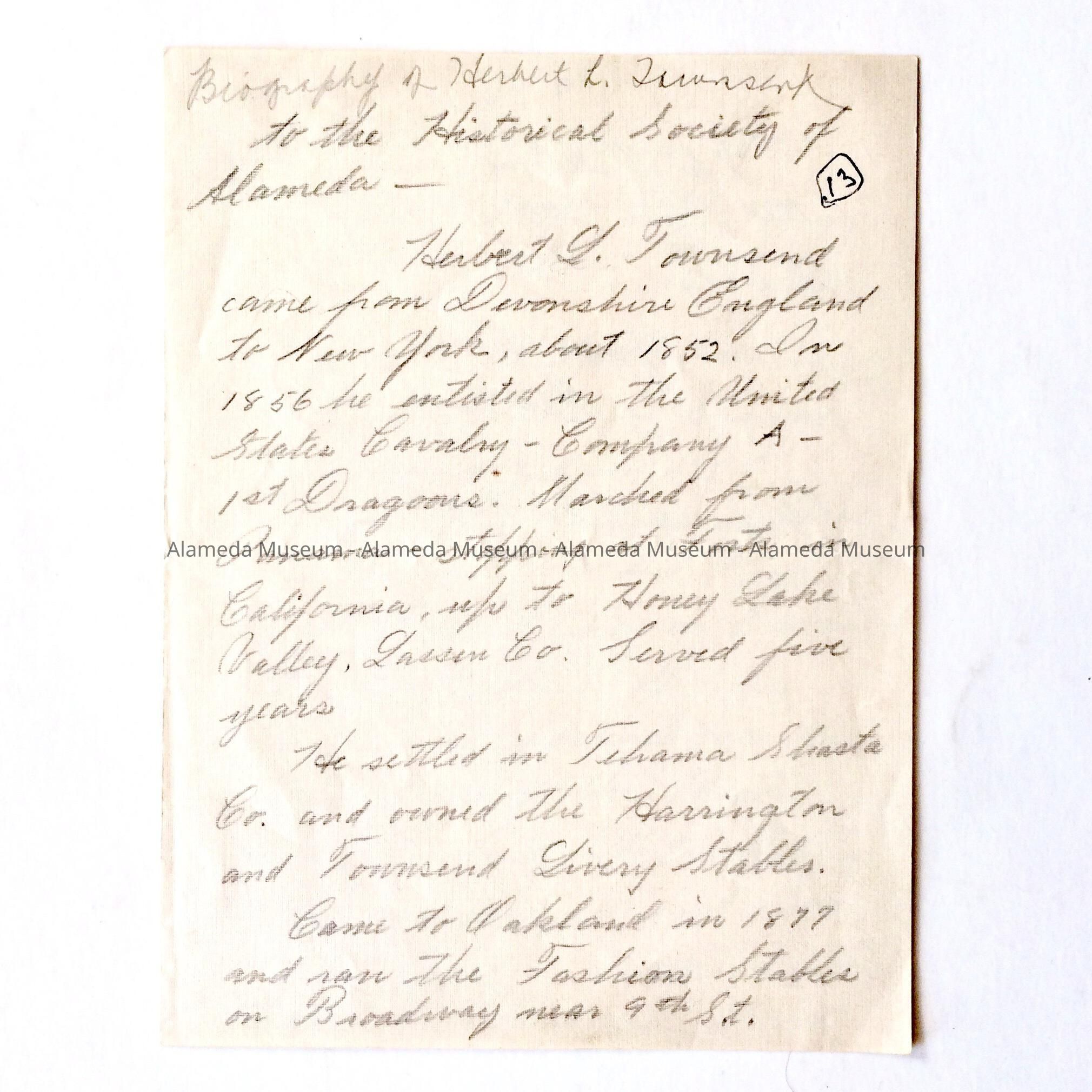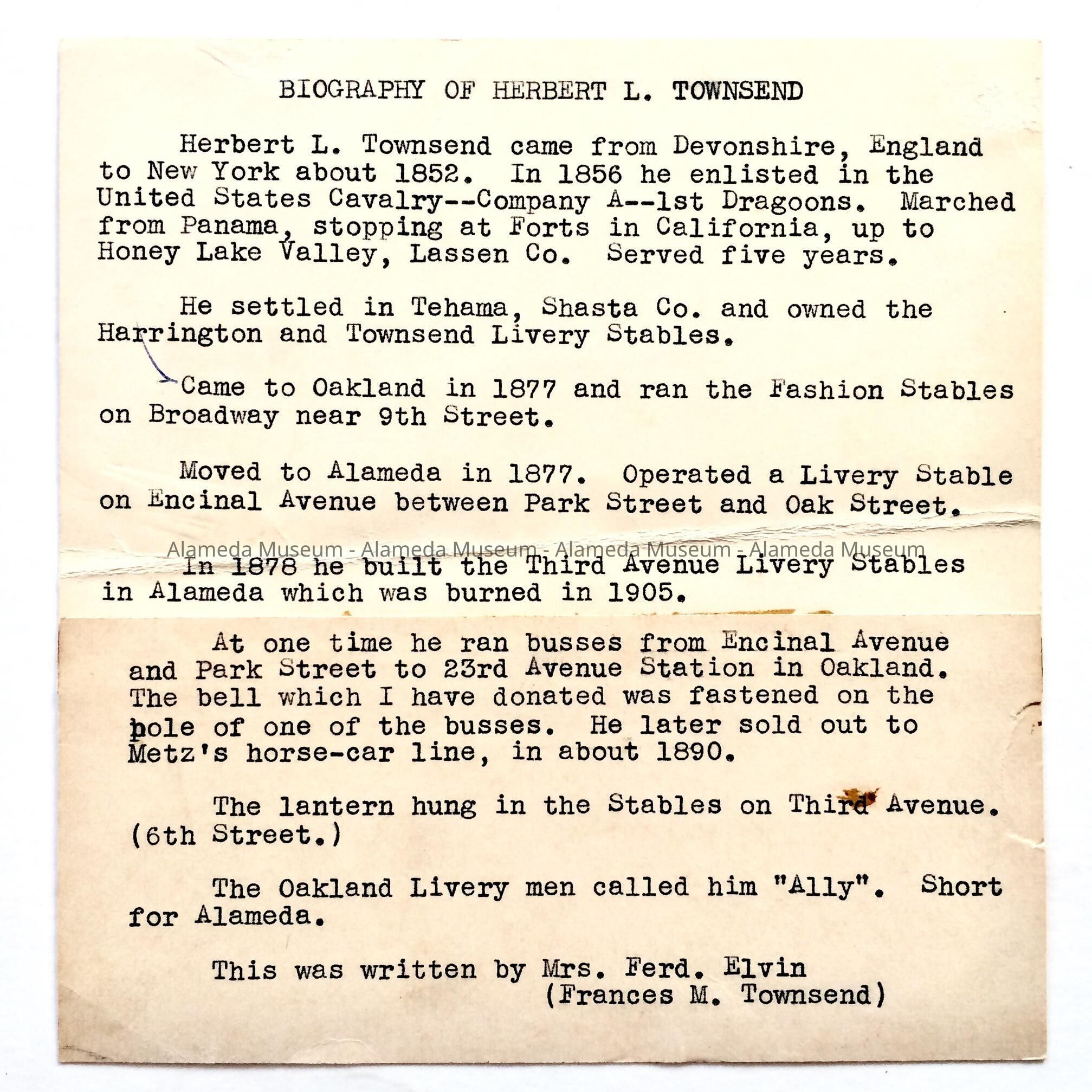 BIOGRAPHICAL SKETCH OF HERBERT L TOWNSEND, NATIVE OF ENGLAND, WHO MOVED TO ALAMEDA IN 1877. MR TOWNSEND OPERATED A LIVERY STABLE ON THIRD STREET, WEST END, ALAMEDA, CA. A LANTERN IN THE MUSEUM COLLECTION HUNG IN HIS STABLES. THE INFORMATION WAS SUPPLIED BY MRS FERD ELVIN (FORMERLY FRANCES M TOWNSEND). DOCUMENT WAS PRESENTED TO THE ALAMEDA HISTORICAL SOCIETY PRIOR TO 1971, BUT NOT CATALOGED AT THAT TIME.