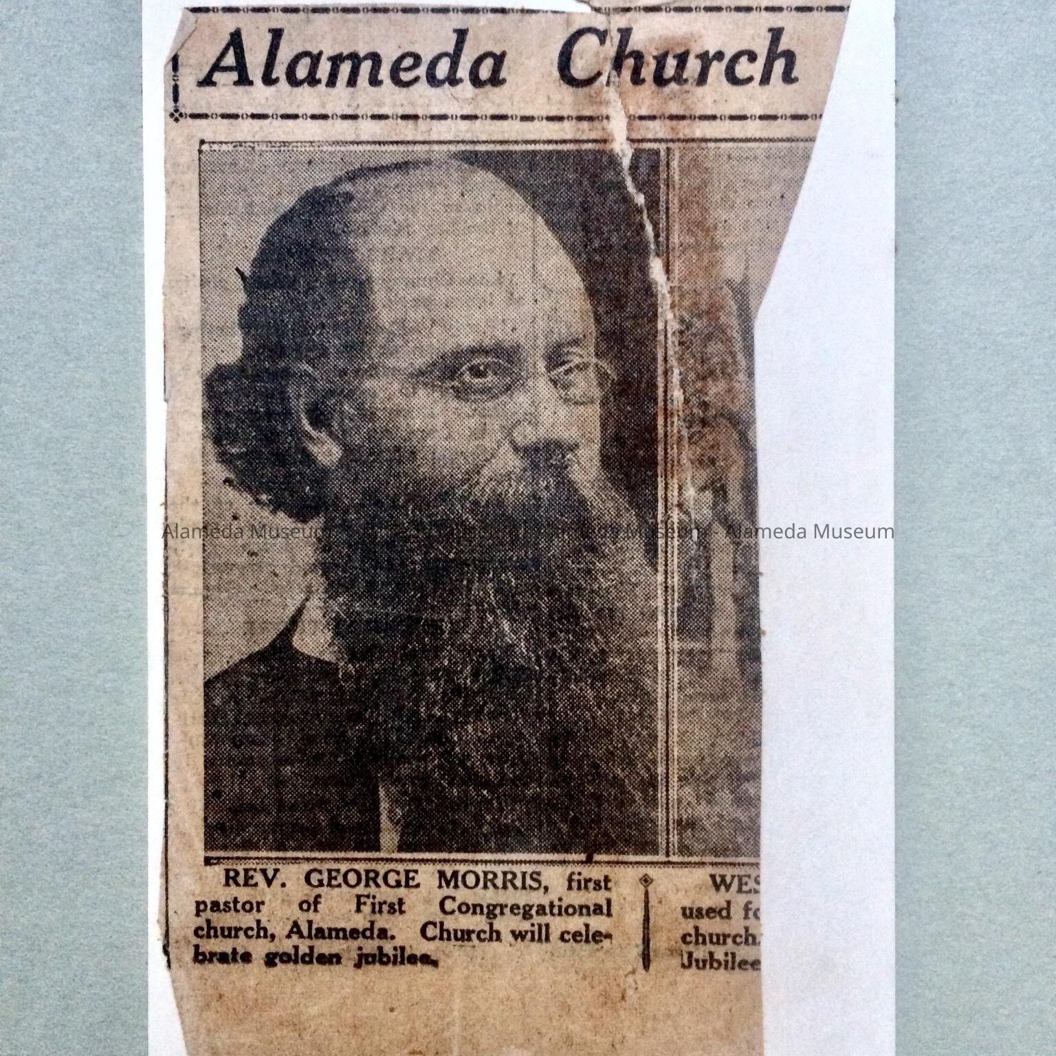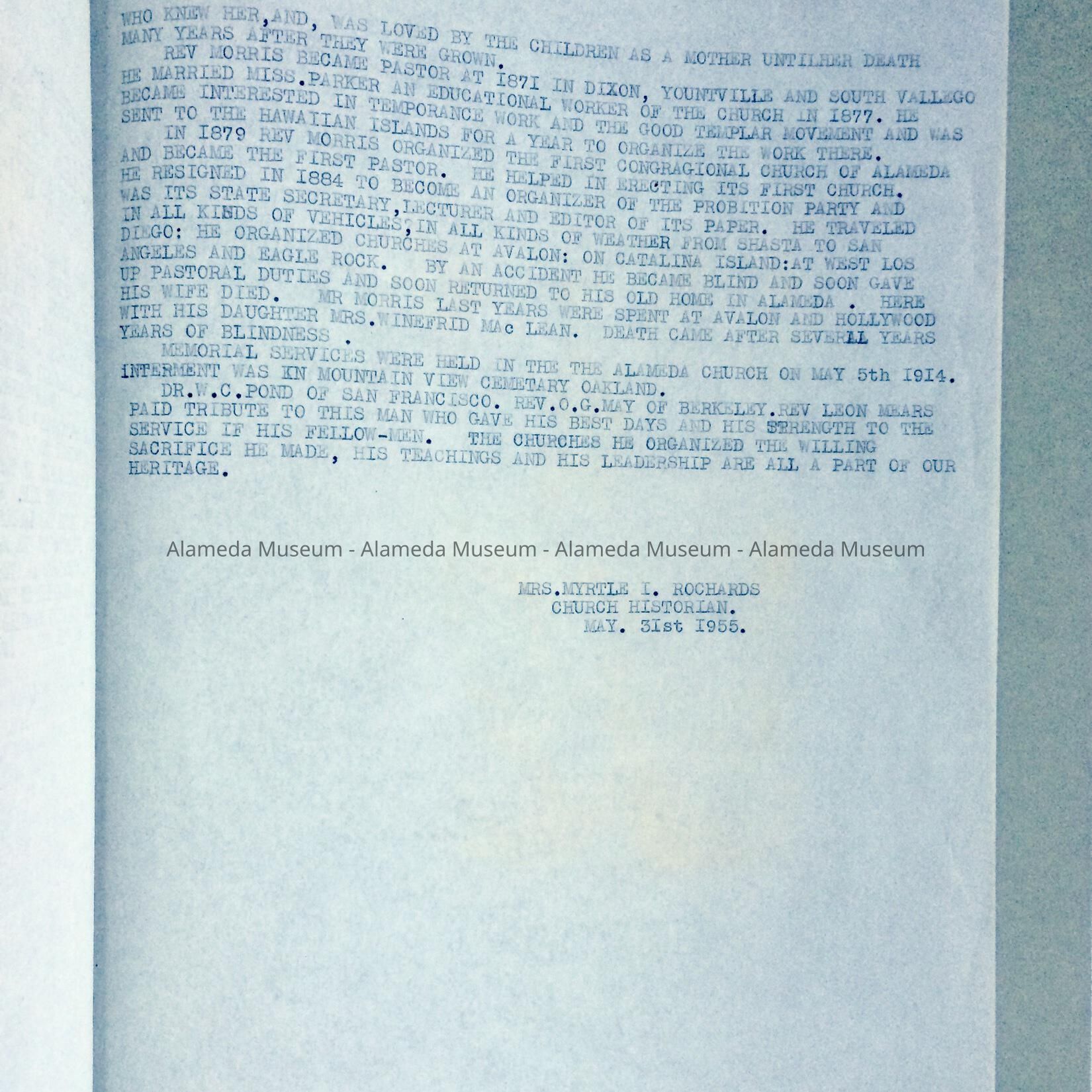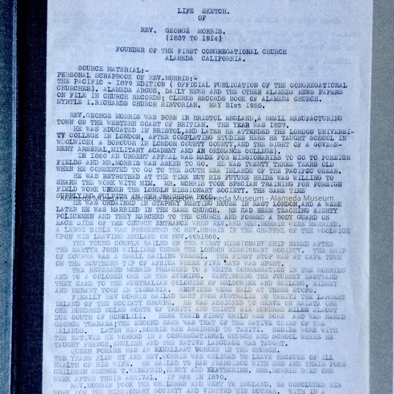Biographical sketch of Reverend George Morris 1837-1914. Reverend Morris founded the Congregational Church of Alameda in 1879. The biographical sketch was written by Myrtle Richards, Church Historian, who later became the second Curator of the Alameda Historical Society. Object to the Alameda Historical Society in 1955 and never catalogued.