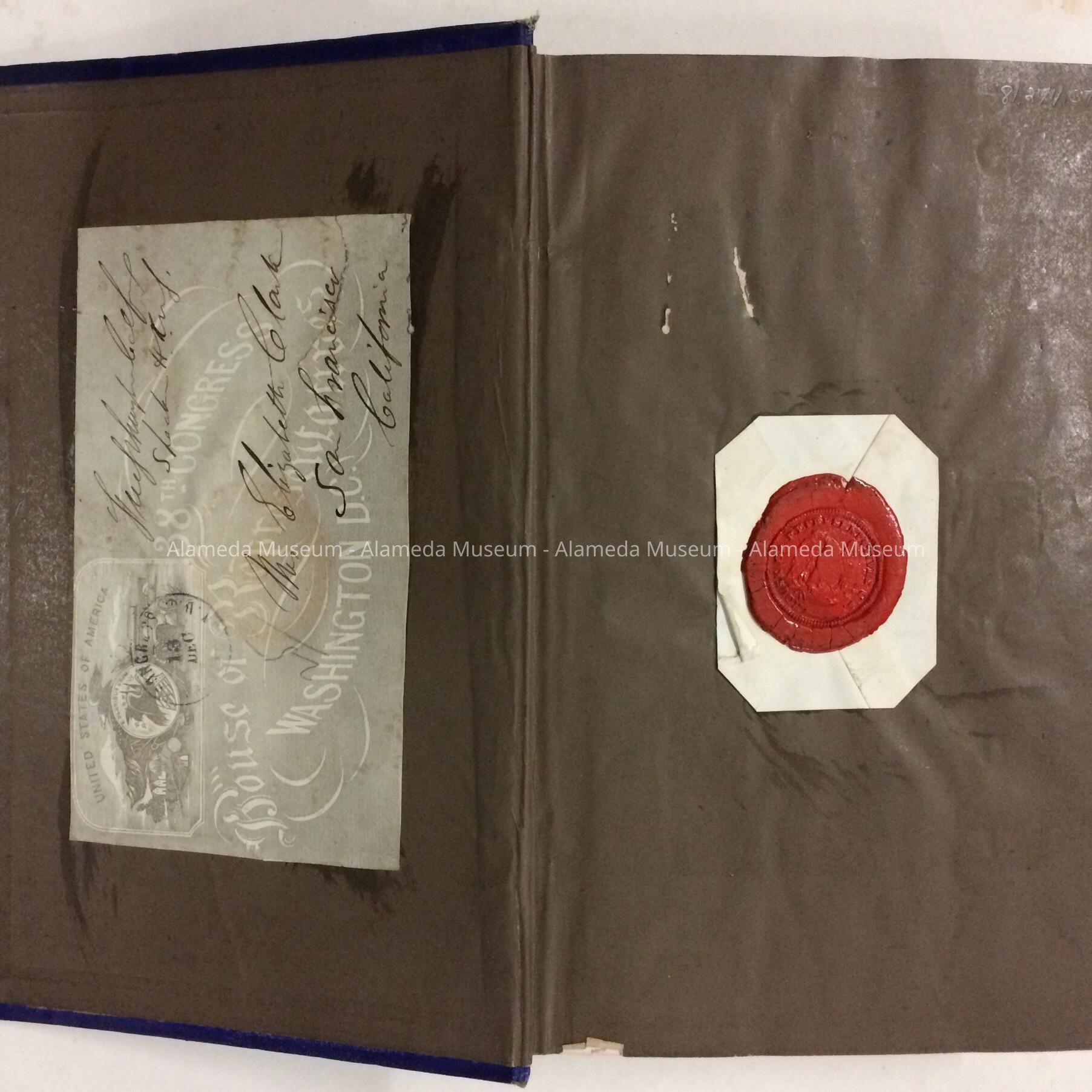 Blue binding, gold incised duplication of penman ship, "Schuyler Colfax" and on the spine it says "Life and Services of Schuyler Colfax". The interior has steel engraving of Mr. Colfax. It is also inscribed with the name "R. Frank Clark, November 14, 1868" and has an orange impressed wax seal on the front page with an eagle motif that says "House of Representatives, U.S."
