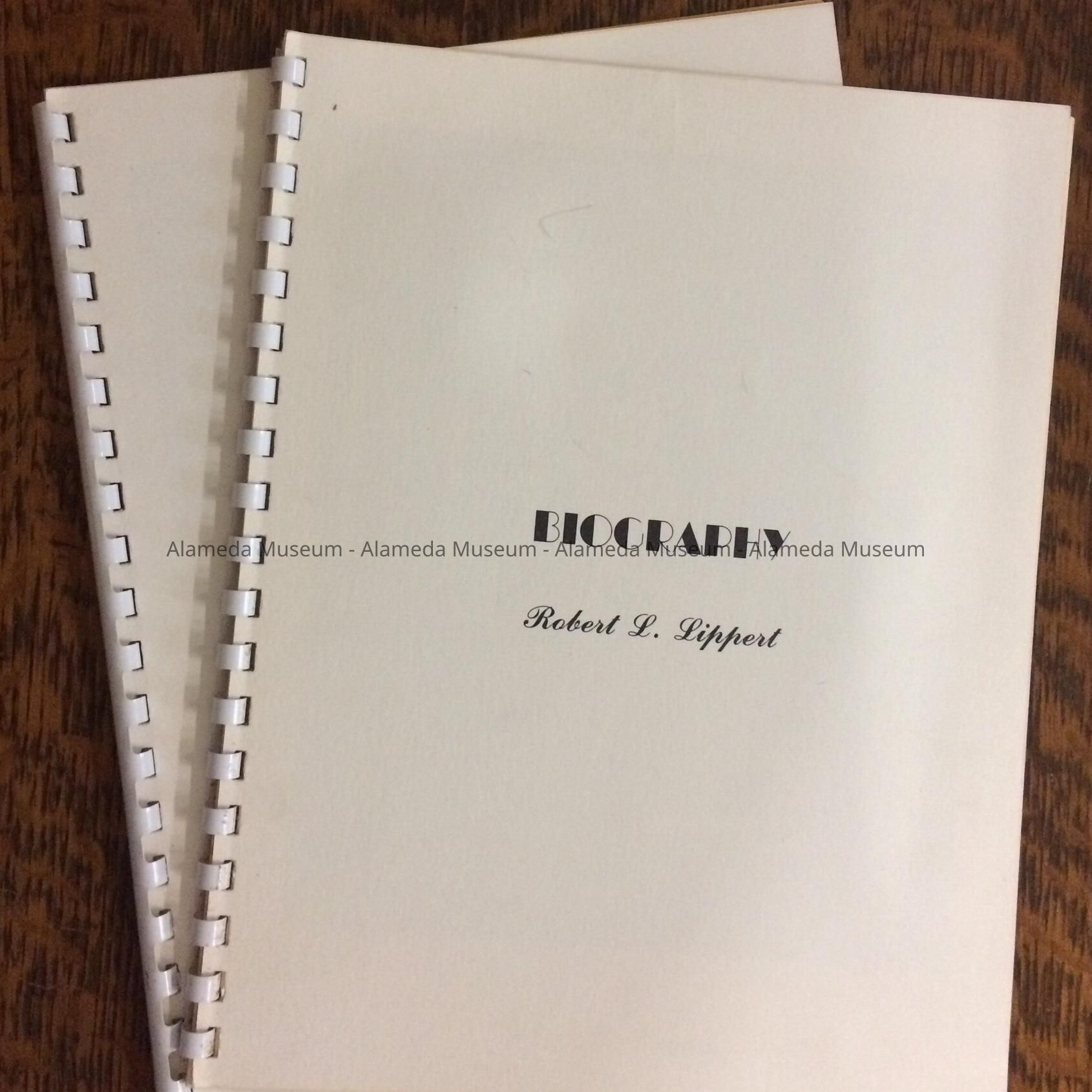 Description: Soft covered booklet with perforated spine with plastic grip. First page has a photographic portrait. Cover of the book has "Biography Robert L. Lippert".