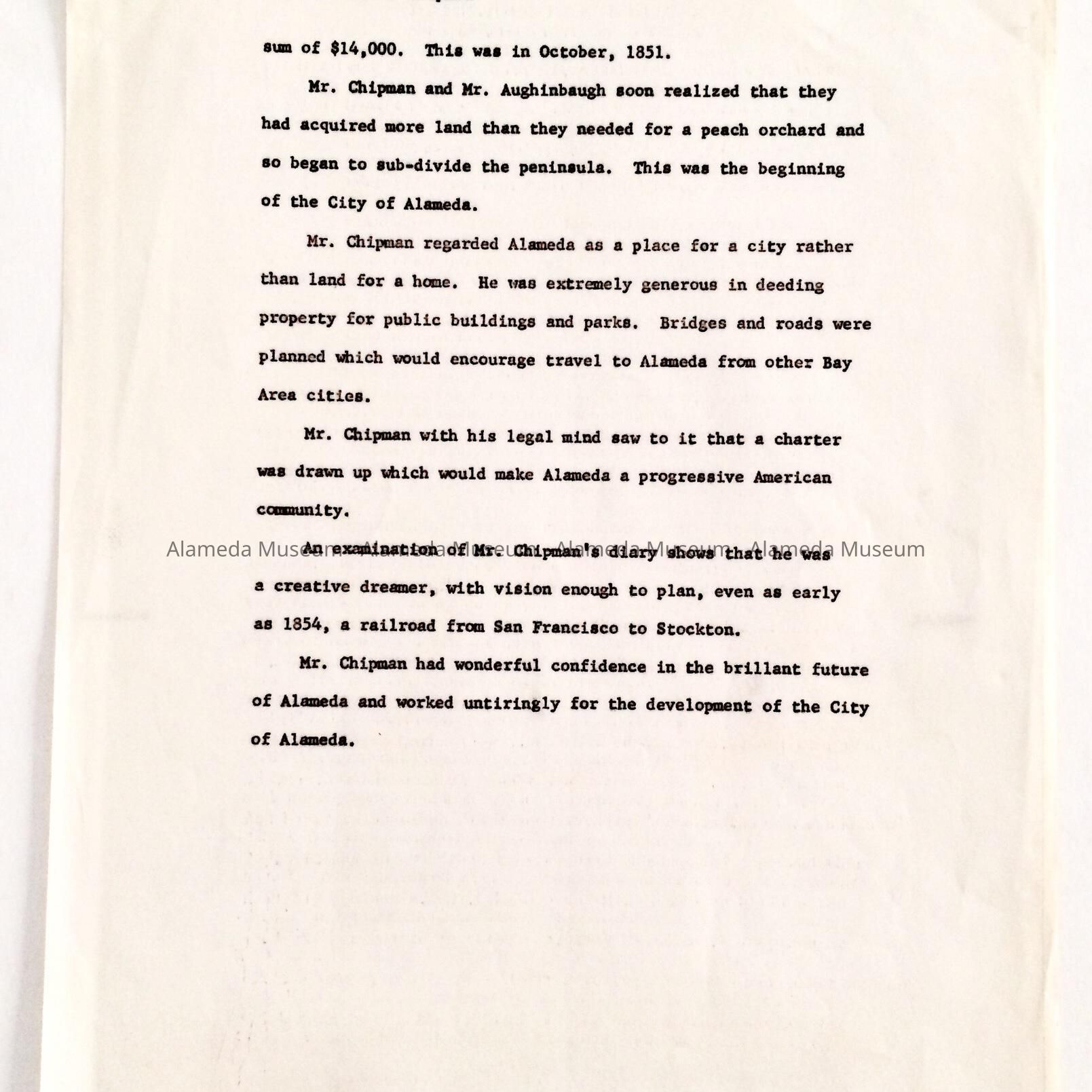 History: Biographical sketch of William Worthington Chipman, co-founder of the City of Alameda. This particular sketch was adapted for the Instructional Materials Center, Alameda Unified School District and dated April 19, 1965. Given to the Alameda Historical Museum prior to 1971 and never catalogued.