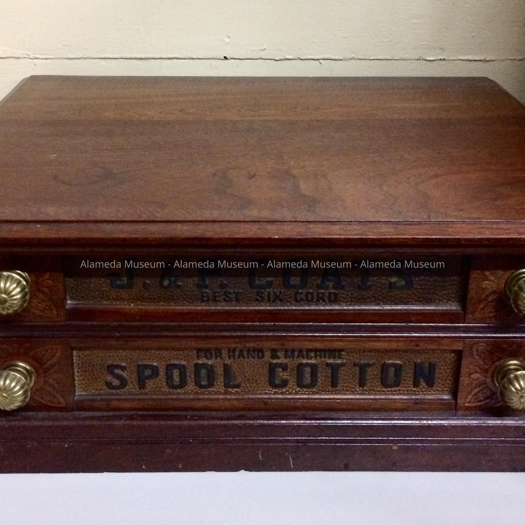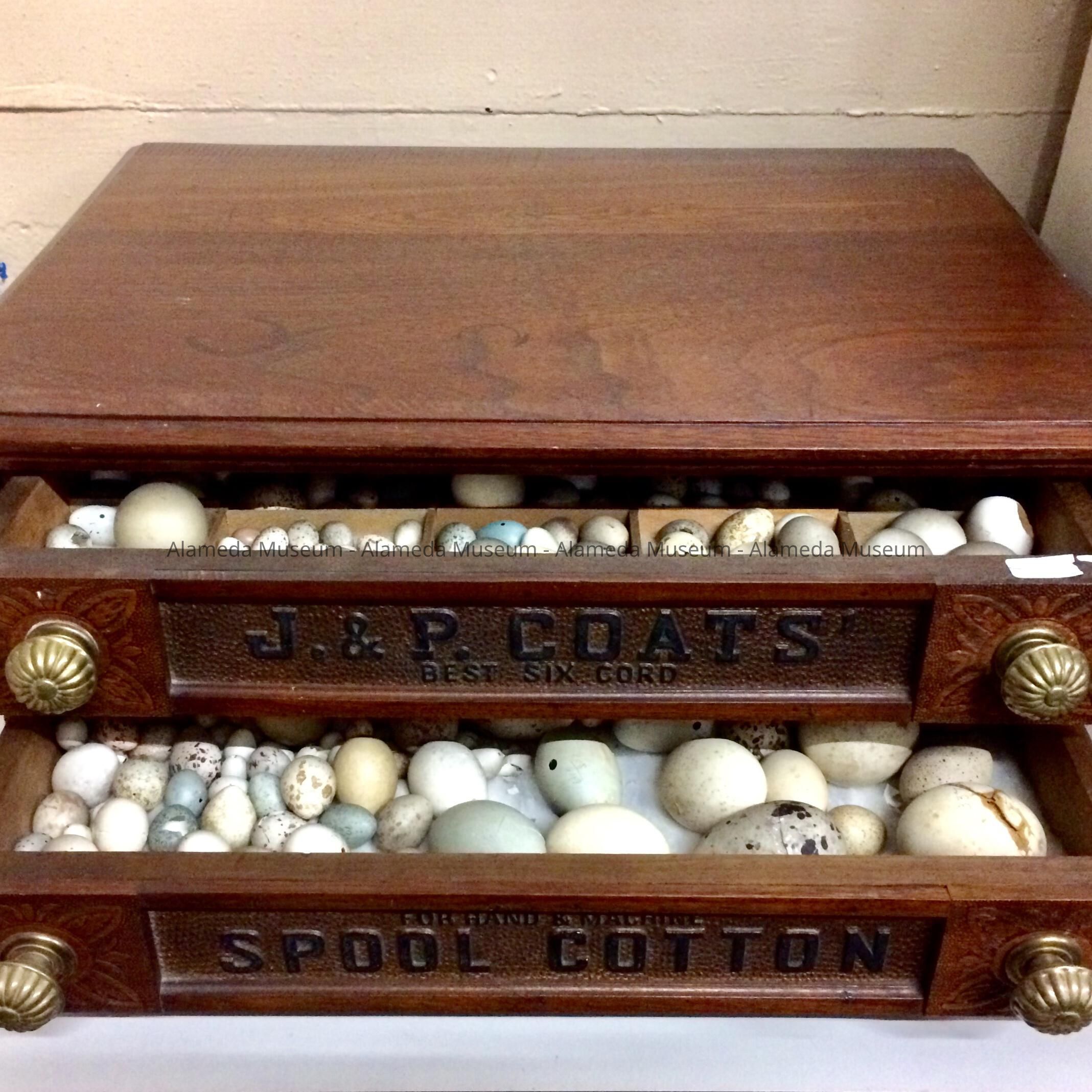 Description: A bird eggs collection housed in a retail thread cabinet (a 2-drawer J & P Coats product) with brass pulls. The drawers have the embossed caption "J & P Coats Spool Cotton". The cabinet appears to be made of walnut with its original finish. The drawers contain various sized birds' eggs in a multitude of colors.