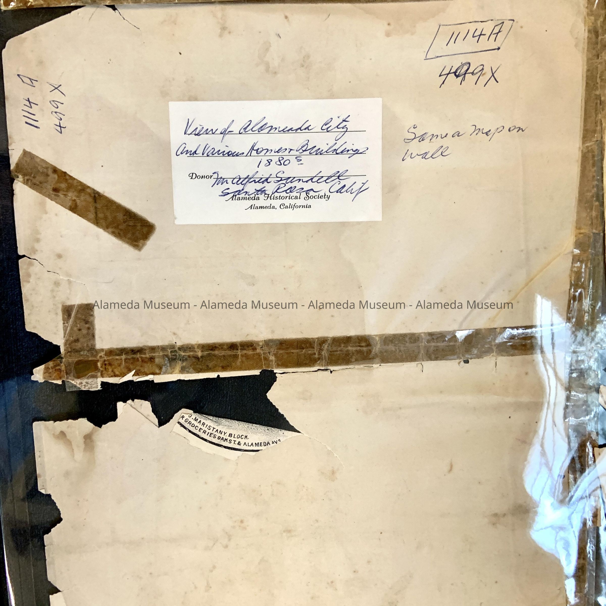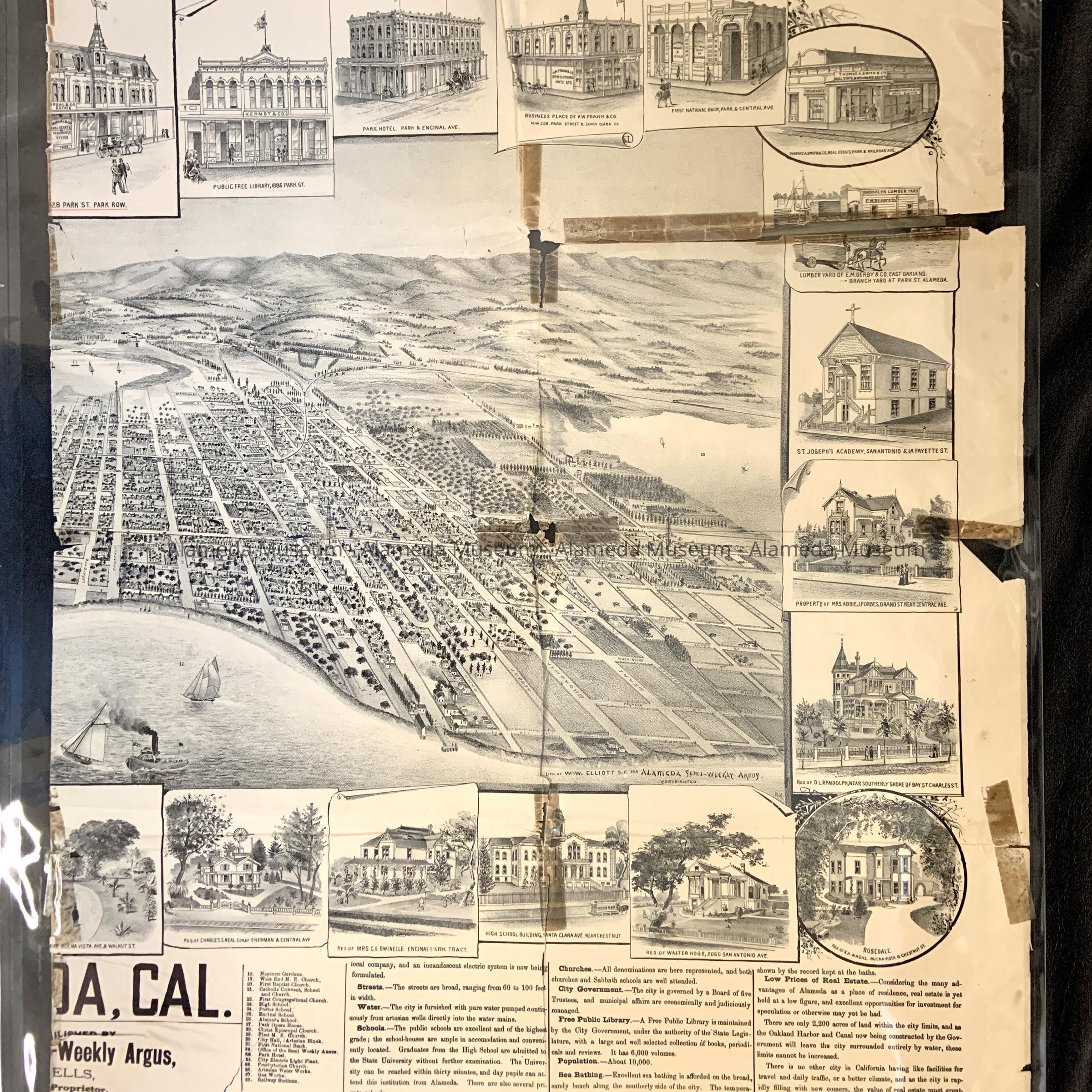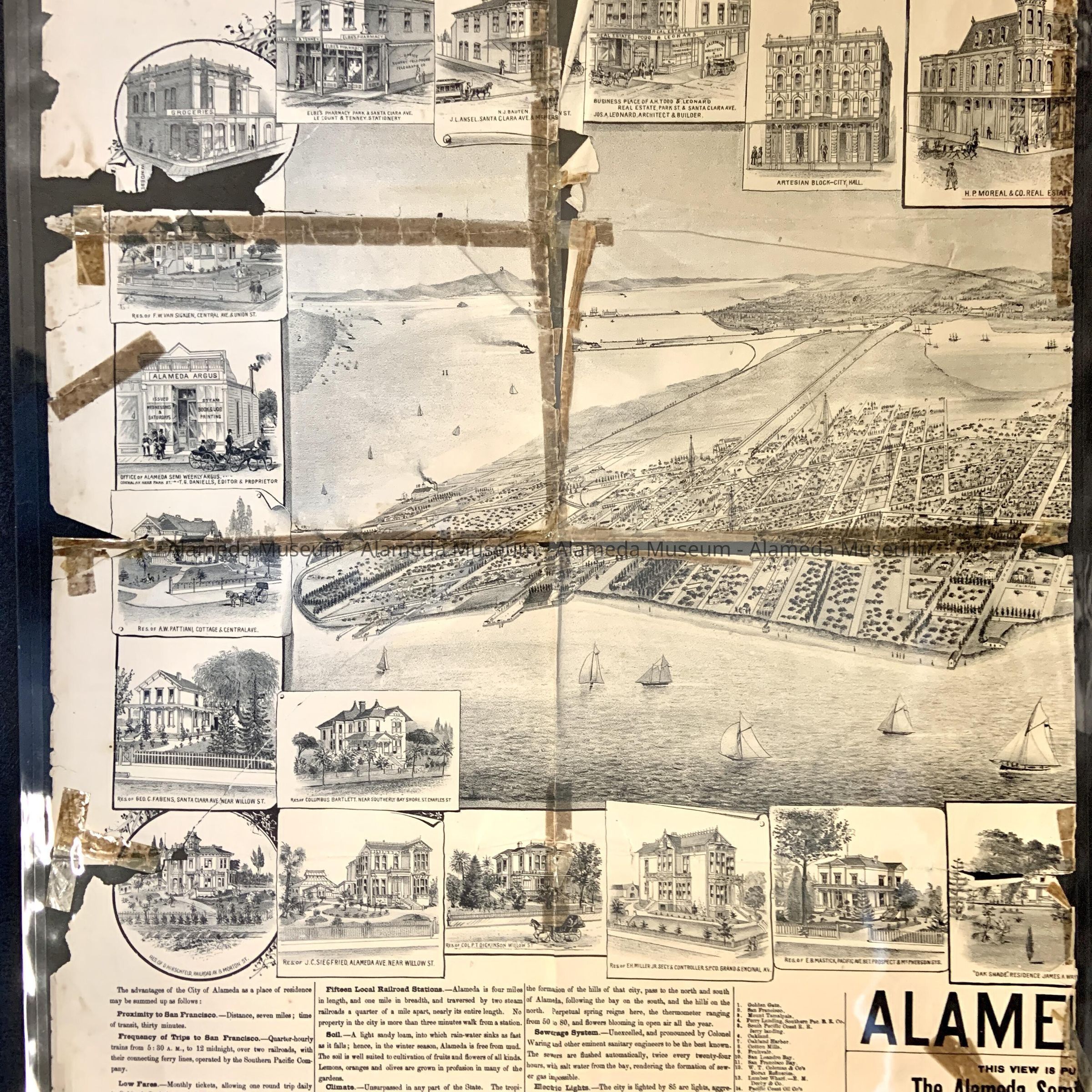History: Original copies much deteriorated and mended with tape of the 1887-88 map of the City of Alameda. Illustration issued by the Alameda artists.