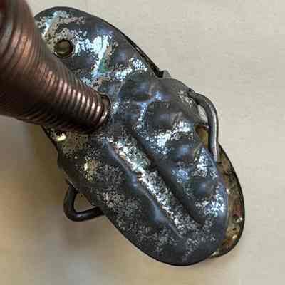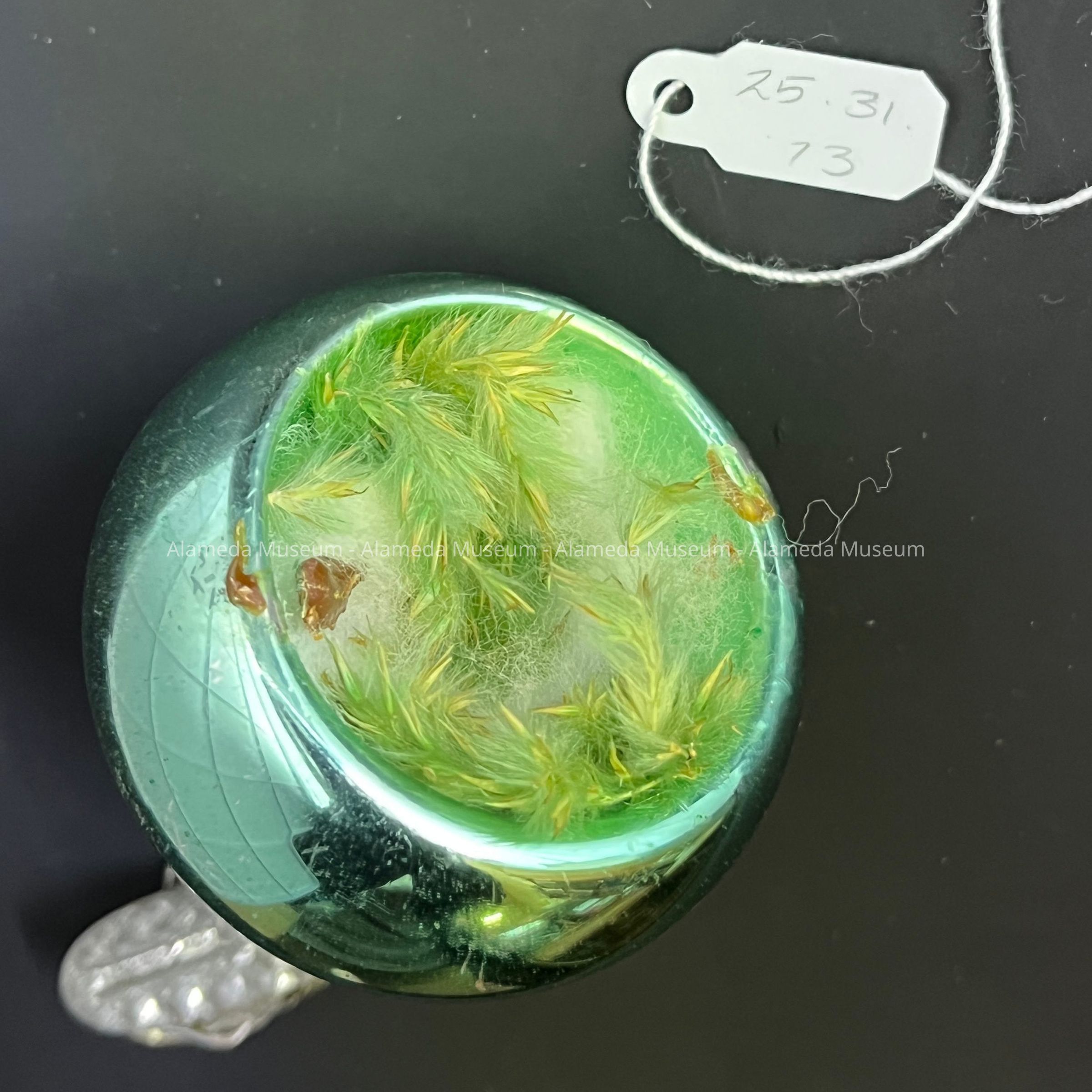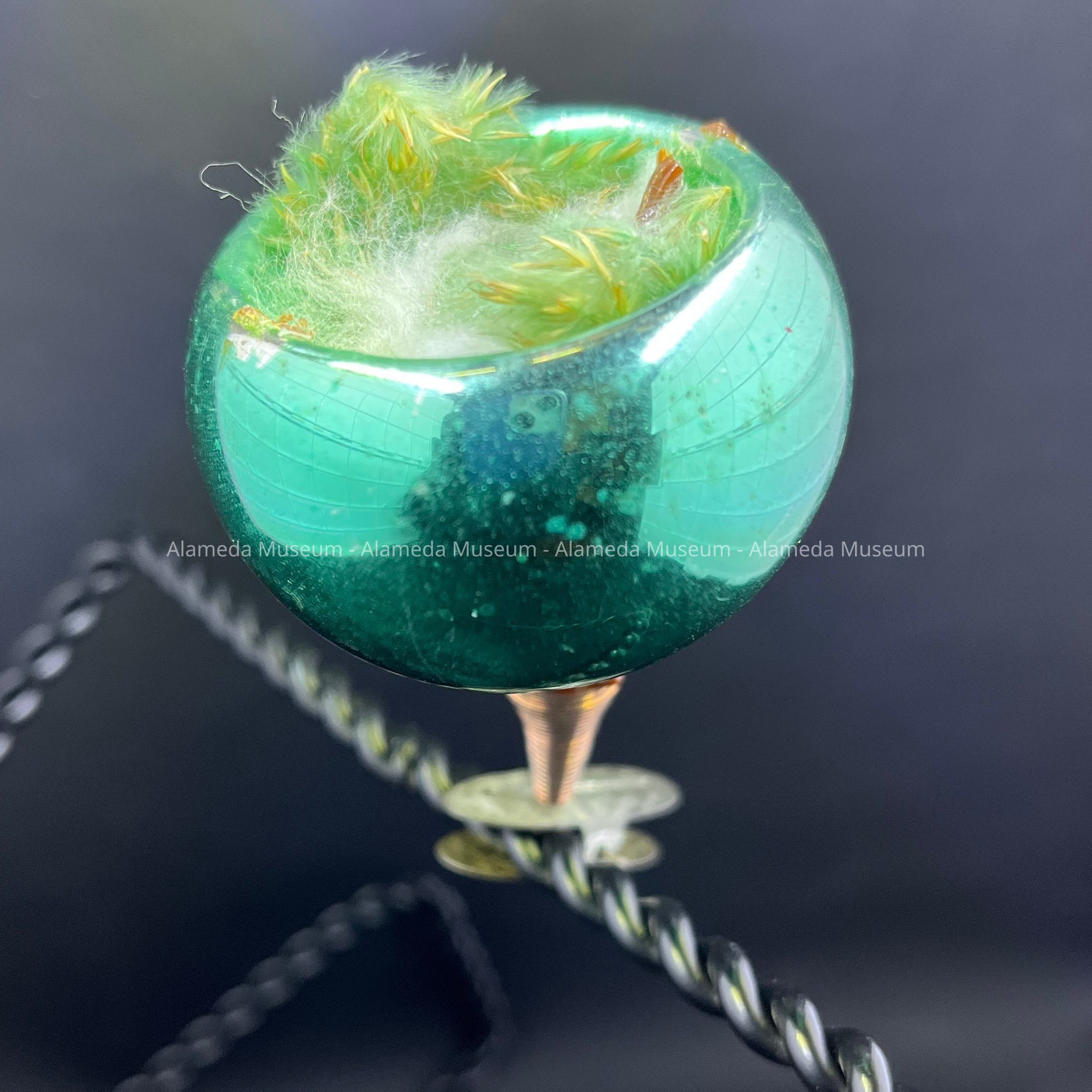 Description: A glass ornament in the shape of a half ball with indent, painted metallic green, with green-painted and white down feathers inside the insert, simulating a bird's nest. The ball is mounted on a metal clip, originally silver-colored by now heavily oxidized, and a red-copper spring. The clip has embossed lettering - now unreadable due to oxidation.