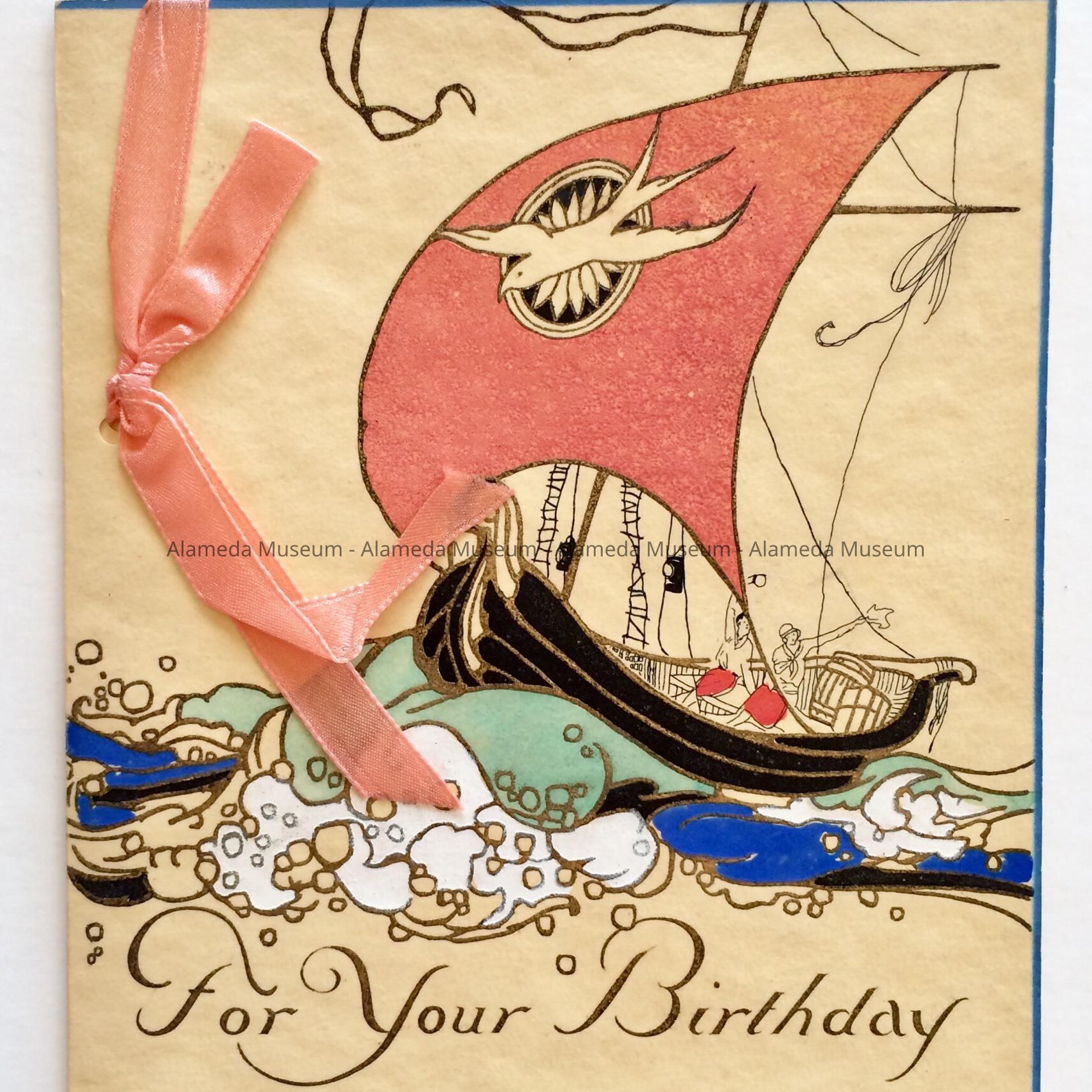 GREETING CARD, COVERLET STYLE, WITH COVER SECURED BY PINK SILK RIBBON. ILLUSTRATION CONSISTS OF SAIL BOAT AND CAPTION, "FOR YOUR BIRTHDAY."