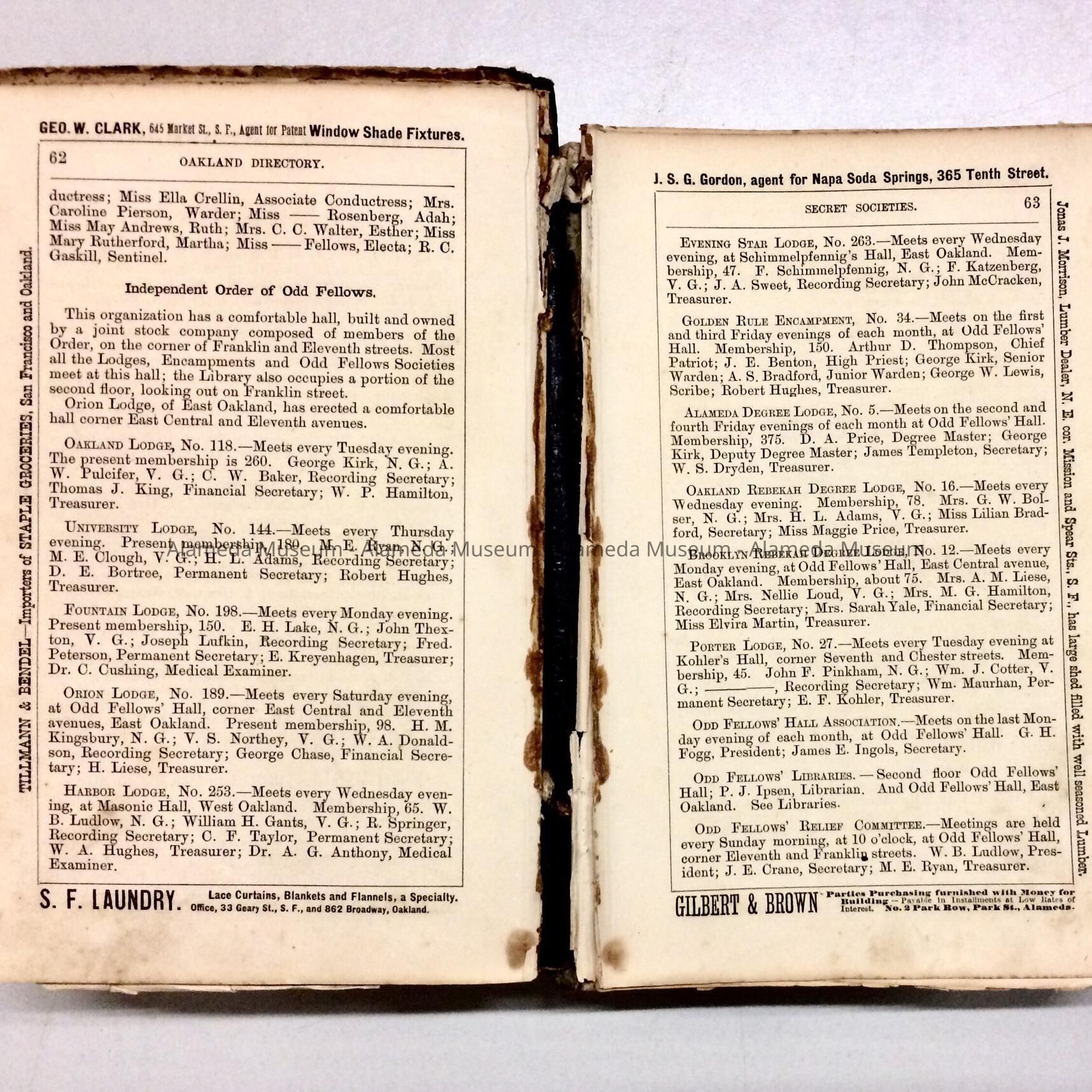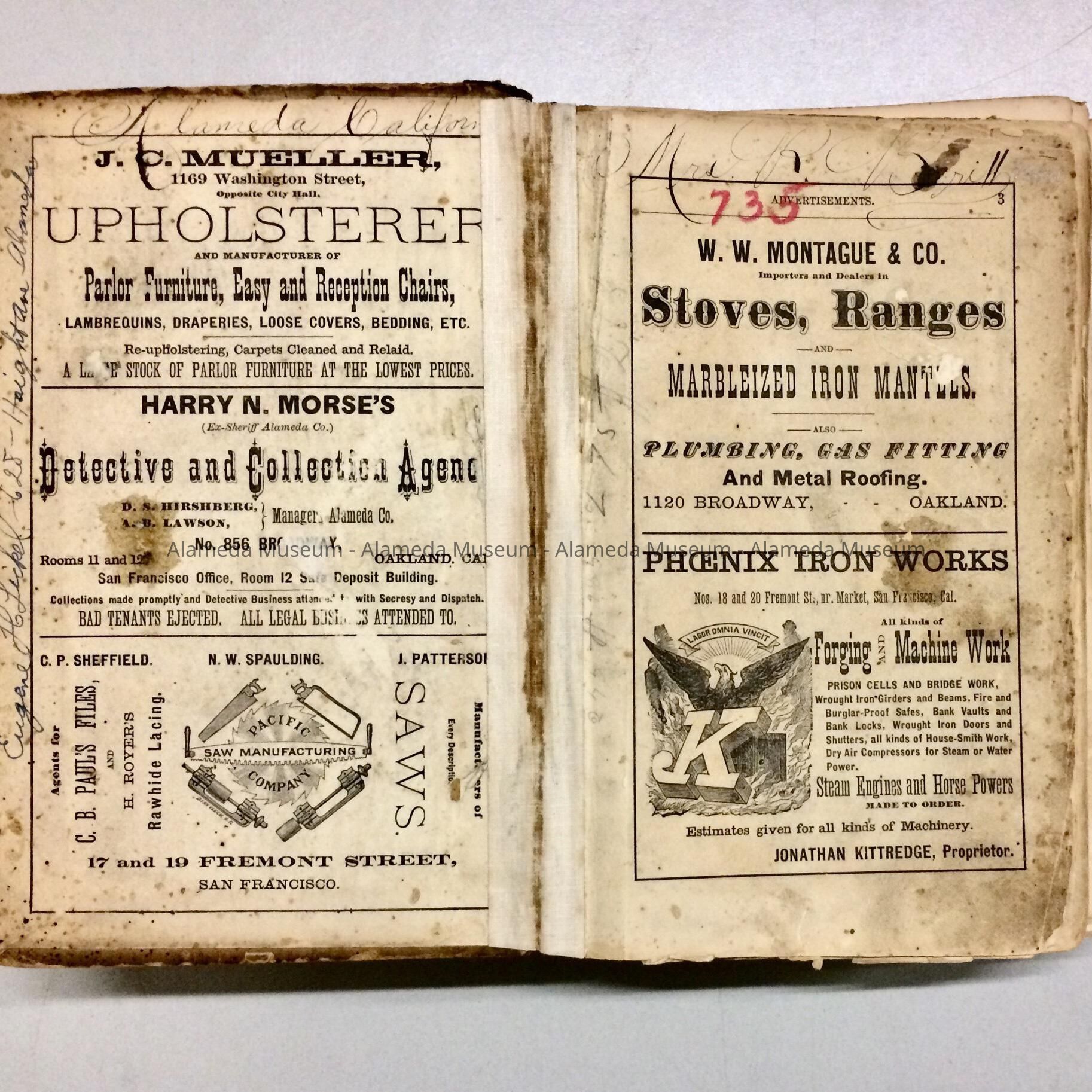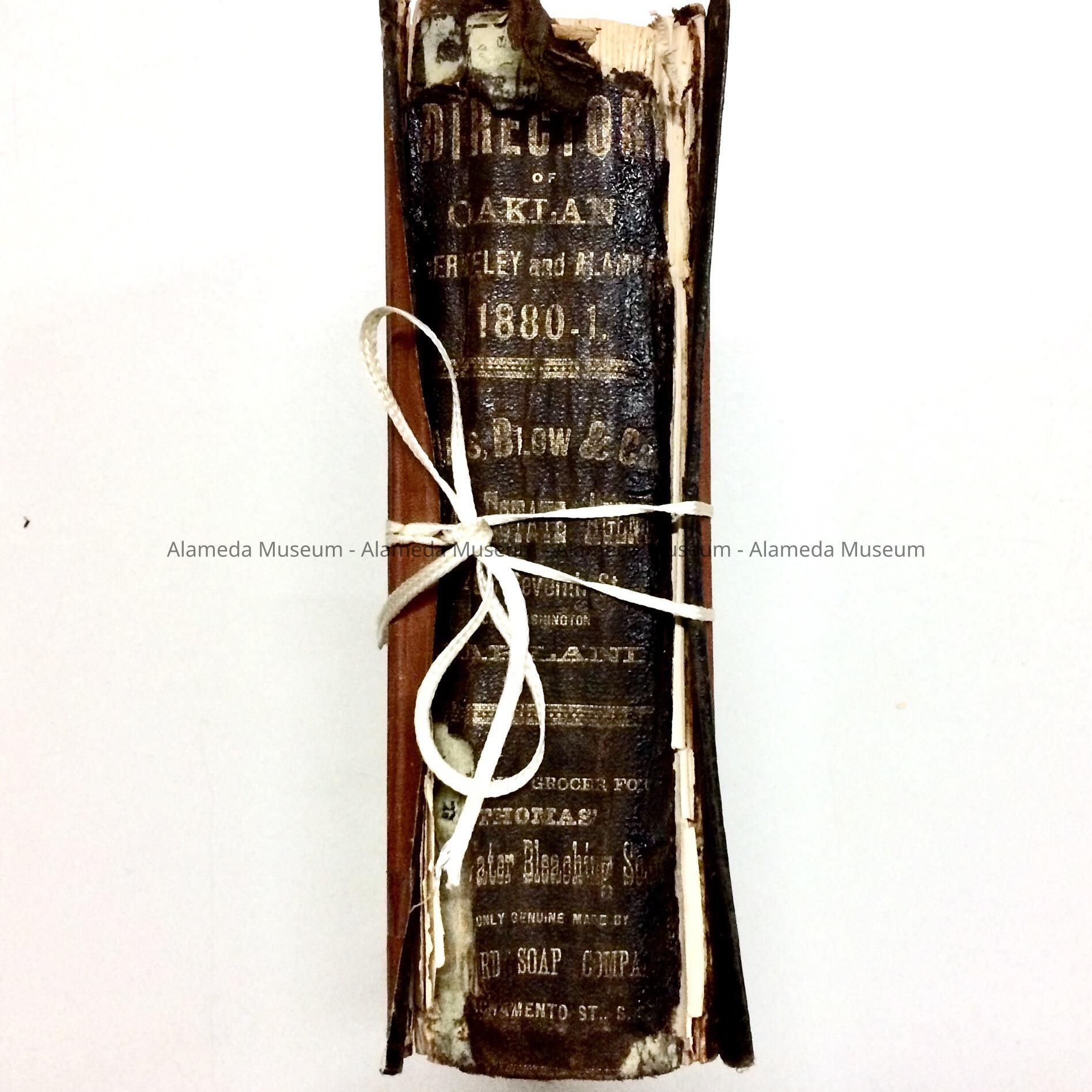 BISHOP'S OAKLAND DIRECTORY FOR 1880-1881, CONTAINING A BUSINESS DIRECTORY, STREET GUIDE, ETC. ALSO INCLUDES DIRECTORIES OF BERKELEY AND OAKLAND. VOLUME ORIGINALLY BELONGED TO MRS PATRICK BRITT, PIONEER RESIDENT OF THE WEST END OF ALAMEDA. PAGE 559 CONTAINS A BRIEF DESCRIPTION OF ALAMEDA AND A LIST OF LOCAL RESIDENTS (COMPILED ALPHABETICALLY). THE VOLUME WAS GIVEN IN 1955, NUMBERED "735," AND NOT CATALOGED AT THAT TIME.