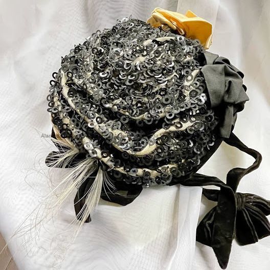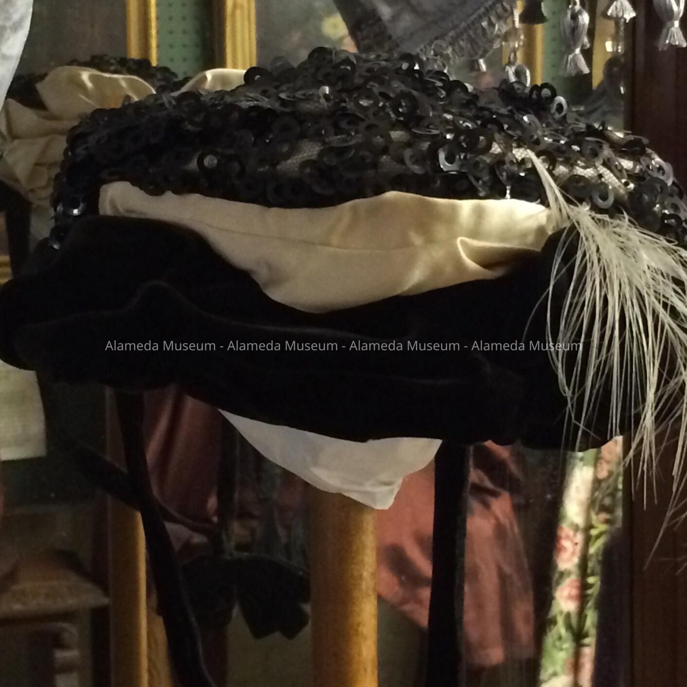Evening hat of black velvet with a trim of off-white satin and sequined gauze. Circa 1890's. Worn by Mrs. Henry H. Meyers.