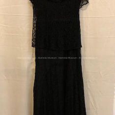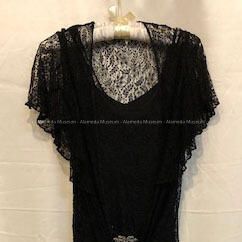 a) Black dress of rayon lace has a scooped neck, dropped waist, full skirt, and is sleeveless.