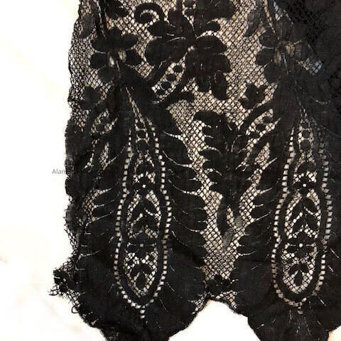 Description: Approx: 4 yards of machine made black lace for clothing. Appears to be for a skirt with a scalloped design at hemline.