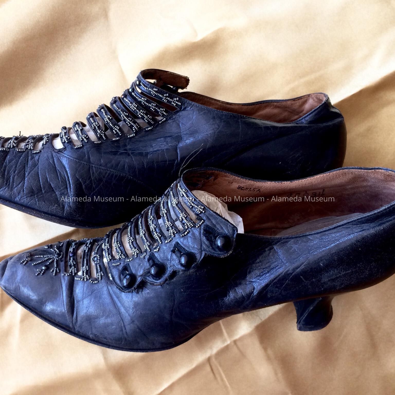 Black leather shoes with straps with 4 buttons and beads, c. 1908-1910Entry/Object ID
