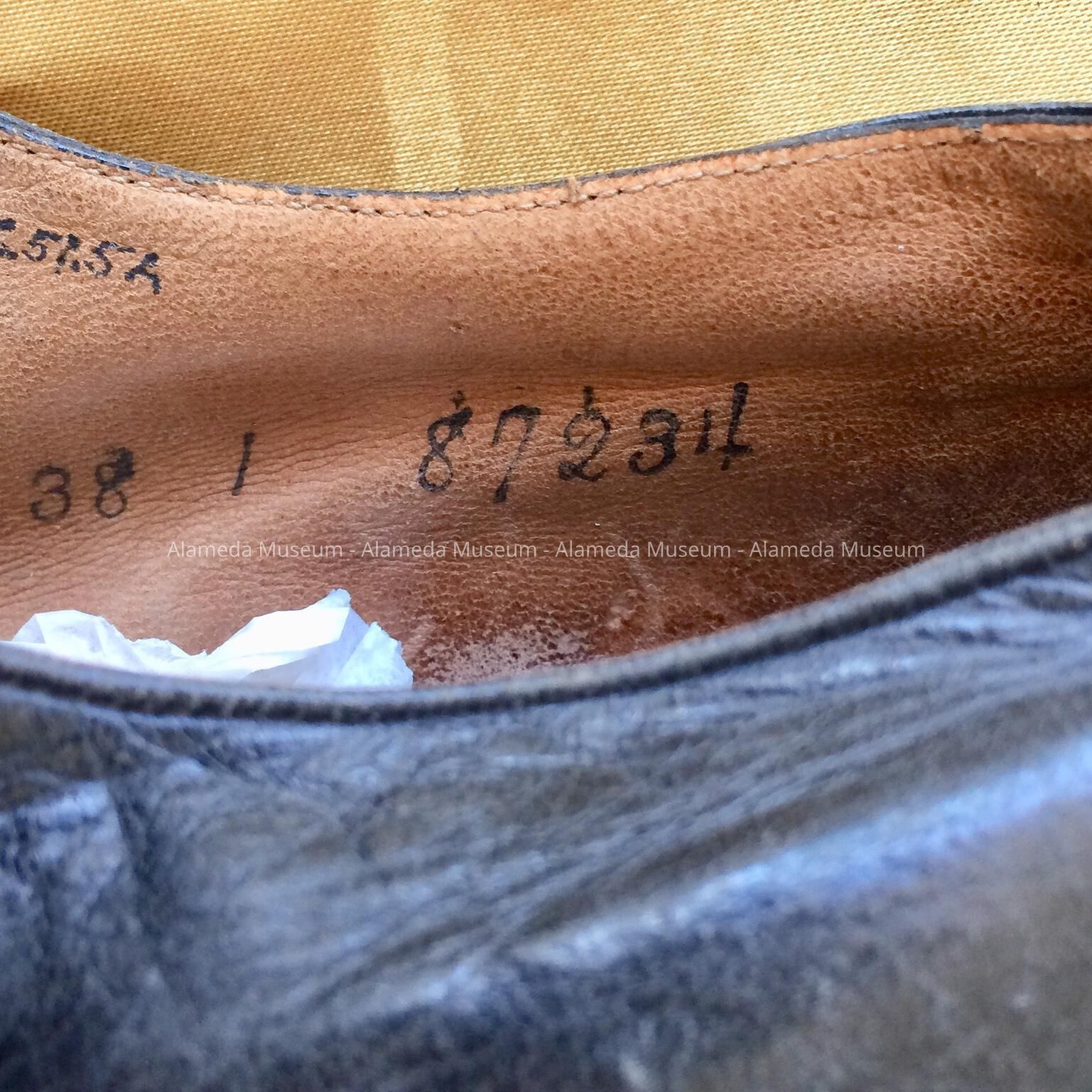 Black colored leather shoes with straps across the insteps secured by 4 buttons. Open work on insteps decorated with steel cut beads. The interior of both shoes printed with serial numbers 38-1, 87234. French heels.