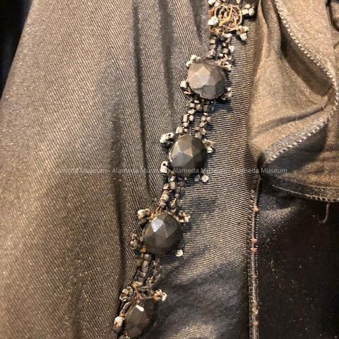 (glass) bead trim. Satin or organdy ruffles as trim. Lining of silk brocade (with pattern).