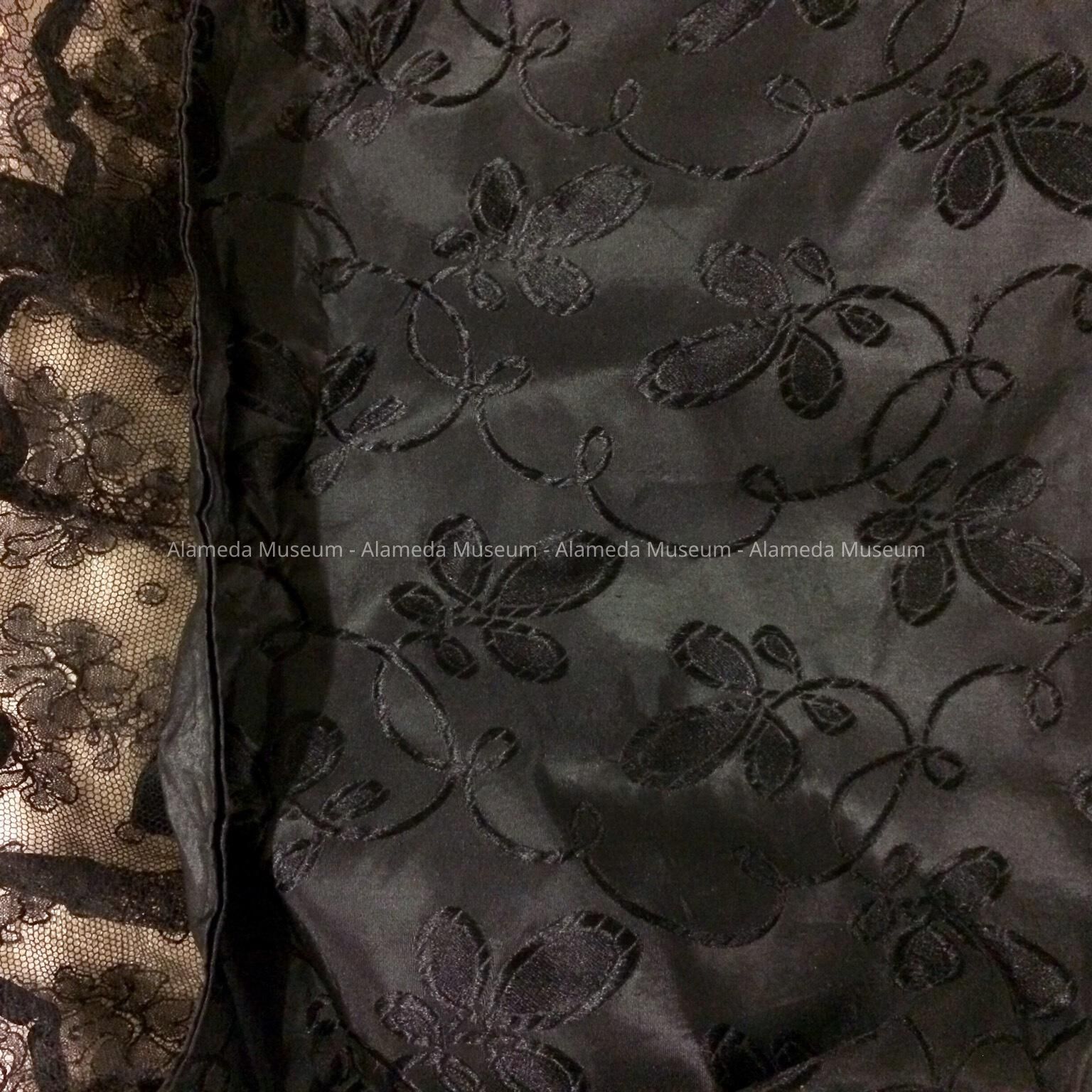 Description: Drawstring type purse made of black colored patterned silk with black lace trim around bag opening. Black silk ribbon used for drawstrings.