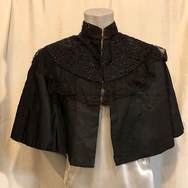 DESCRIPTION: A CAPELET OF BLACK COLORED SILK. UPPER BODICE OF THE CAPE APPEARS TO BE FAILLE, ACCENTUATED WITH JET BEADING. UPPER PART IS ALSO TRIMMED IN GATHERED BLACK COLORED LACE. GARMENT IS SECURED BY HOOK AND EYE.