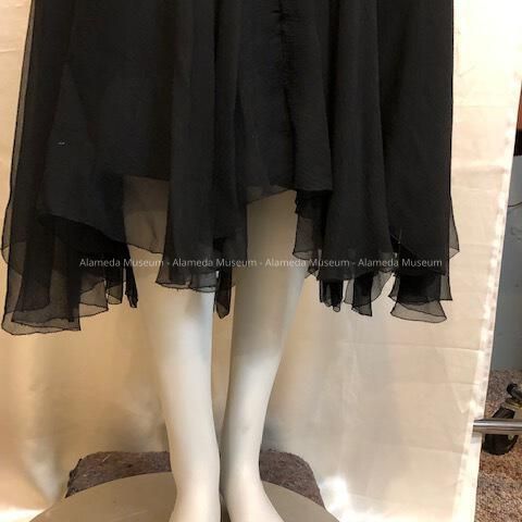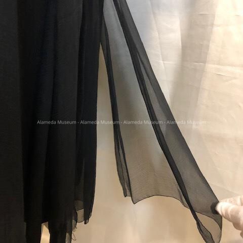 Description: Black silk chiffon evening dress lined with sateen, with rounded collar with attached asymmetrical shawl/scarf; dropped waist; rear slits; with a solid black silk underslip