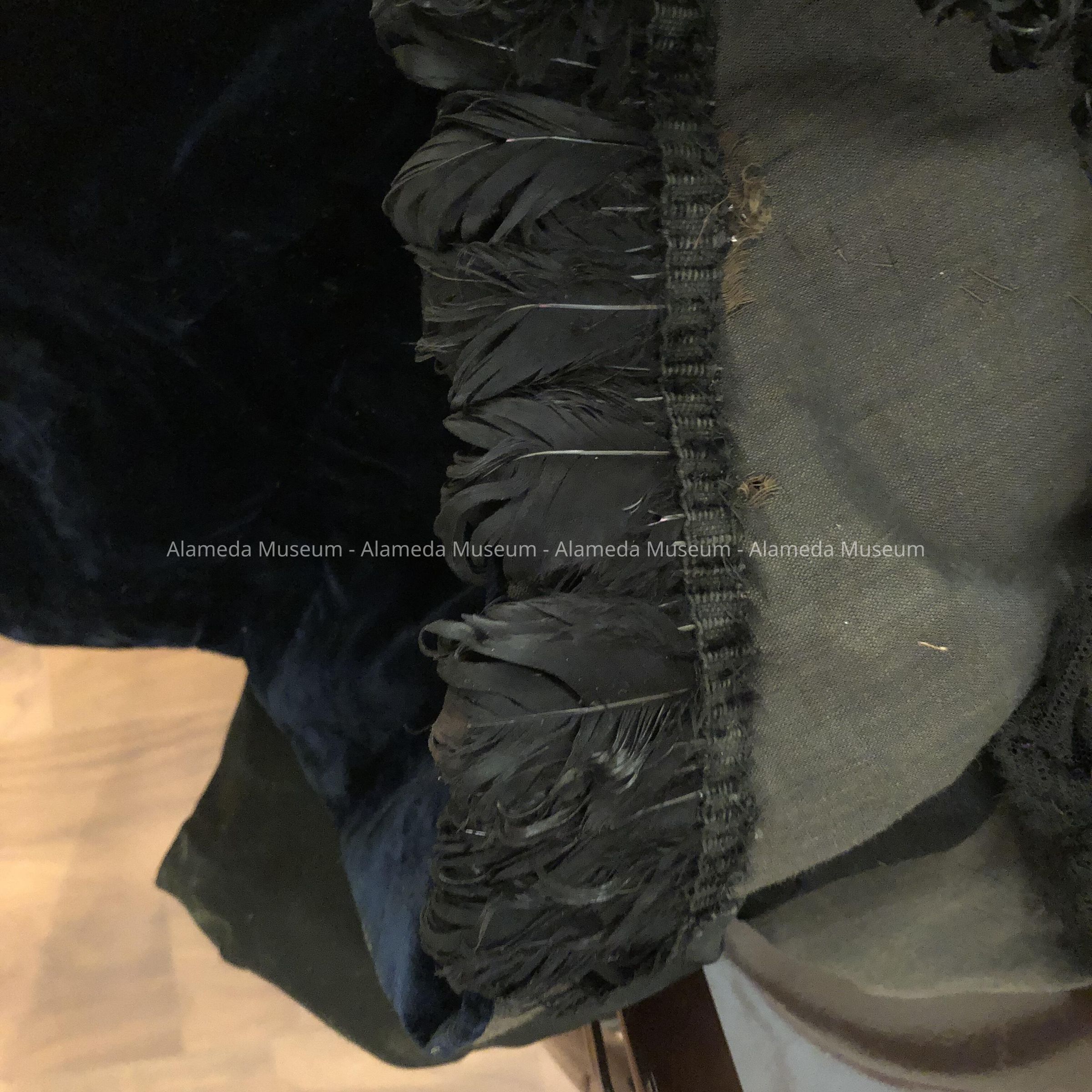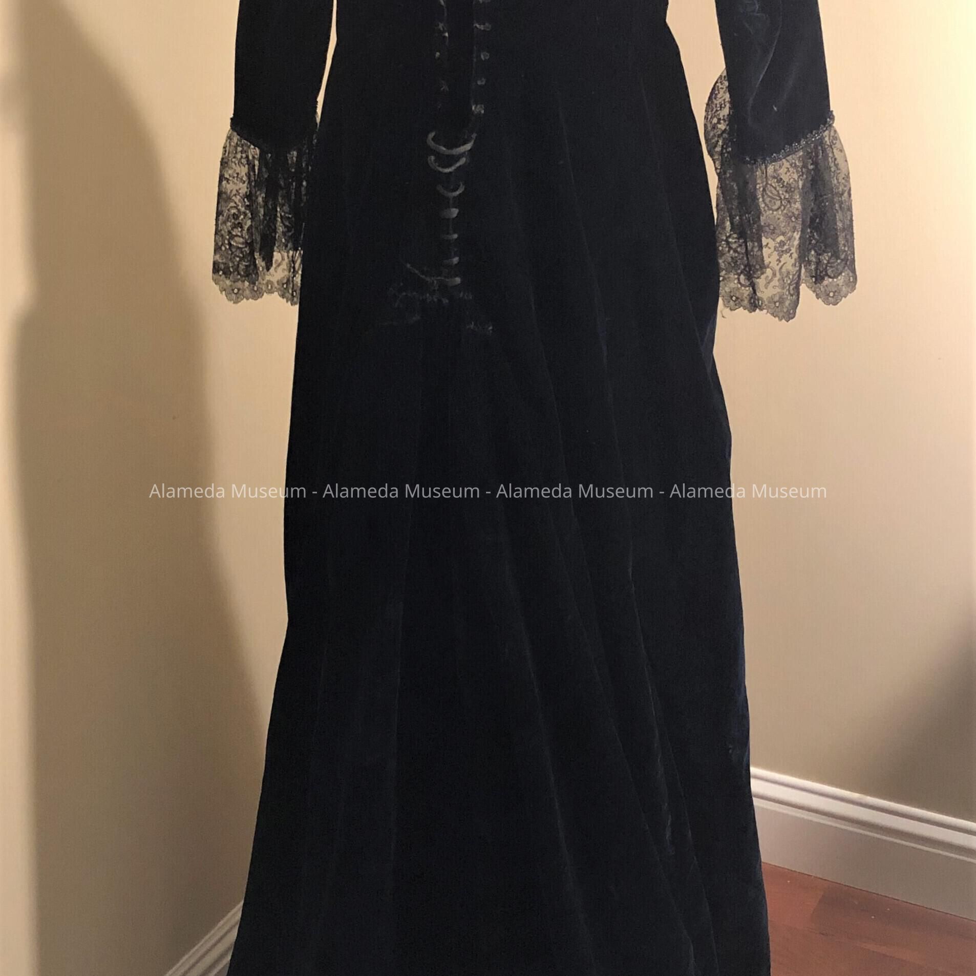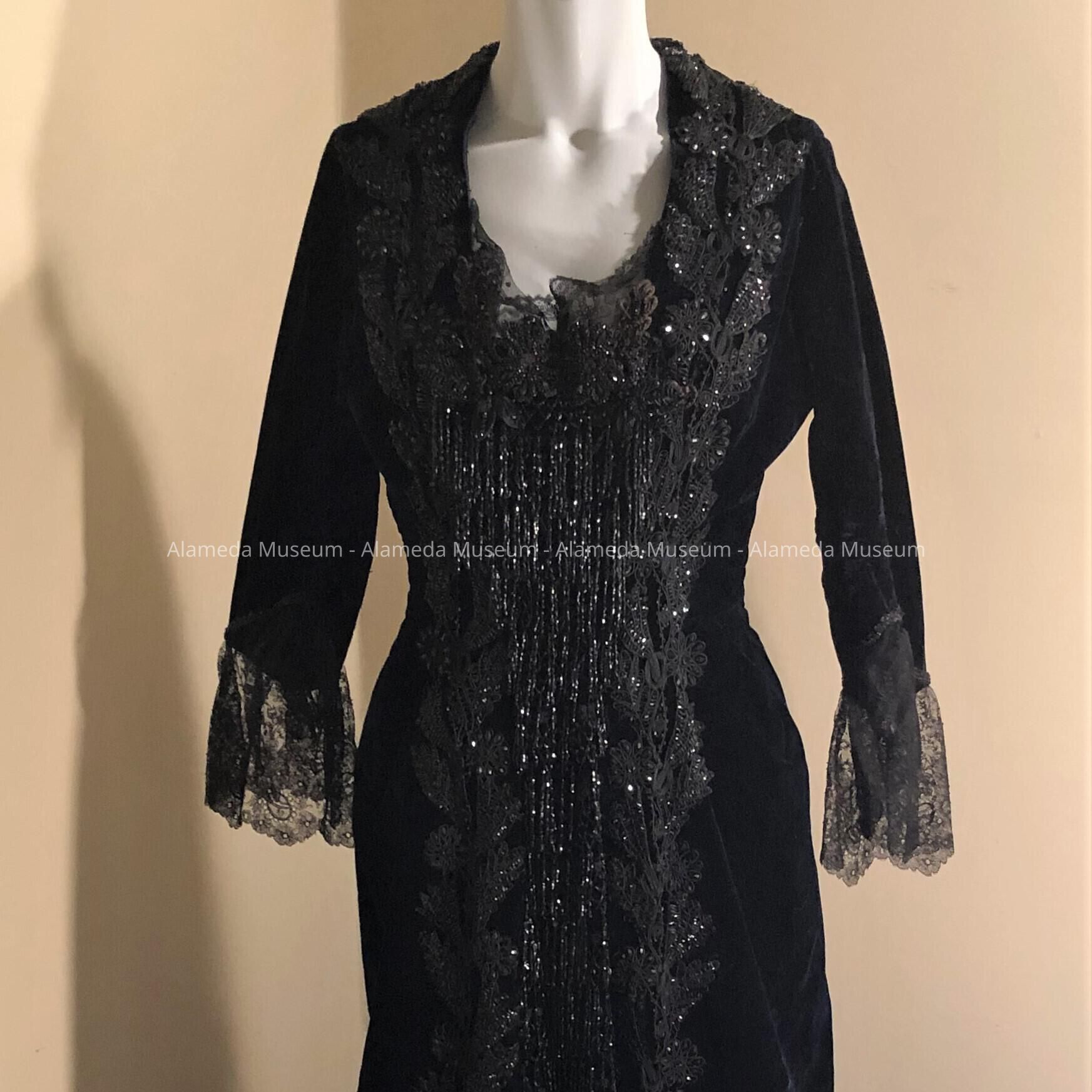 Description: A full length black gown of silk velvet with long sleeves, the ends are decorated with black chantilly lace trimmed with black jet beads. Beginning at the neck line and ending at the hem is an attached jet trim in the design of flowers and leaves. Starting at the bust line and ending at the hem is a panel of jet glass fringe. The back of the gown has a court train with an attached velvet ribbon so that the train can be lifted while walking. It is professionally made.