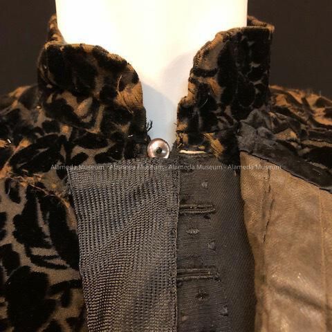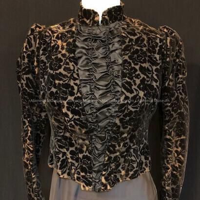 Form fitting blouse (or jacket) of black colored cut velvet (floral pattern) with gathered blank satin panel down front of bodice. Interior with iron stays. Missing skirt.