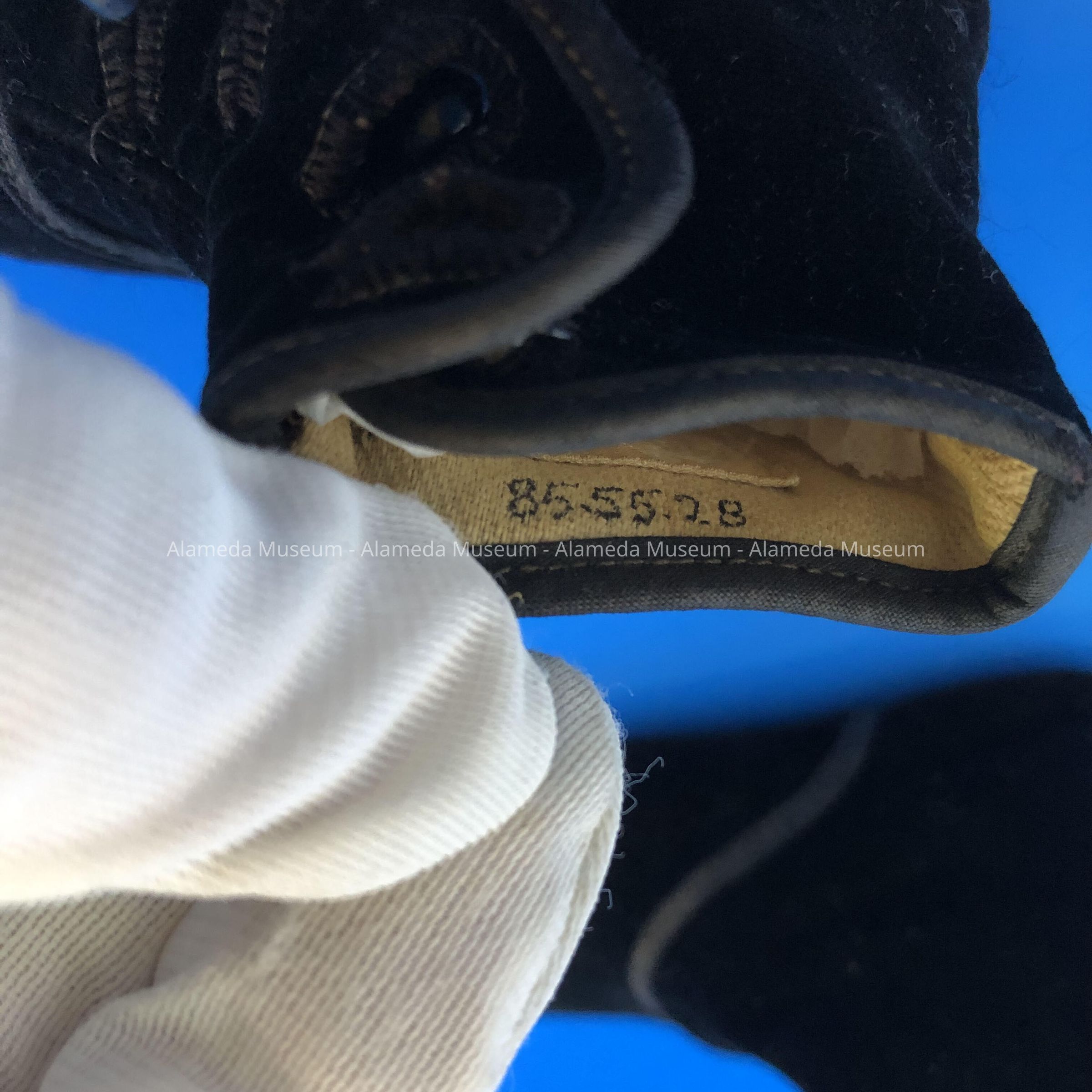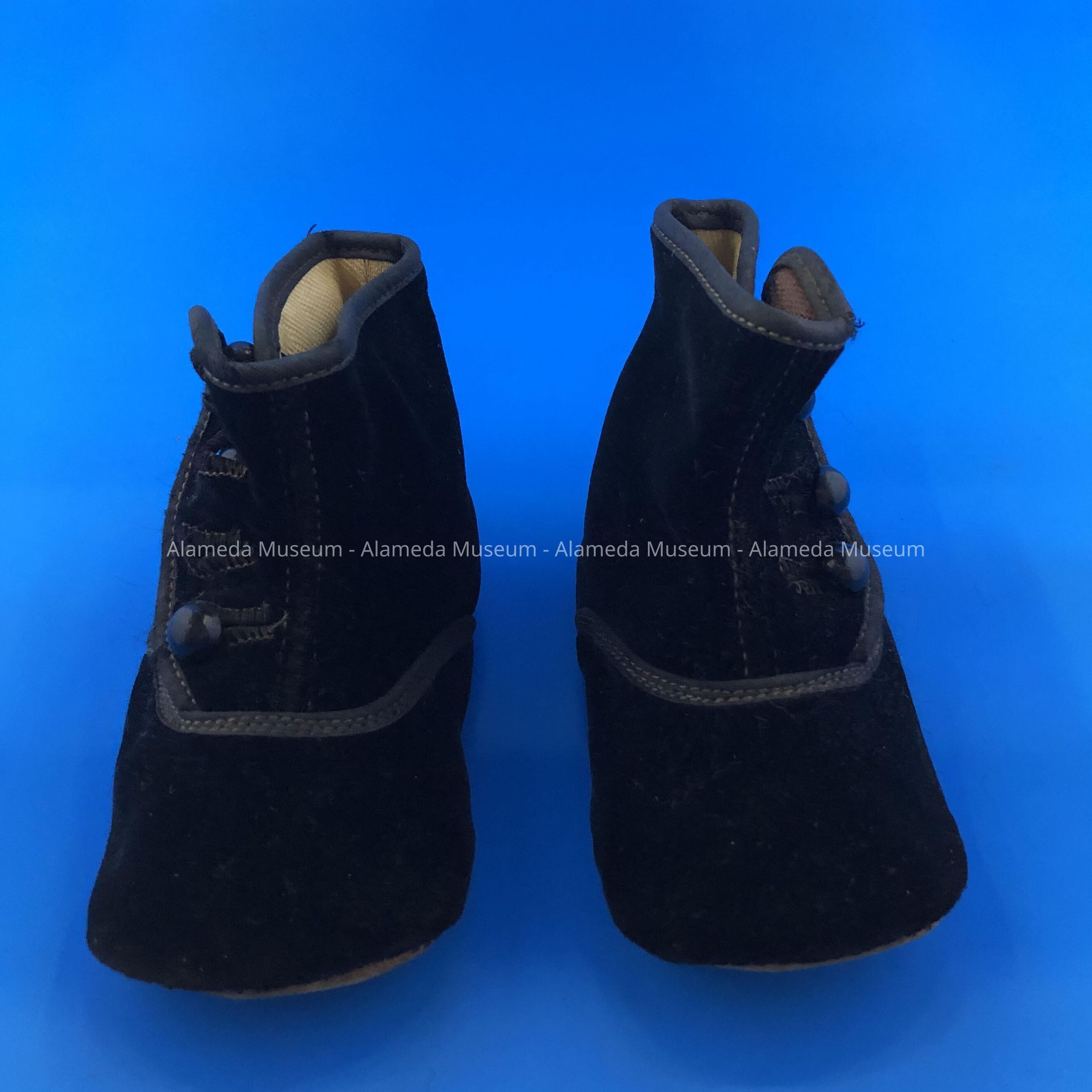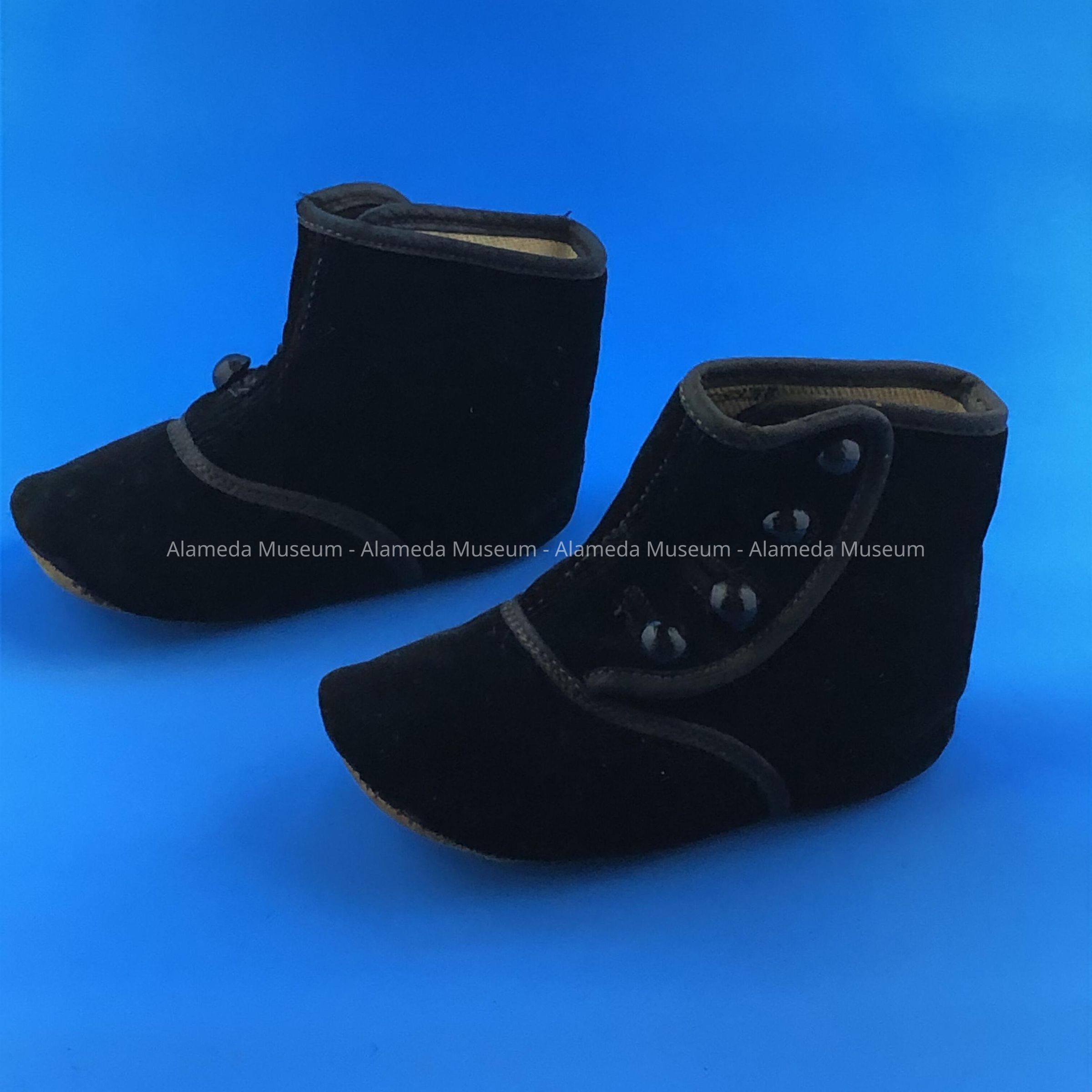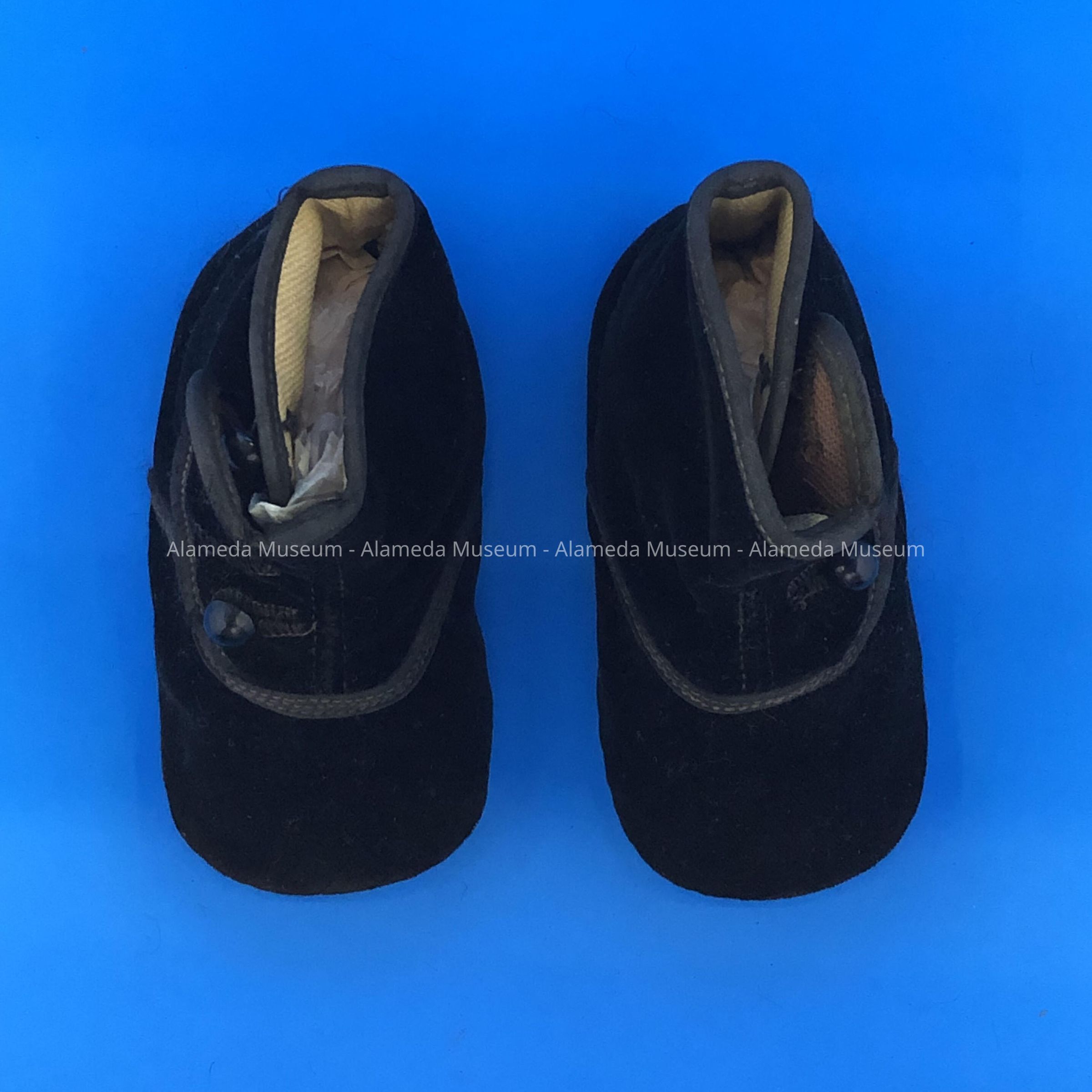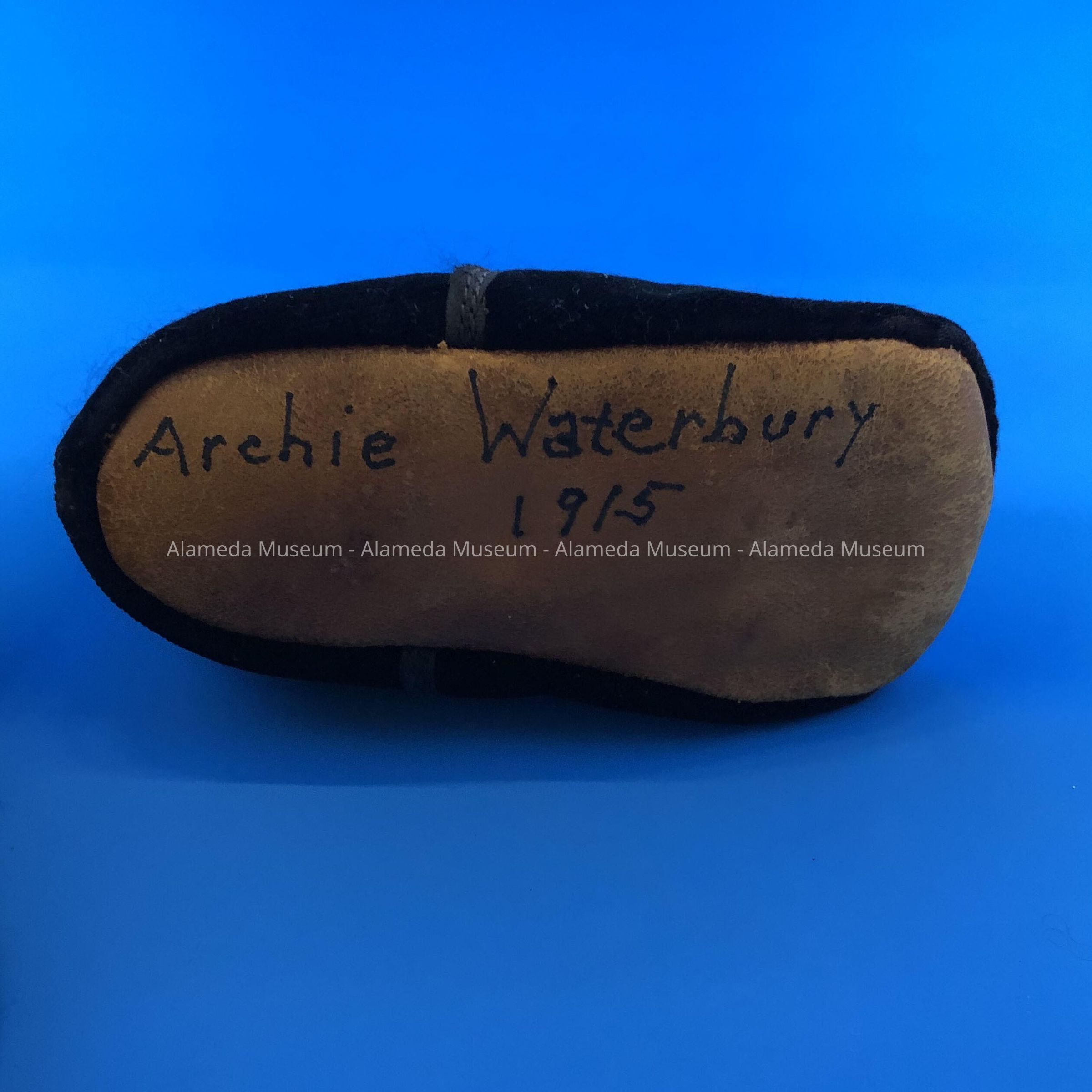 History of Object: Baby shoes of Archibald Waterbury, born Alameda, California (Mabel Tennant's Maternity Hospital-Chestnut Street), 1915. Mr. Waterbury became the Assistant Fire Chief for the City of Alameda.