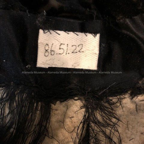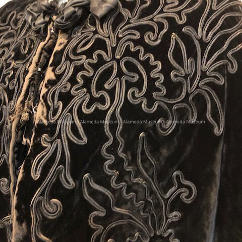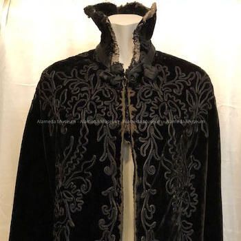 Description: Black Velvet short cape with stand-up collar, has soutache braid trim. Stand-up collar trimmed in caracal. Lined in black satin. Has original label "Armand Carlleau" Kearny St., San Francisco.