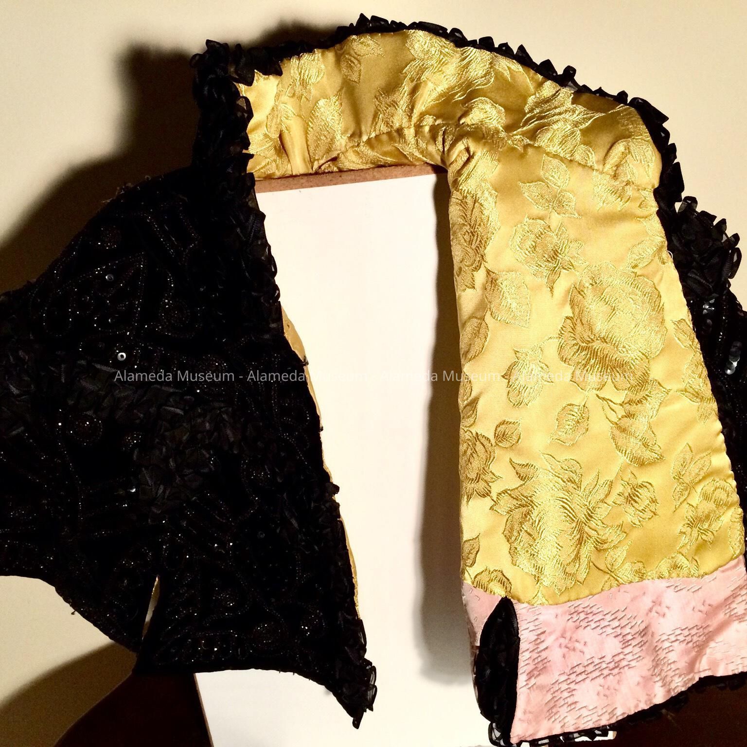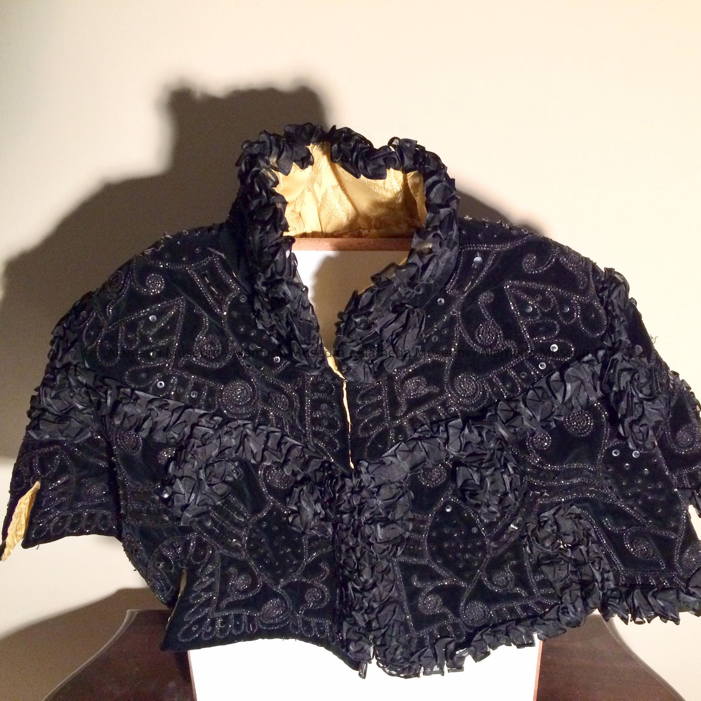 Description: Half cape of black velvet heavily trimmed with black sequins and jet beads and ribbon ruffle of chiffon. Interior relined in gold silk brocade. Original label stating "The White House-San Francisco."